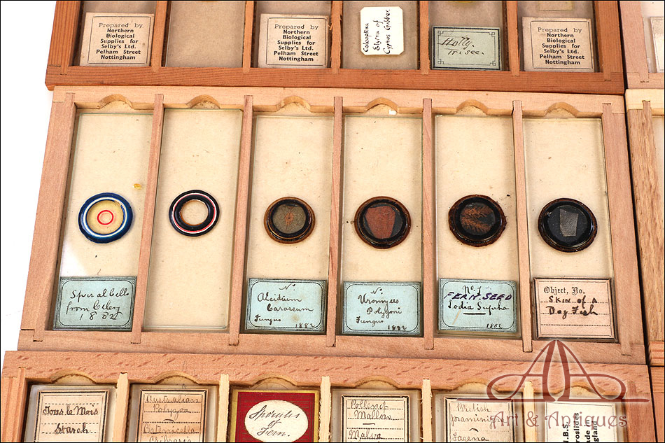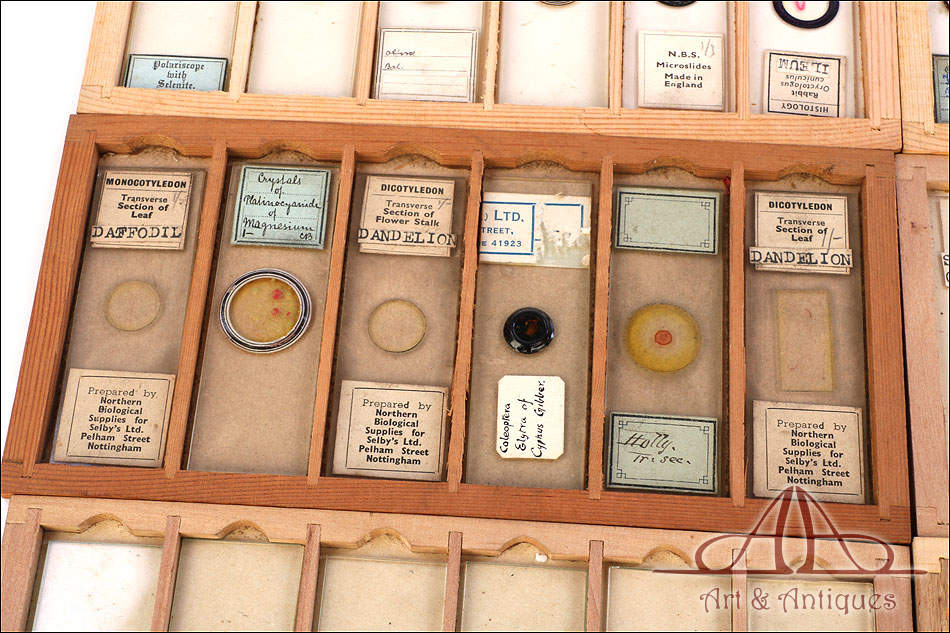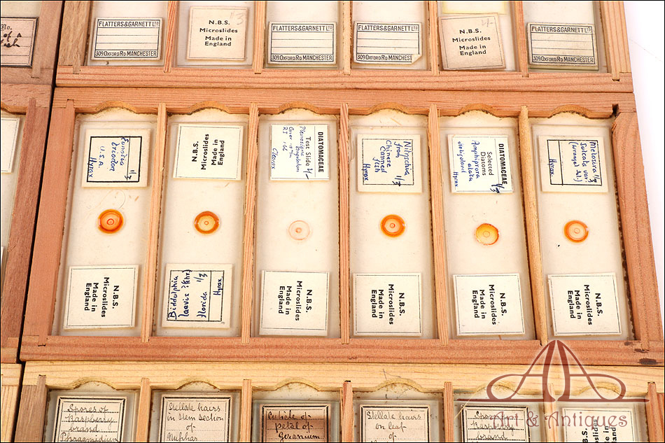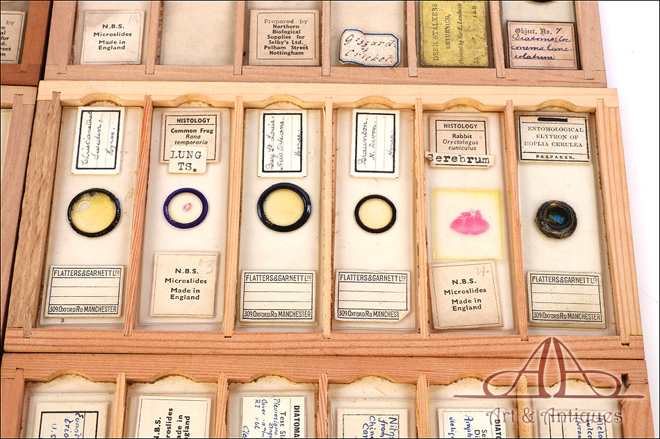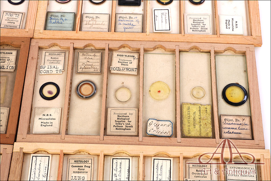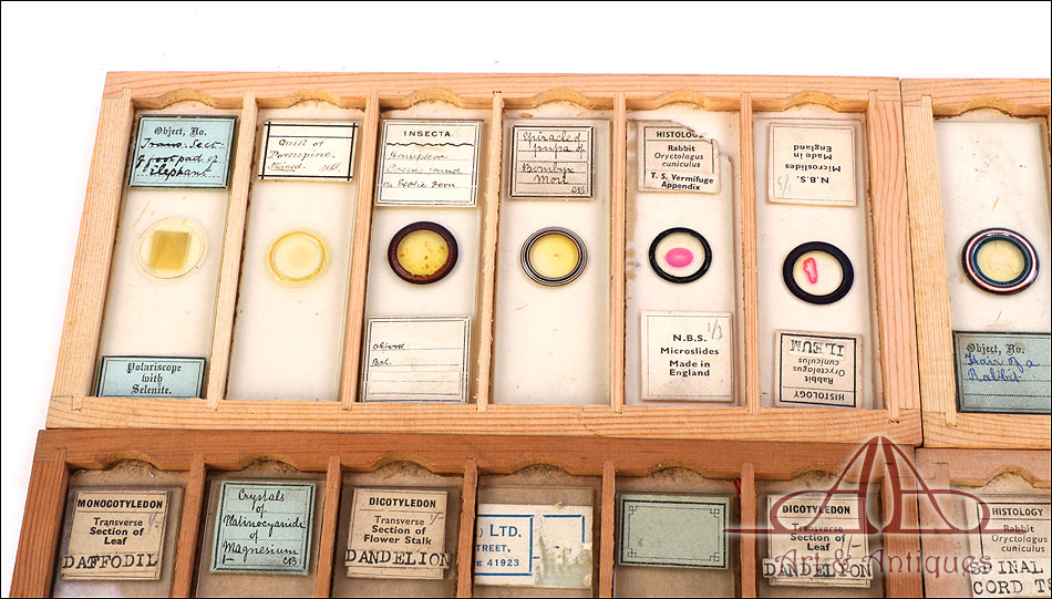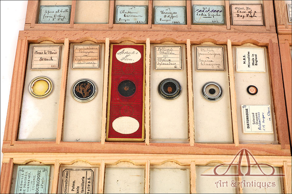 Colección de 60 preparados antiguos para microscopio, procedentes de Inglaterra y realizados entre 1880 y 1930. Los preparados se presentan en su estuche de madera original, con distintas bandejas extraíbles y muy bien conservado. Están datados en distintos años, cubriendo una época que se extiende entre la penúltima década del siglo XIX y los años 30 del siglo XX. Los preparados llevan distintas materias orgánicas: plantas, insectos, polen, muestras de animales (ranas, conejos…)… Se encuentran en muy buen estado y llevan etiquetas manuscritas o mecanografiadas, todas ellas en inglés y latín y perfectamente legibles. La cantidad y variedad de muestras garantiza horas de entretenimiento en su visualización con un microscopio. El estuche de madera lleva en su interior una etiqueta con el nombre de la tienda inglesa donde se adquirió. El estuche es de epoca posterior.