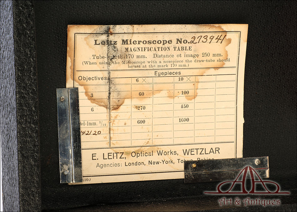 Todas las piezas y componentes funcionan muy bien, desde la cremallera hasta el ajuste fino. La pletina incluye sistema mecánico de ajuste micrométrico para desplazar las muestras. En la parte posterior del microscopio podemos ver el nombre E. LEITZ WETZLAR grabado en el metal, nombre que se repite en la torre junto con el número de serie Nº 273941. Las lentes y los oculares también están firmados por el fabricante. El set incluye una ampolla de aceite para el mantenimiento del objetivo de inmersión en aceite. El maletín de guardado está muy bien conservado: en la tapa hay una etiqueta con el nombre del dueño original del microscopio, médico y cirujano. En el interior se conserva la hoja con las especificaciones de fábrica, donde aparece el número de serie del microscopio escrito a mano.