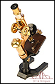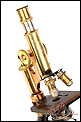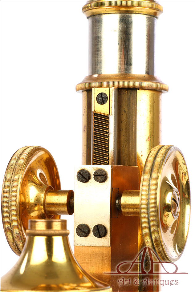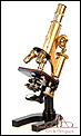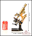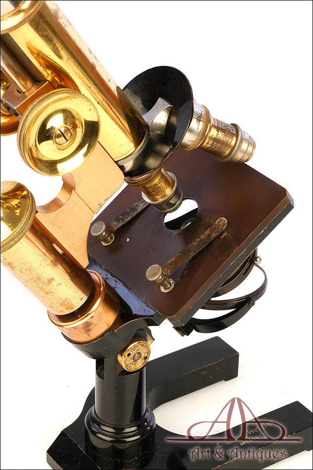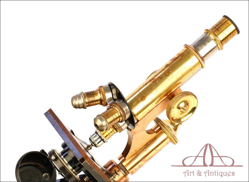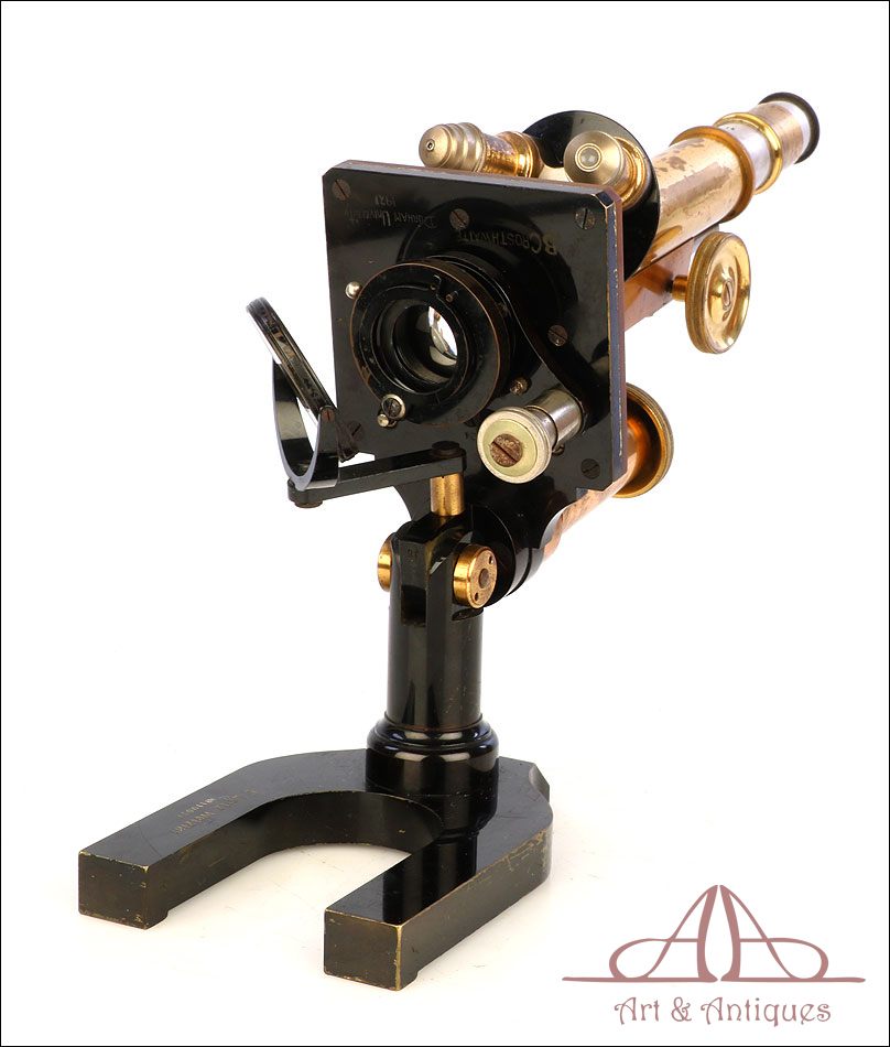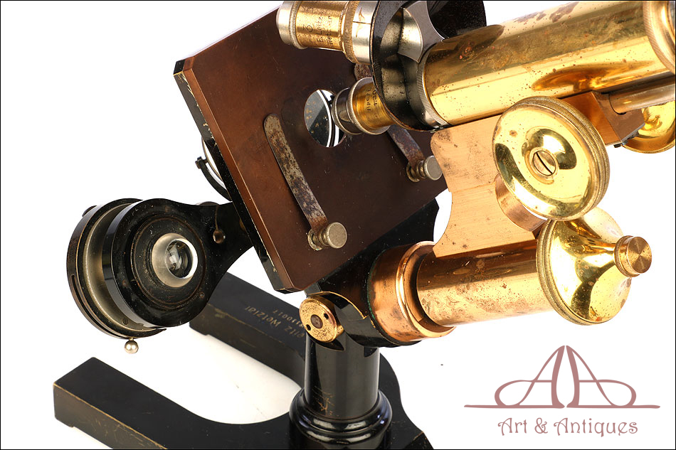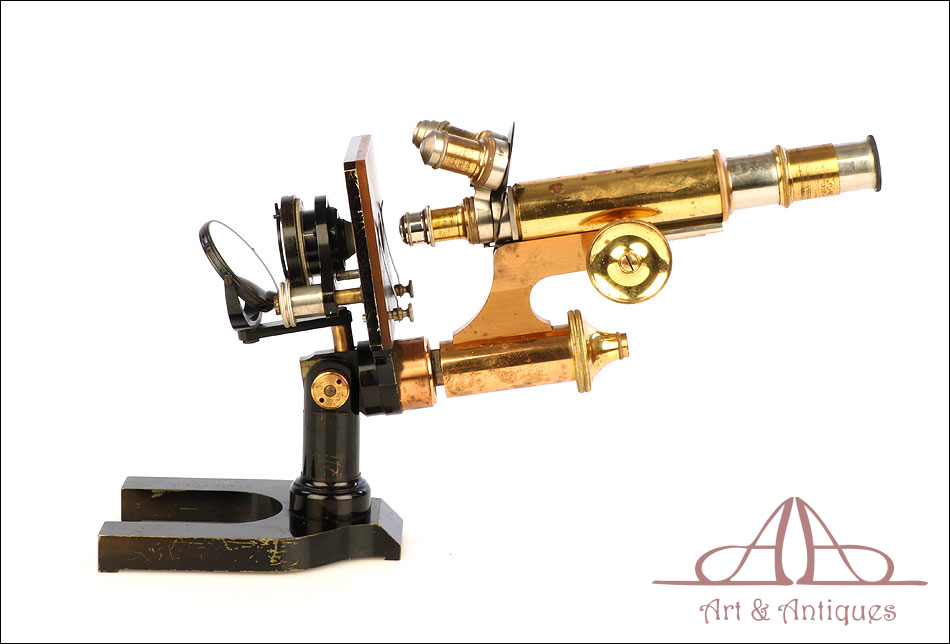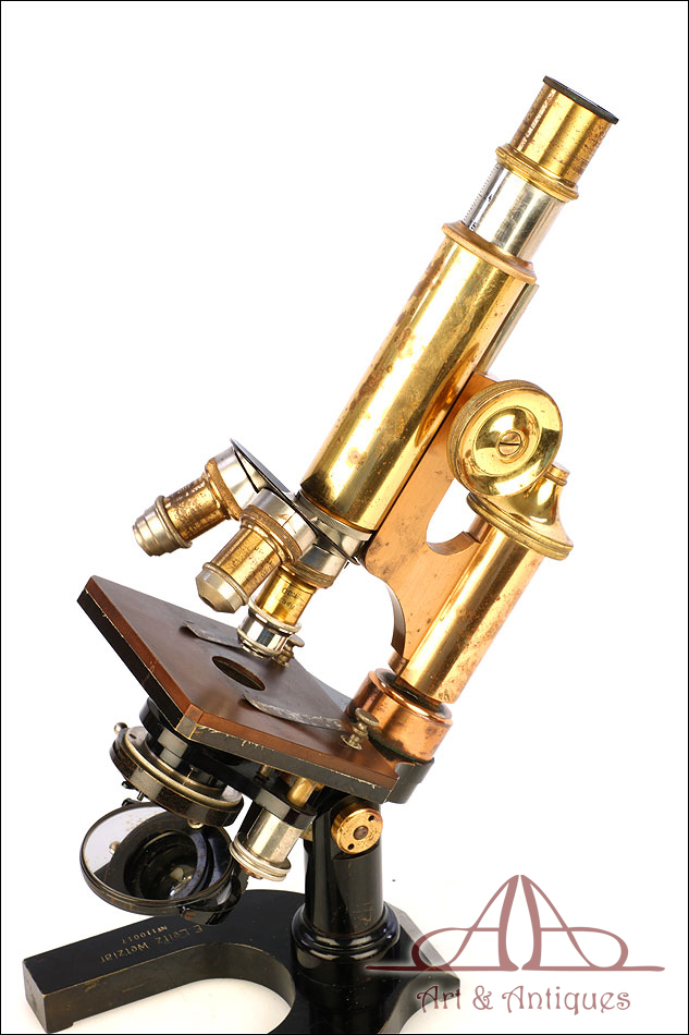 Antiguo microscopio Ernst Leitz Wetzlar fabricado en Alemania en 1908, con juego de accesorios del fabricante y estuche original de caoba. El microscopio está completo y en excelente estado de funcionamiento: tanto la cremallera como el sistema de ajuste fino se mueven con fluidez, permitiendo observar las muestras y preparados con un enfoque adecuado. Lleva revólver de tres lentes, pie de herradura en metal esmaltado en negro y parte superior de latón. El latón está protegido por la laca transparente original y está en muy buen estado, con los lógicos signos del paso del tiempo y del uso que tanta personalidad aportan a las antigüedades originales.