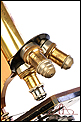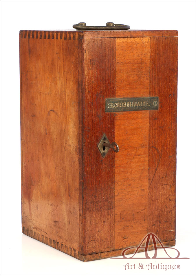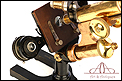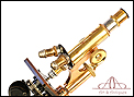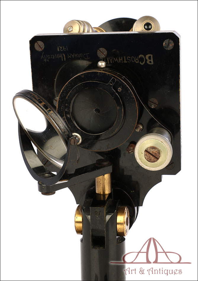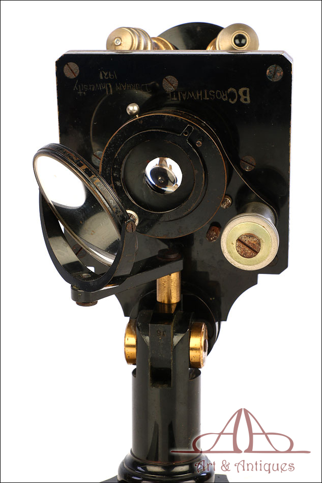 El juego de accesorios que acompaña al microscopio está formado por tres objetivos y dos oculares. Los objetivos llevan el nombre del fabricante grabado en el cuerpo de latón y en las fundas de guardado. El nombre E. Leitz Wetzlar se puede ver también en el pie de herradura, grabado en el esmalte junto con el número de serie Nº 110017. Además, si miramos bajo la pletina para las muestras encontraremos una inscripción toscamente grabada a mano: B. CROSSTHWAITE – DURHAM UNIVERSITY 1921. El nombre aparece también en la placa de metal fijada a la tapa del estuche. Gracias a este detalle podemos deducir que el microscopio fue propiedad de un profesor que trabajó ese año en la universidad inglesa. En el interior de la caja hay una hoja de especificaciones con el número de serie del microscopio y el inventario de accesorios escritos a mano.