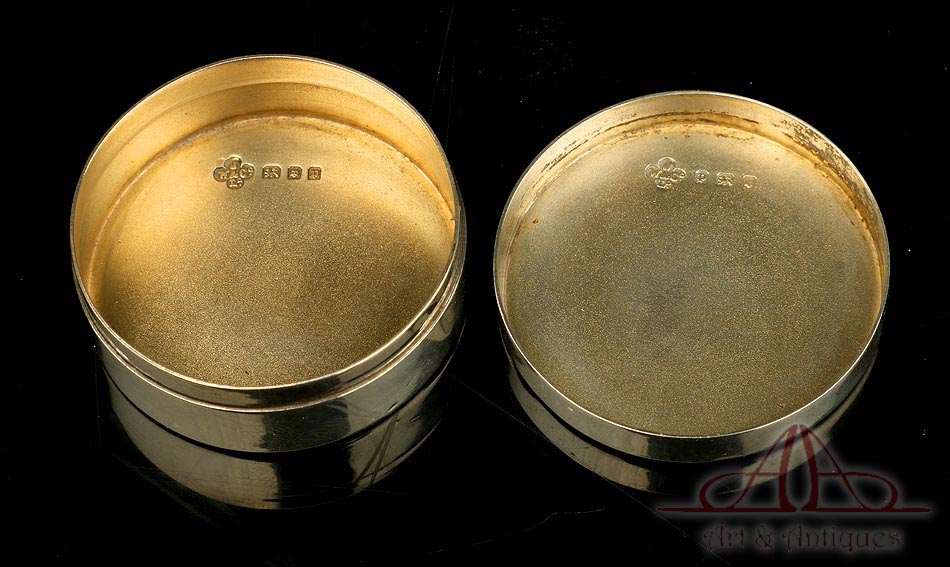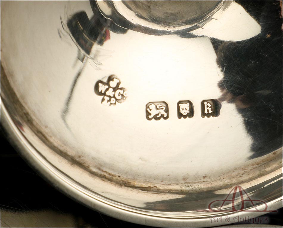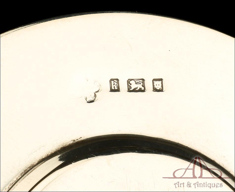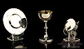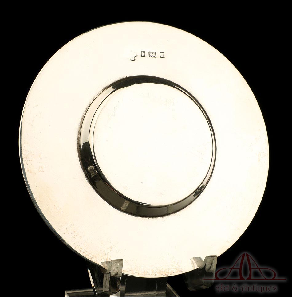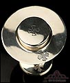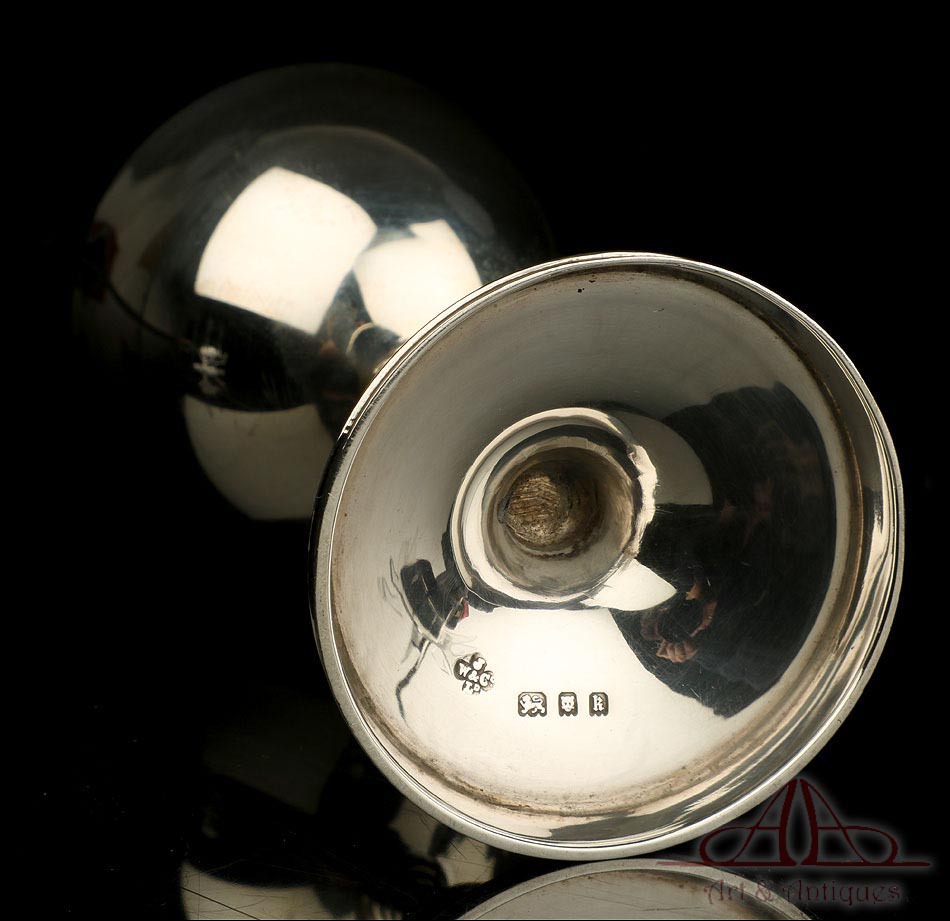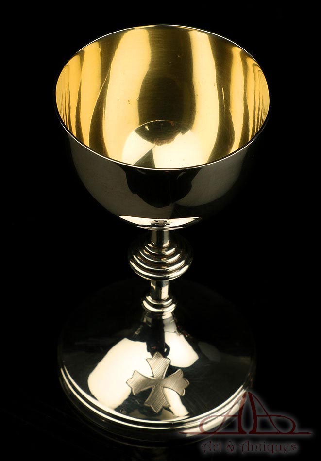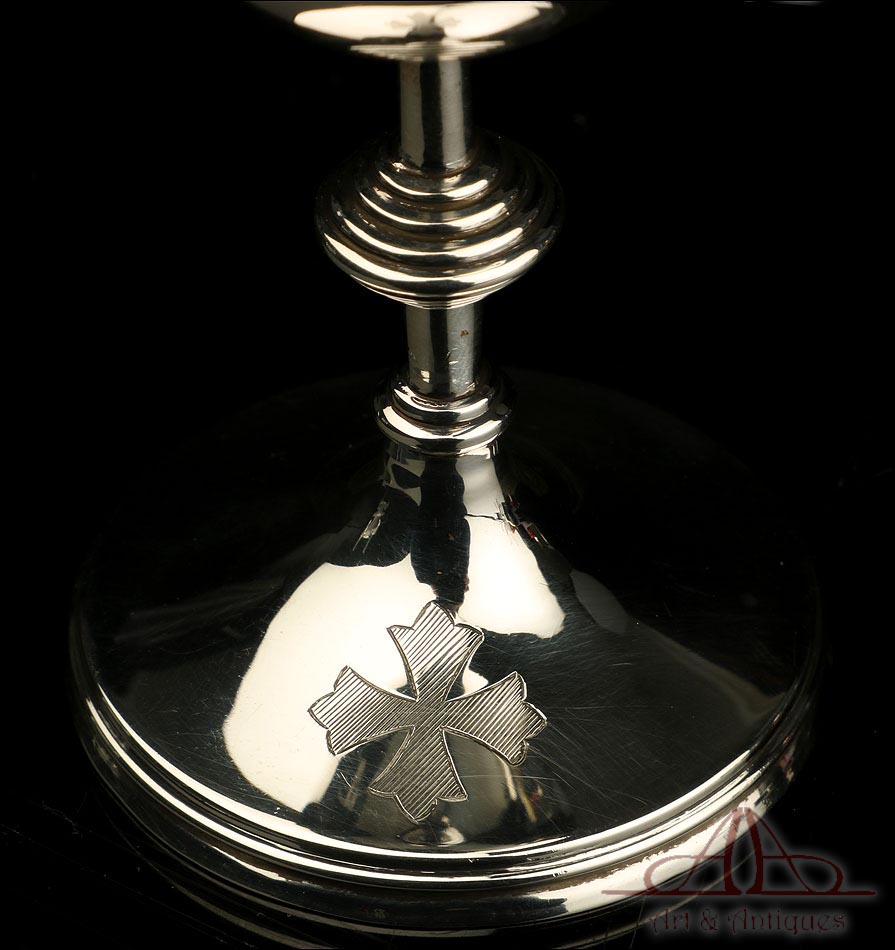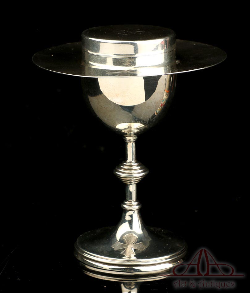 Raro y antiguo cáliz de plata maciza de viaje con patena y porta-hostias, fabricado en Inglaterra en 1925. Se trata de un conjunto para viaje de pequeño tamaño, formado por tres piezas que se pueden encajar unas en las otras para transportarlas con mayor facilidad. El cáliz va acompañado de su patena y de una pequeña caja redonda de plata destinada a guardar las hostias para la celebración de la eucaristía. El cáliz muestra un diseño muy sencillo y elegante: es de plata lisa, y como único adorno lleva una cruz griega grabada en el pie circular. La patena sigue el mismo diseño, mientras que la cruz que adorna el porta-hostias es del mismo estilo pero ligeramente distinta. Todas las piezas llevan varios contrastes: podemos ver un total de cuatro sellos, incluyendo una cruz con las iniciales del orfebre, un león rampante (que identifica la plata esterlina inglesa), la cabeza de un leopardo (que corresponde a la ciudad de Londres) y una letra K, correspondiente al año de fabricación.