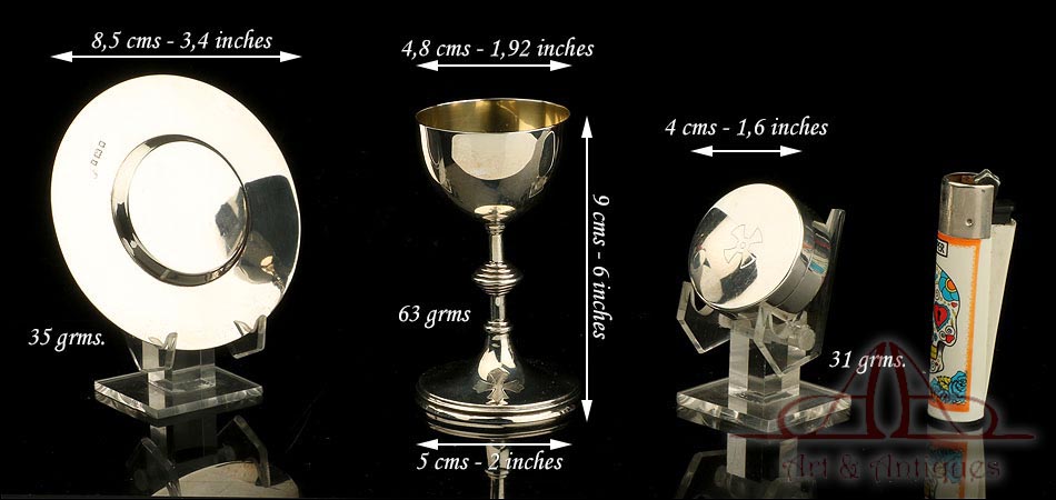 Medidas: Cáliz: Ancho del Pie: 5 cm. Ancho de la Copa: 4,8 cm. Altura: 9 cm. Peso: 63 g. Patena: Diámetro: 8,5 cm. Peso: 35 g. Porta-Hostias: Diámetro: 4 cm. Peso: 31 g.