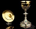 El tallo está adornado por un nudo de diseño medieval, con forma circular y adornado por varias turquesas similares a las del pie. En la parte superior podemos ver la base de filigrana que soporta la copa, rematada también por varias turquesas originales. En las distintas partes del cáliz encontramos los contrastes que marcan las piezas de plata francesa antigua, así como el correspondiente al orfebre que lo realizó, Adrien Brigaud. La patena de plata dorada está decorada con una cruz latina y las letras griegas alfa y omega grabadas a mano (símbolo de Jesucristo como principio y final de todas las cosas). En esta pieza también aparecen los contrastes de la plata y del orfebre que encontramos en el cáliz.