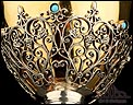 Este antiguo cáliz de plata maciza con turquesas y esmaltes es una pieza impresionante, de magnífica belleza y poderosa personalidad.