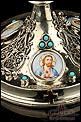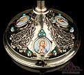 El pie o base del cáliz tiene forma cónica y muestra una decoración muy trabajada, sumamente atractiva. Está cubierto por la filigrana de plata que comentábamos más arriba; la filigrana rodea tres esmaltes circulares a todo color que representan imágenes de la Virgen María, Jesús y San José. Los esmaltes están en muy buenas condiciones y destacan por su fantástica hechura: los rostros aparecen relajados y armoniosos, los colores son muy delicados y las proporciones de las figuras son perfectas. A su alrededor podemos ver varias piedras de color turquesa engastadas en la filigrana. Bajo la imagen de Jesús hay también una cruz de plata dorada.