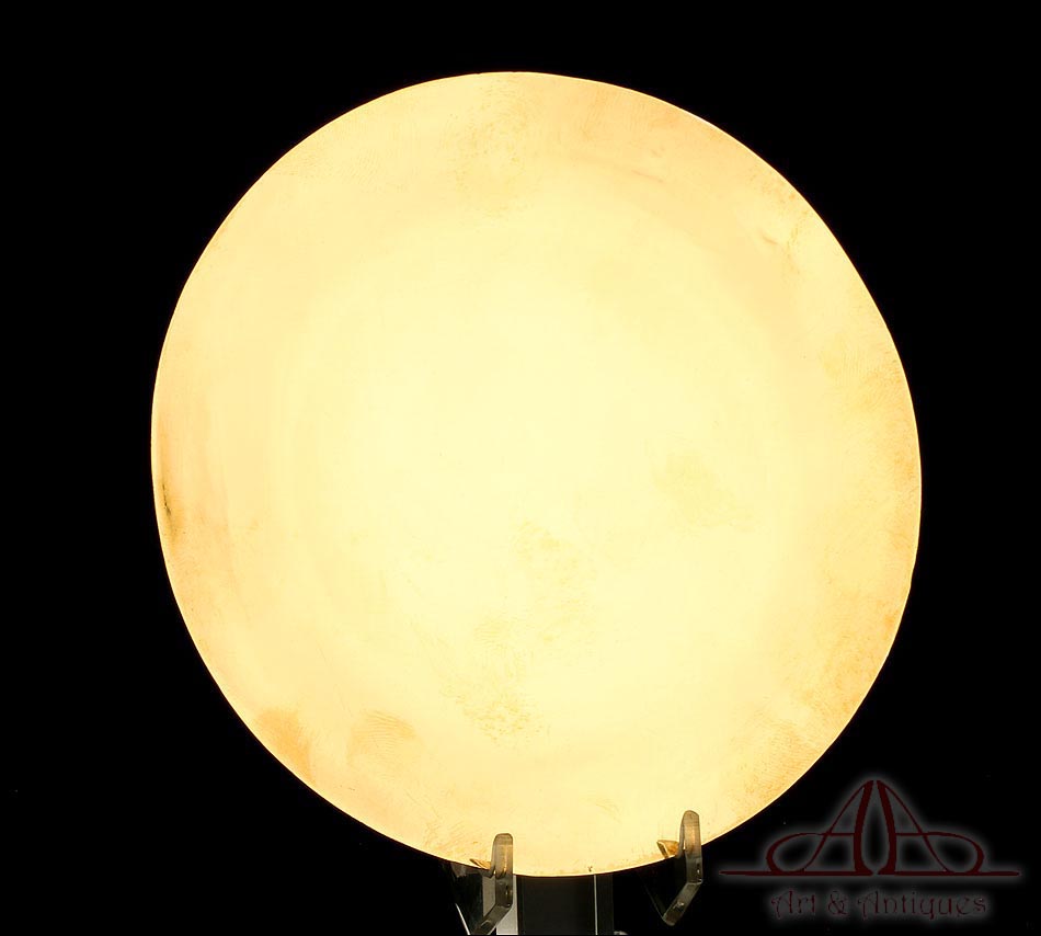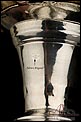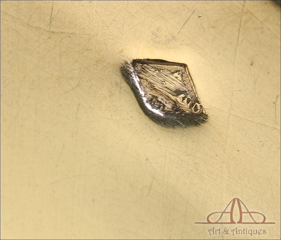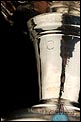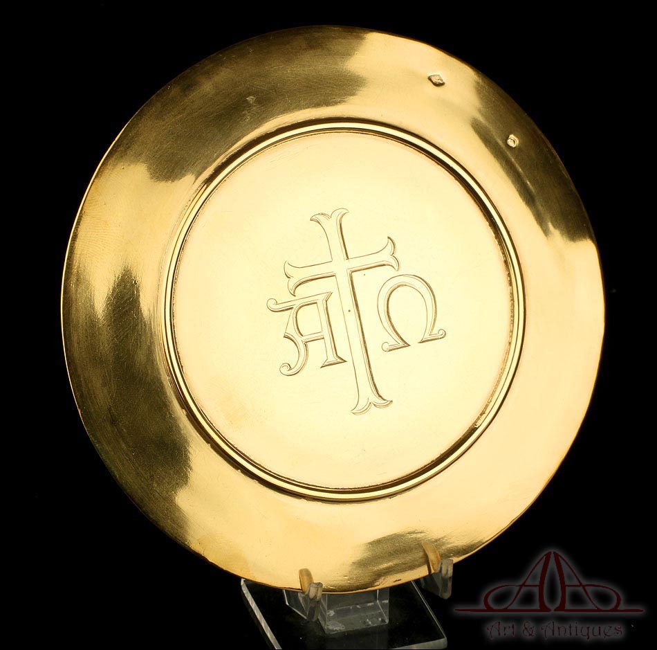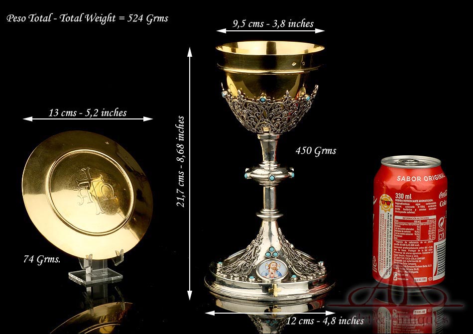 Medidas: Cáliz: Ancho de la Base: 12 cm. Ancho de la Copa: 9,5 cm. Altura: 21,7 cm. Peso: 450 g. Patena: Diámetro: 13 cm. Peso: 74 g. Peso Total: 524 g.