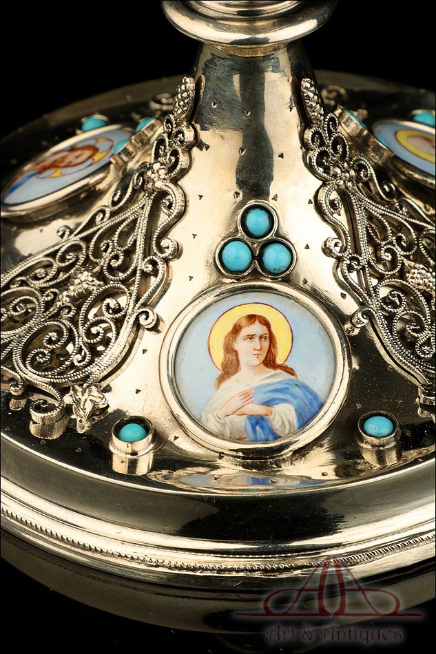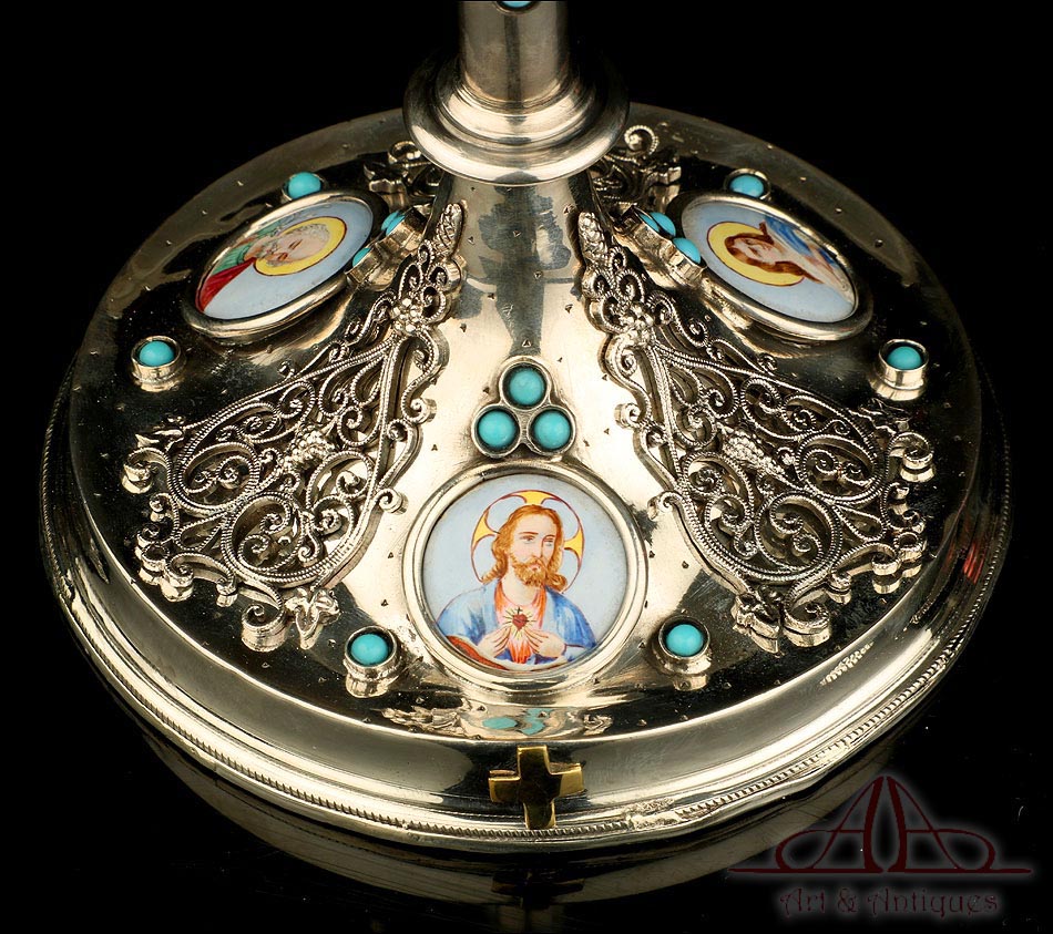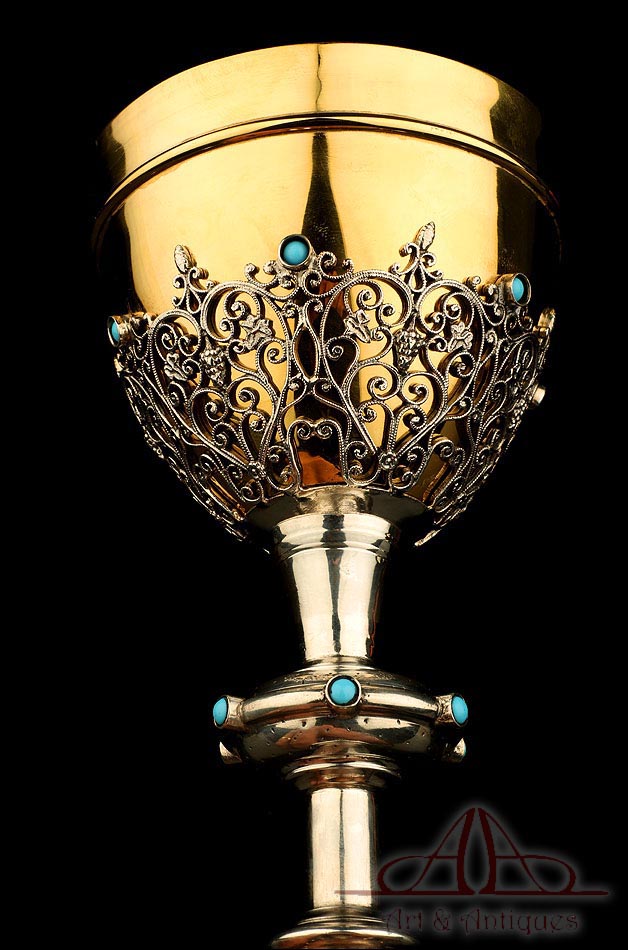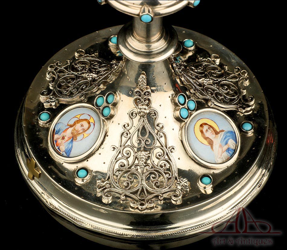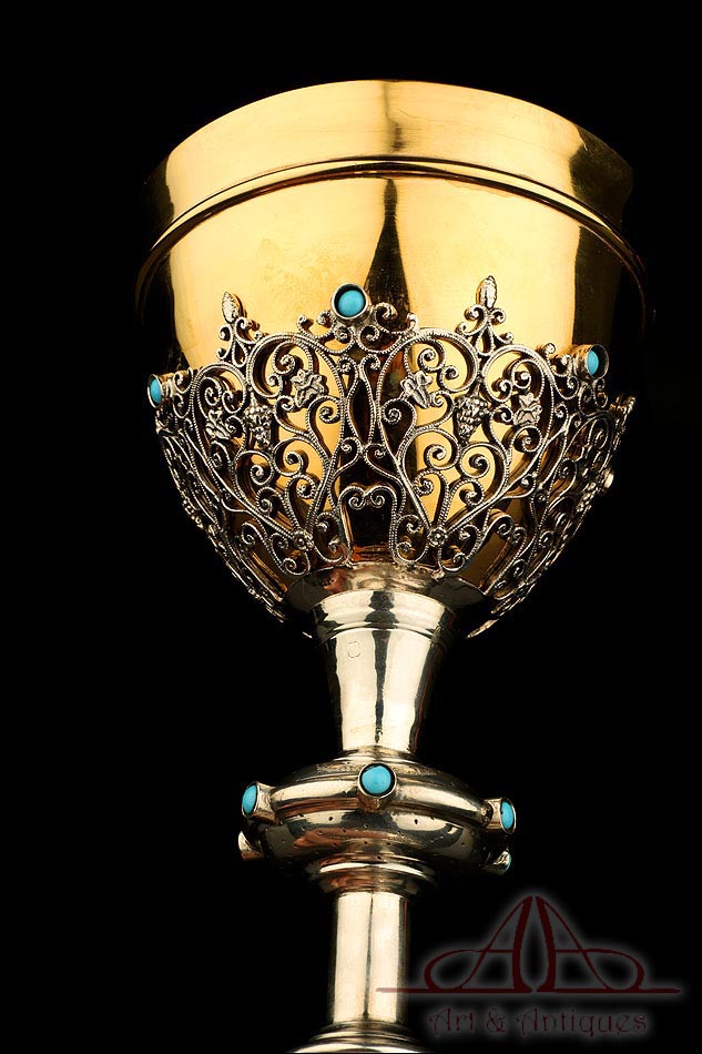 Espectacular y antiguo cáliz de plata maciza con turquesas y esmaltes, realizado en Francia en el siglo XIX y de soberbia belleza. El cáliz va acompañado de una patena antigua y se encuentra en impresionante estado de conservación. Ha sido completamente restaurado, por lo que a día de hoy está listo para su uso o para ser mostrado en una colección. El pie y el tallo son de plata lisa, mientras que la copa y la patena son de plata dorada. En la base de la copa podemos ver una bellísima filigrana de plata que se repite en el pie del cáliz, creando un conjunto equilibrado de gran potencial decorativo.