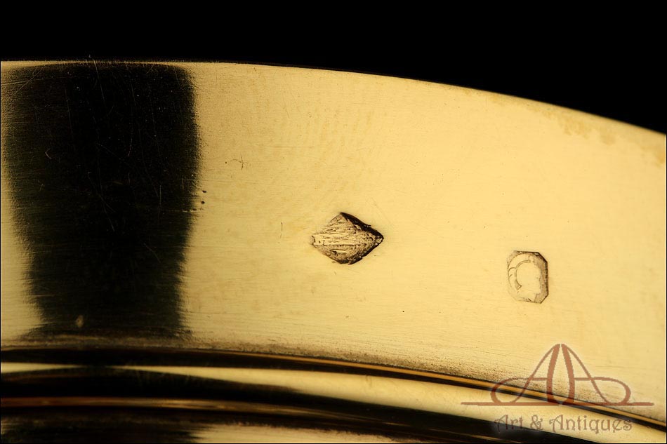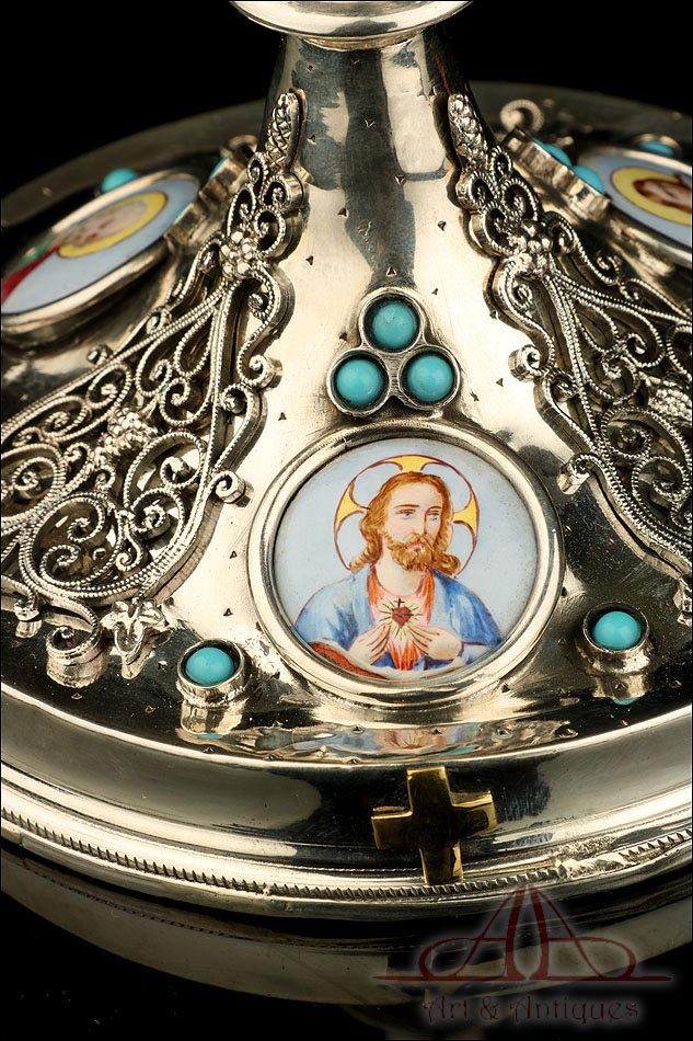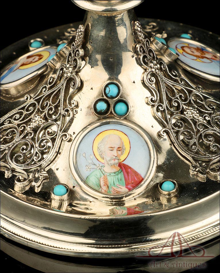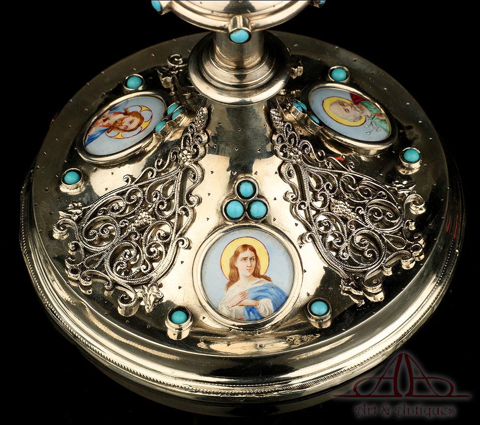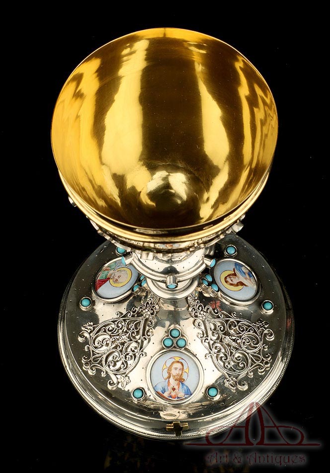Espectacular y antiguo cáliz de plata maciza con turquesas y esmaltes, realizado en Francia en el siglo XIX y de soberbia belleza. El cáliz va acompañado de una patena antigua y se encuentra en impresionante estado de conservación. Ha sido completamente restaurado, por lo que a día de hoy está listo para su uso o para ser mostrado en una colección. El pie y el tallo son de plata lisa, mientras que la copa y la patena son de plata dorada. En la base de la copa podemos ver una bellísima filigrana de plata que se repite en el pie del cáliz, creando un conjunto equilibrado de gran potencial decorativo.