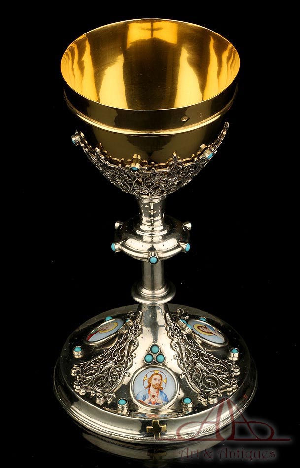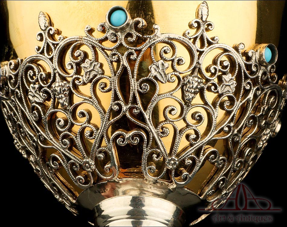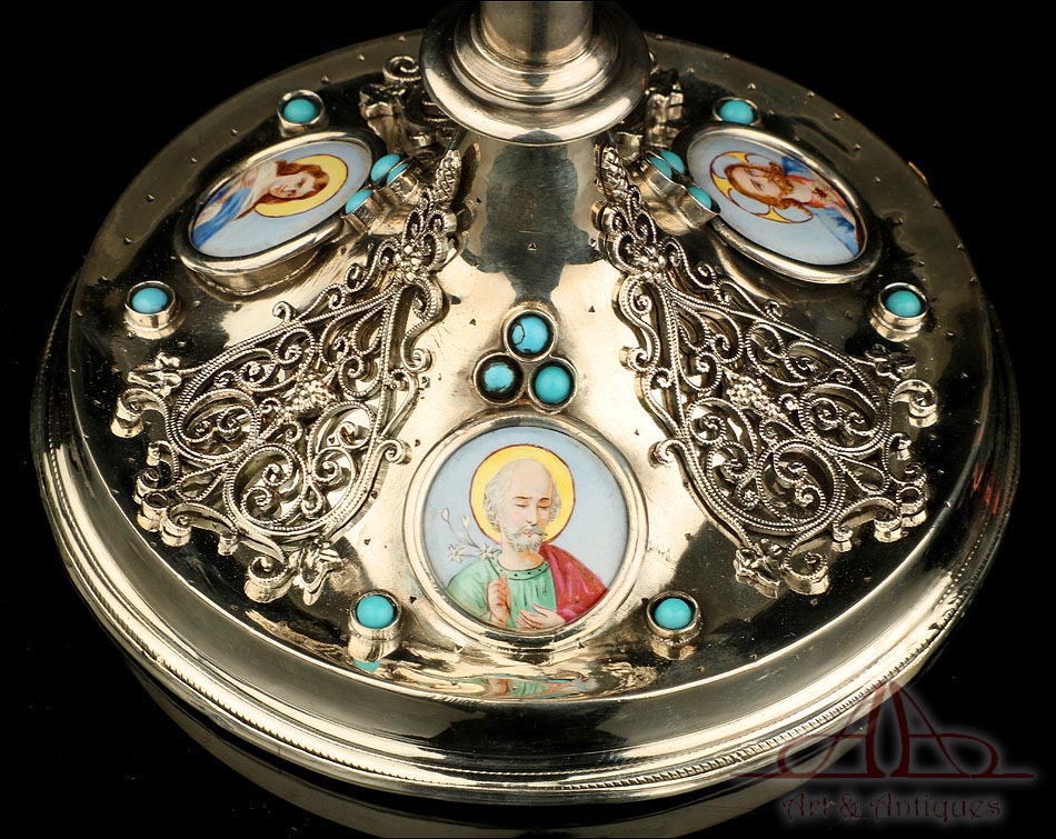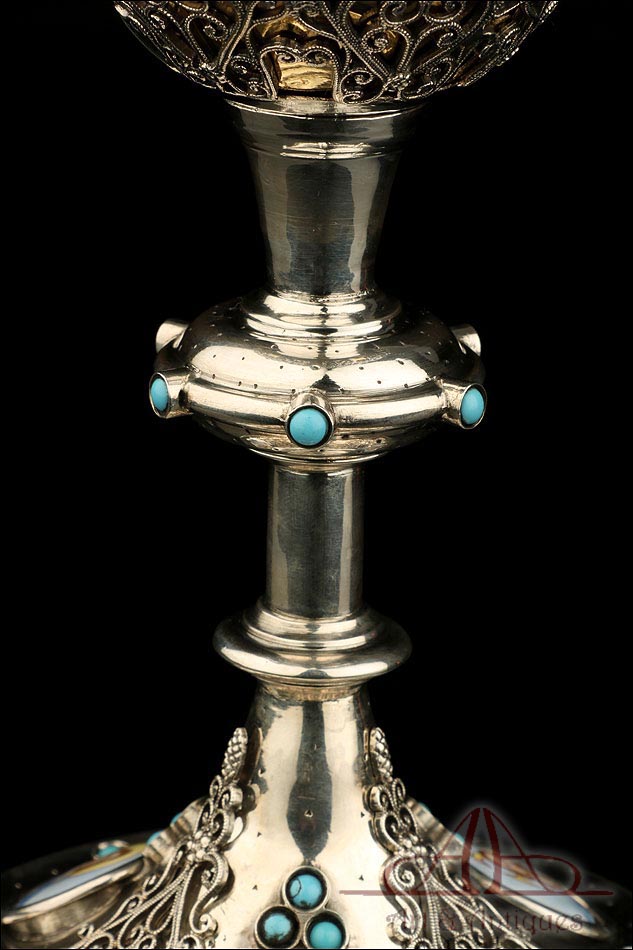 Antiguo Cáliz de Plata Maciza con Turquesas y Esmaltes. Francia, Siglo XIX |