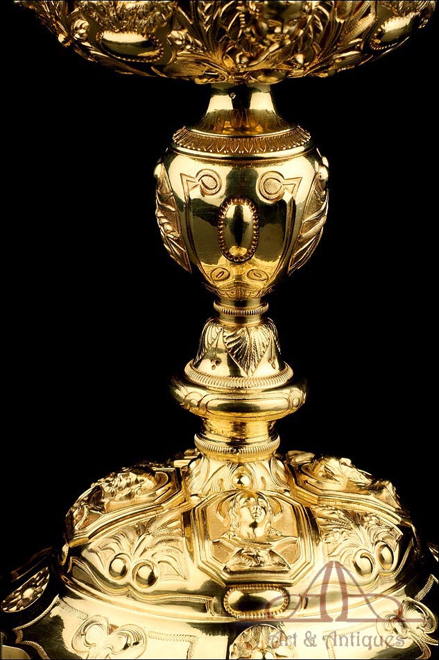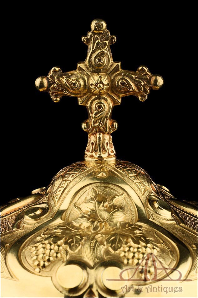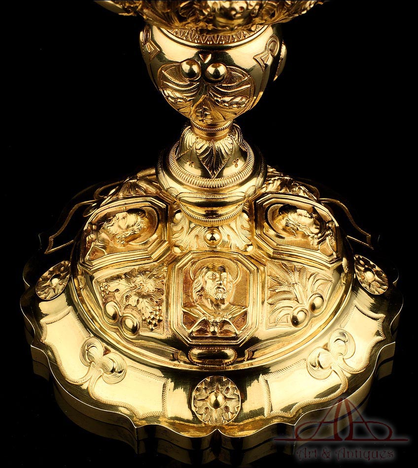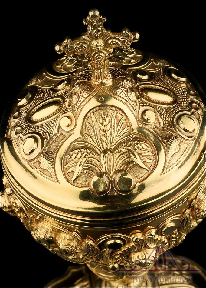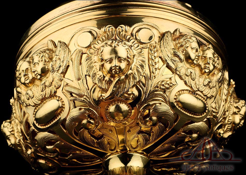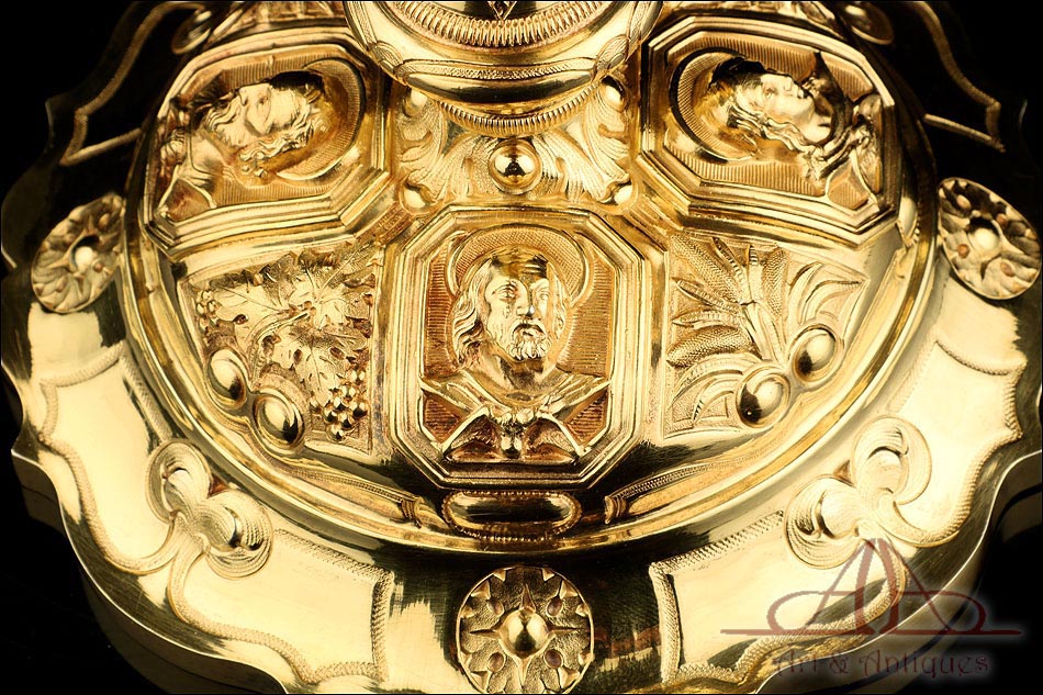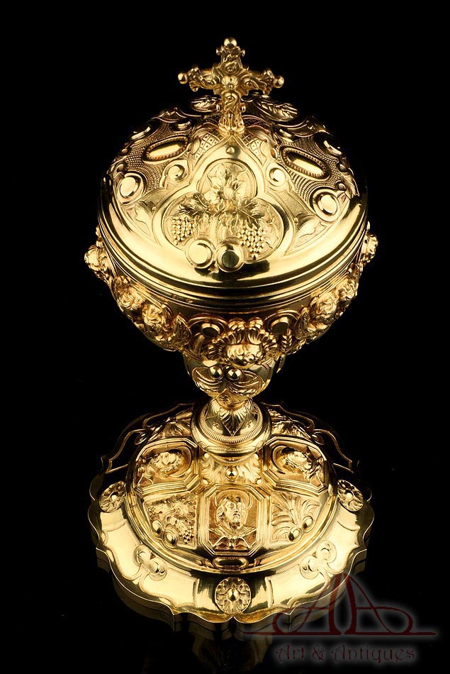 Espectacular copón antiguo en plata maciza dorada, fabricado en Francia en el siglo XIX y con una preciosa decoración cubriendo toda su superficie. Este artículo está realizado íntegramente en plata de calidad, lo que queda confirmado por la presencia de contrastes en todas sus partes: base, copa y tapa. El acabado dorado está en muy buenas condiciones. Llama la atención la compleja decoración que adorna esta pieza, formada por varias imágenes religiosas, símbolos litúrgicos y relieves de estilo clásico.