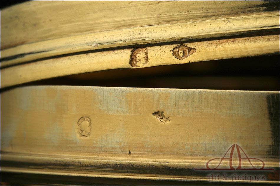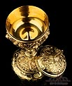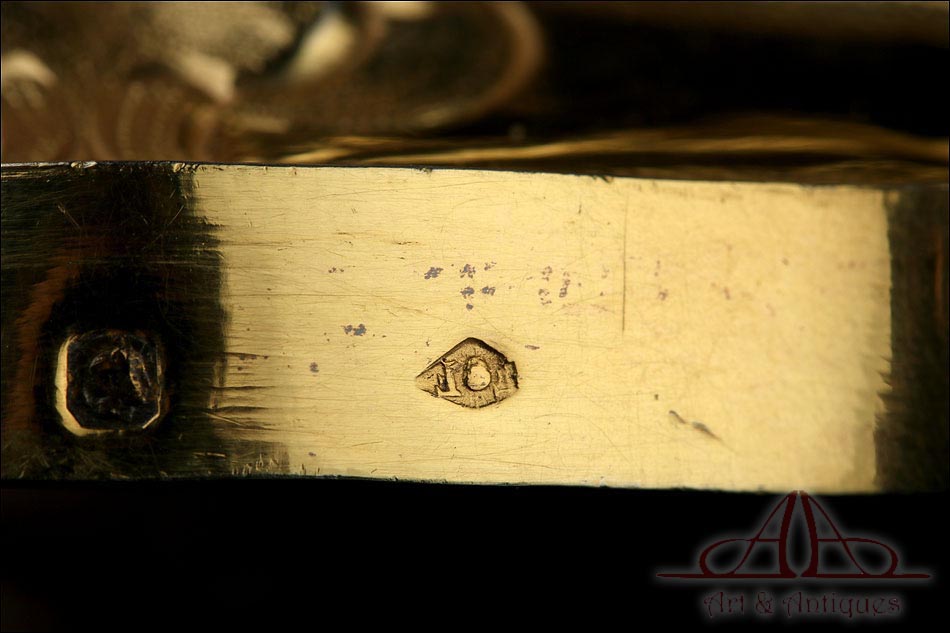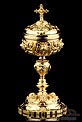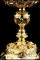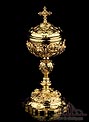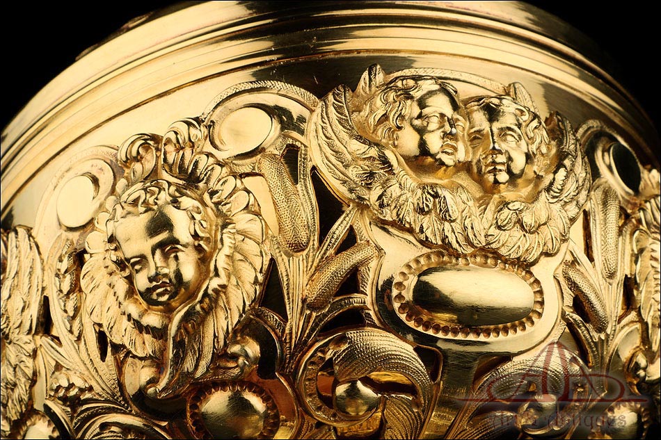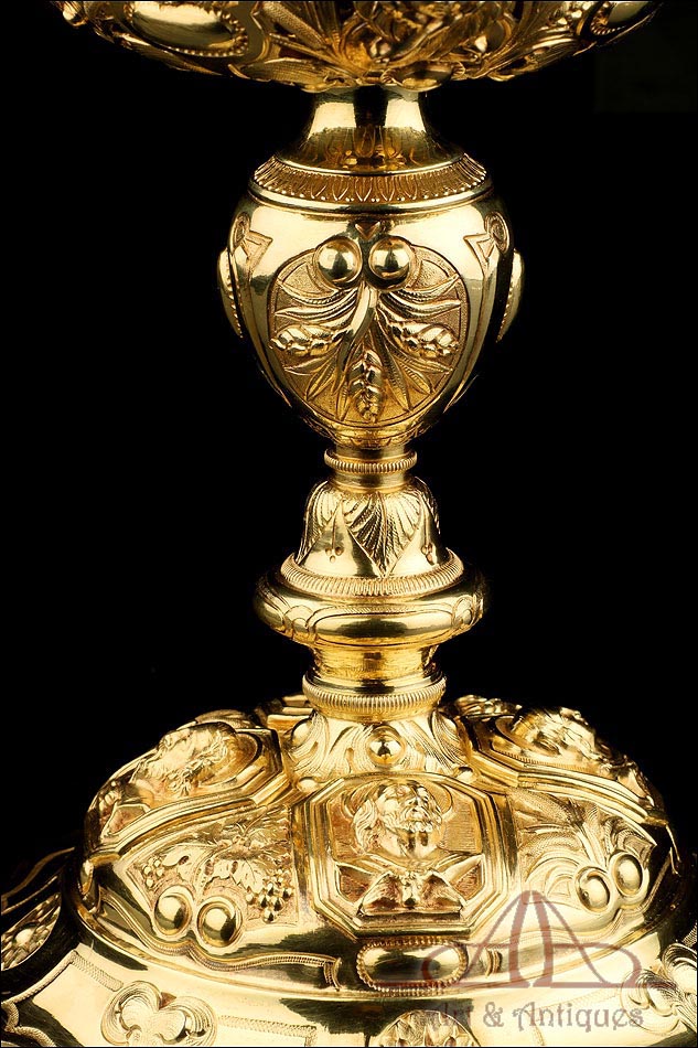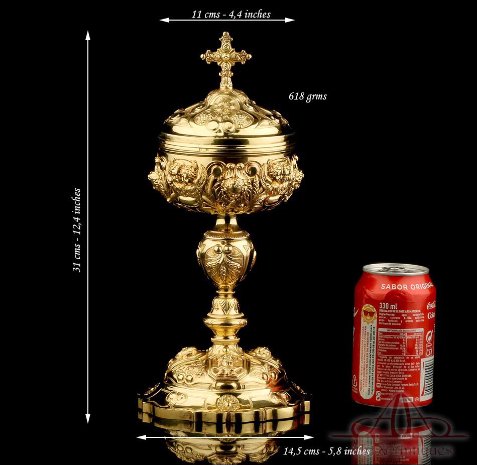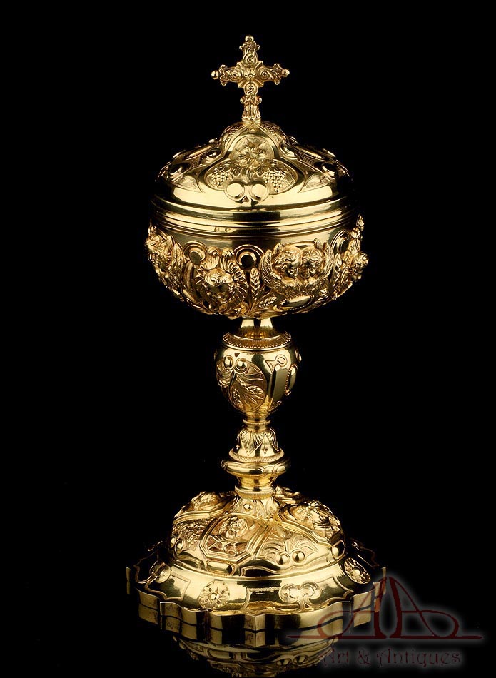 Espectacular copón antiguo en plata maciza dorada, fabricado en Francia en el siglo XIX y con una preciosa decoración cubriendo toda su superficie. Este artículo está realizado íntegramente en plata de calidad, lo que queda confirmado por la presencia de contrastes en todas sus partes: base, copa y tapa. El acabado dorado está en muy buenas condiciones. Llama la atención la compleja decoración que adorna esta pieza, formada por varias imágenes religiosas, símbolos litúrgicos y relieves de estilo clásico.