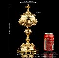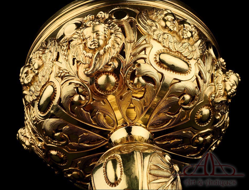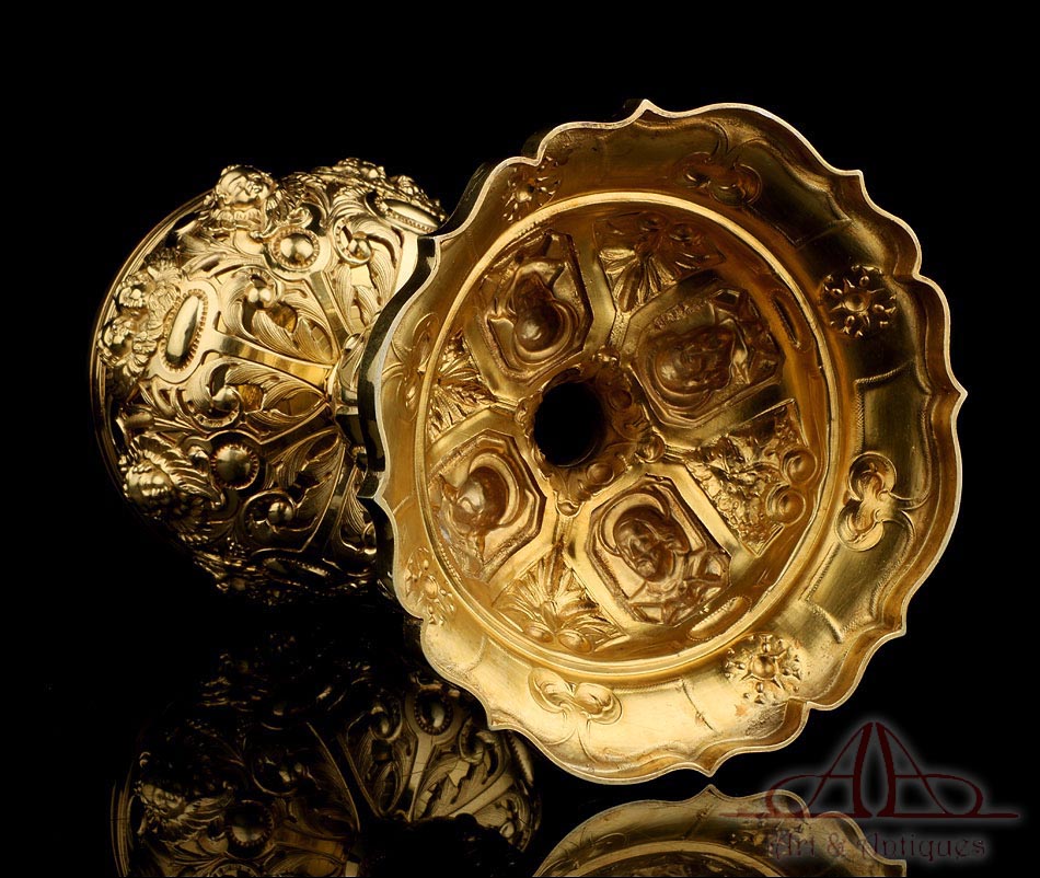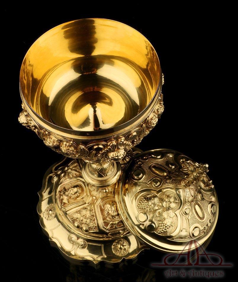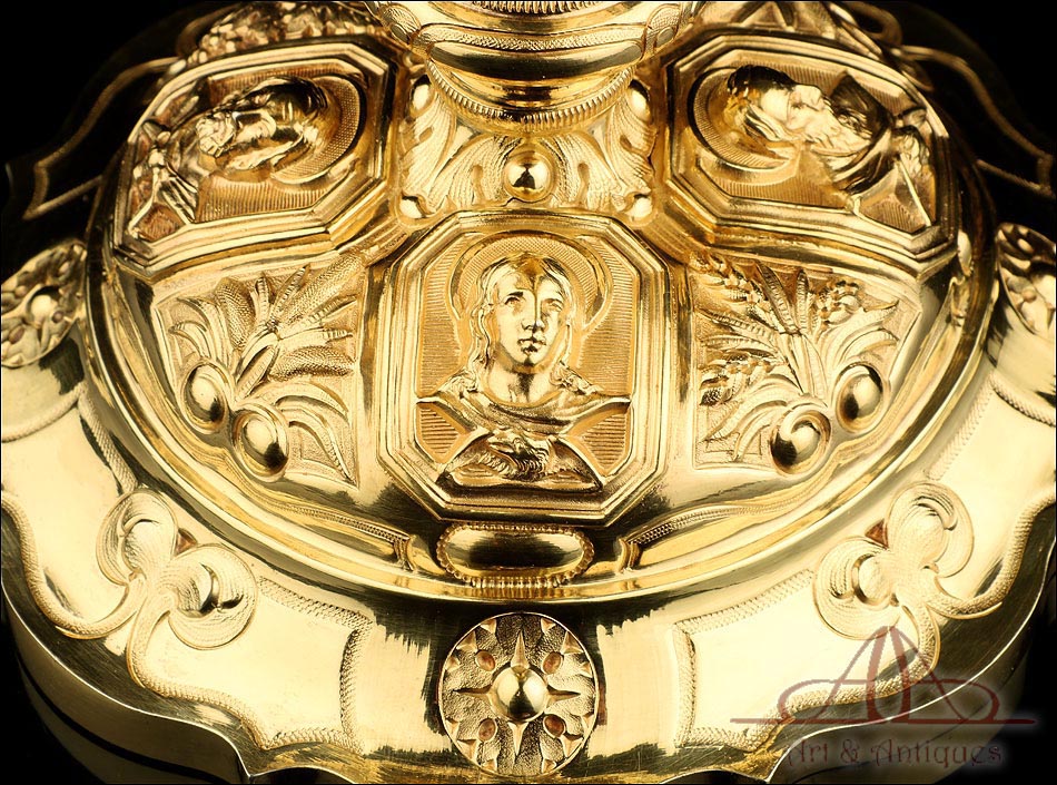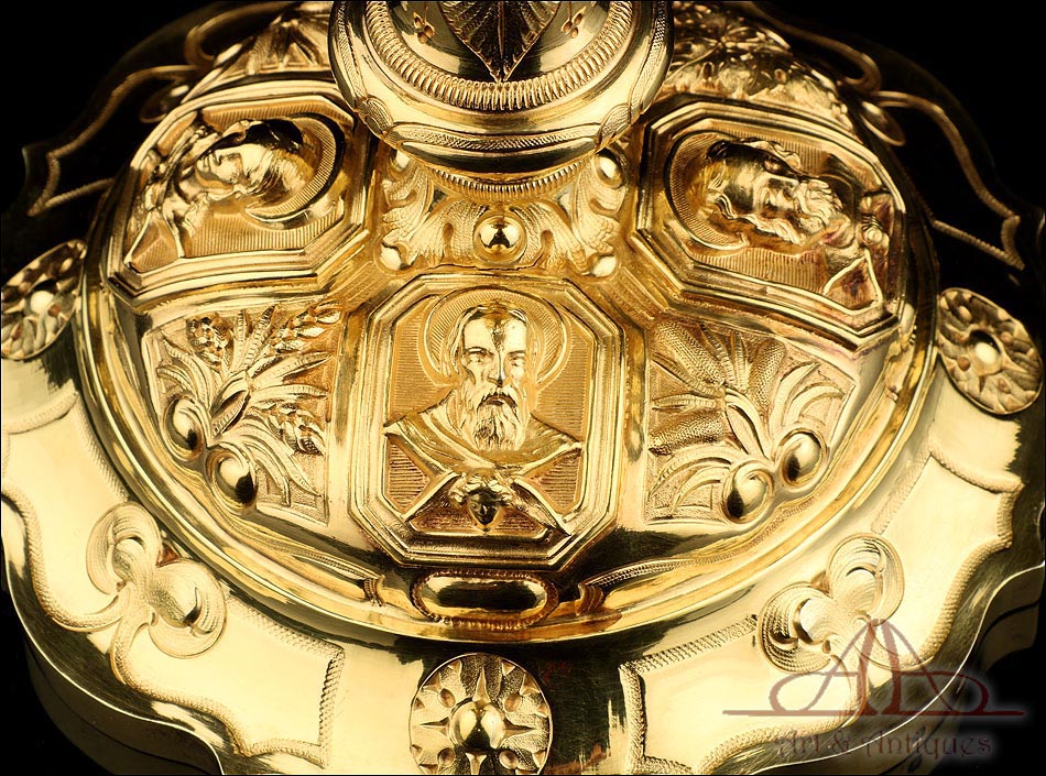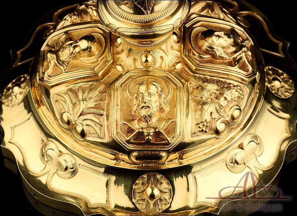Este espectacular copón antiguo de plata maciza dorada merece un lugar de honor en un museo de arte sacro o una gran colección de orfebrería religiosa.