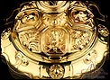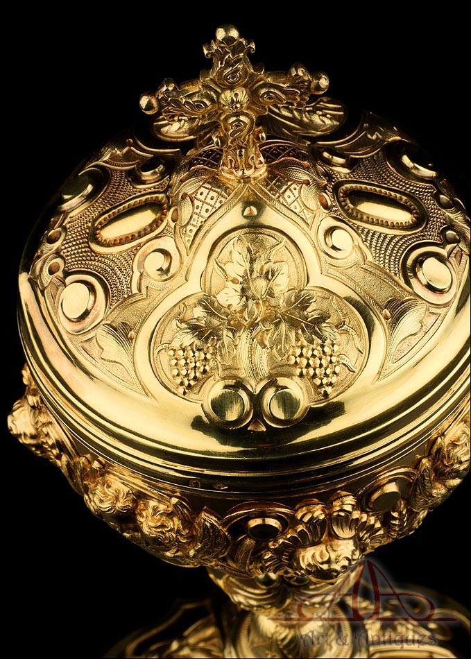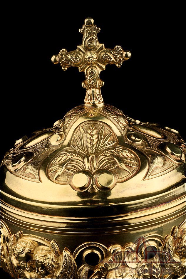 En esta parte se alternan los símbolos antes citados (las uvas, las espigas y los juncos) con cabezas de querubines, solas o en parejas. Las imágenes se entrelazan y superponen creando un efecto barroco y dinámico que aporta una gran belleza a la decoración. Por su parte, la tapa muestra de nuevo los símbolos eucarísticos y está coronada por una hermosa cruz formada por volutas, que hace las veces de asa. En la tapa, el borde de la copa y el pie del copón encontramos el contraste de la plata francesa antigua y el del orfebre que realizó esta pieza.