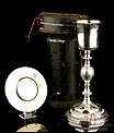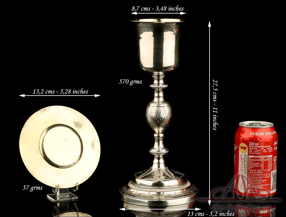 Medidas: Cáliz: Ancho de la Base: 13 cm. Ancho de la Copa: 8,7 cm. Altura: 27,5 cm. Peso: 570 g. Patena: Diámetro: 13,2 cm. Peso: 57 g.