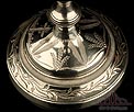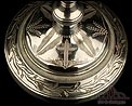 El cáliz muestra un aspecto estilizado y atractivo. El diseño cuenta con base circular y amplia, decorada con una cenefa muy sencilla de motivos florales en el borde y espigas de trigo simétricas en el centro. También podemos ver una cruz radiante en un paisaje desértico que señala la parte delantera, un símbolo característico en este tipo de piezas. El tallo lleva un nudo principal central de forma ahusada y está adornado con sencillos motivos simétricos de estilo vegetal, esquemáticos y elegantes. Lleva nudos secundarios por encima y por debajo. La copa que se alza sobre el tallo es de plata totalmente lisa.