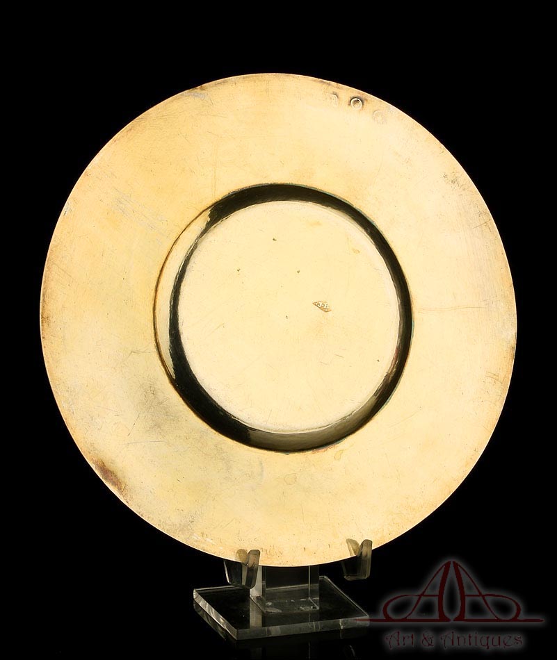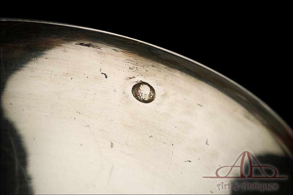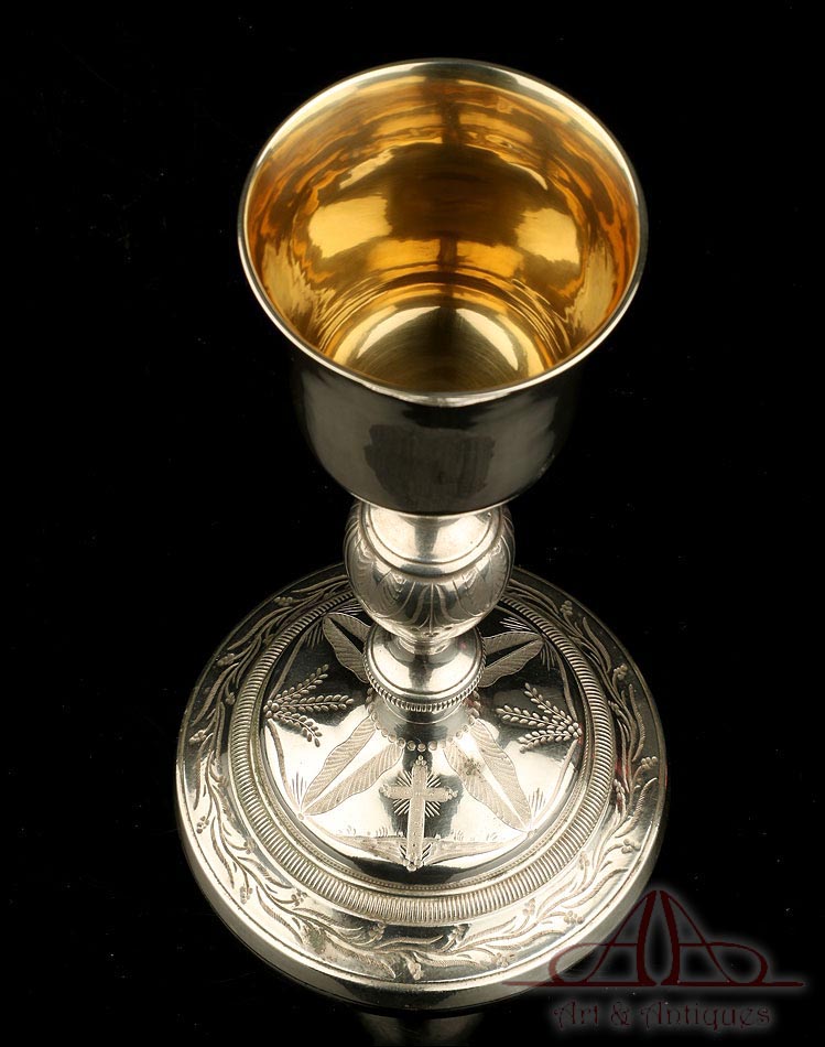 Muy antiguo cáliz en plata maciza y metal plateado fabricado en Lyon, Francia entre 1819 y 1838. Va acompañado de una patena de plata algo más antigua (entre 1809 y 1819), también fabricada en alguna provincia francesa fuera de París. El cáliz se presenta en su estuche de guardado; no es el original ya que resulta algo pequeño para la pieza, pero permite guardar tanto el cáliz como la patena para su protección y transporte. Este conjunto de platería religiosa es un artículo hermoso y elegante, con un diseño elegante y atemporal y decoración grabada a mano. Ambos se encuentran en buenas condiciones, a pesar de tener cerca de 200 años de antigüedad.