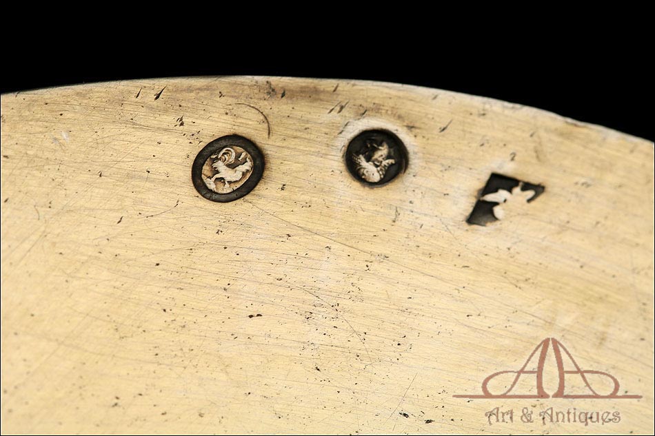 En el borde de la copa encontramos los contrastes que identifican el año de realización de la pieza y el lugar, la provincia de Lyon. La patena es de plata dorada, totalmente lisa y en buenas condiciones. También lleva tres contrastes correspondientes a la época de fabricación, la localización y el platero. El estuche destinado a guardar ambas piezas está algo desgastado por el uso y el paso del tiempo, pero todavía cumple perfectamente su función.