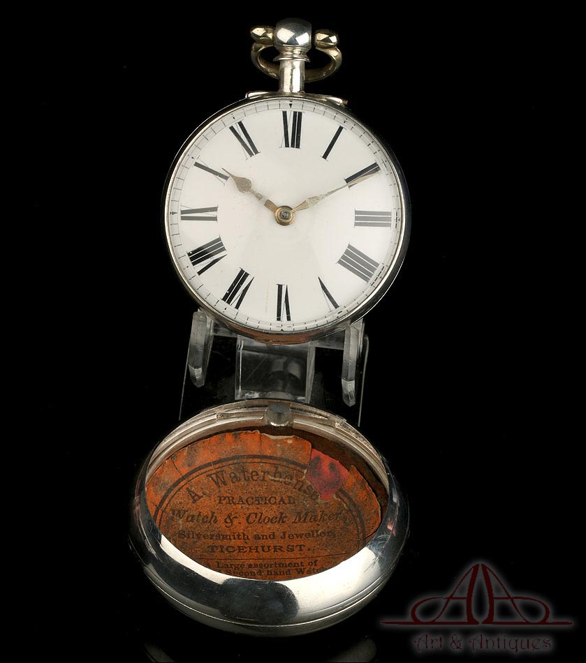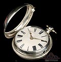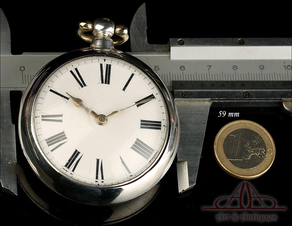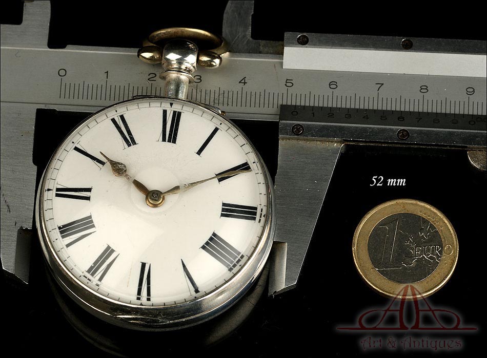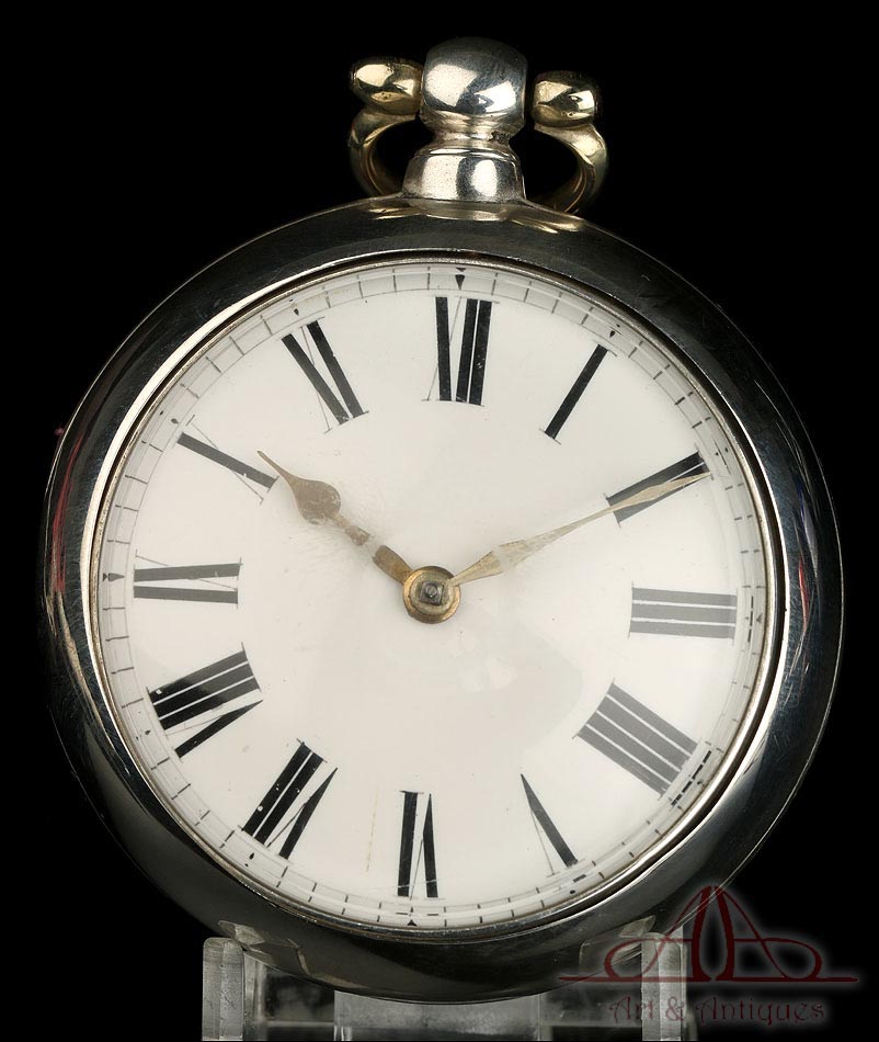Este maravilloso y antiguo reloj catalino con dos cajas de plata y maquinaria firmada por R. Shivell es una pieza exclusiva, digna de la mejor colección y el atuendo más elegante.