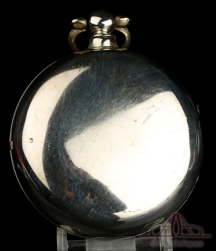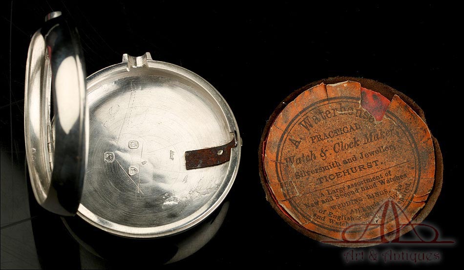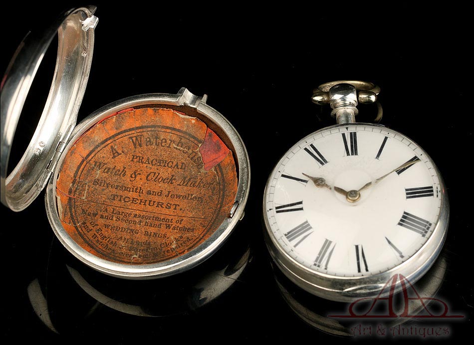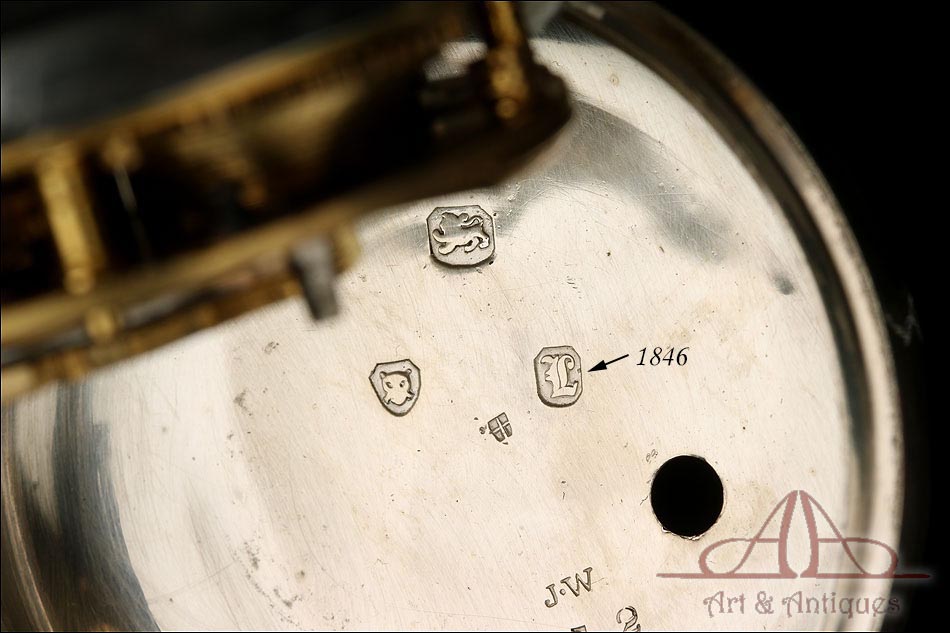 Precioso y antiguo reloj catalino con dos cajas de plata firmado por R. Shrivell en la maquinaria y fabricado en Inglaterra en 1846. Se trata de un artículo con más de 150 años de antigüedad y muy bien conservado. La maquinaria está revisada y a día de hoy el reloj funciona muy bien. Va acompañado de una llave antigua. El reloj está montado en una caja de plata maciza antigua y va metido dentro de otra caja externa e independiente, también de plata. Esta segunda caja lleva en su interior una antigua etiqueta de papel con el nombre del comerciante y detalles sobre el negocio. La tapa trasera en su cara interna los contrastes correspondientes a la plata antigua inglesa y el año de fabricación (1846). También podemos ver el sello del platero con las iniciales JW y el contraste de la plata de Londres, el rostro de un leopardo.