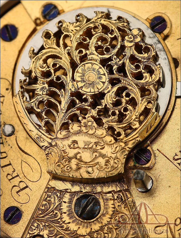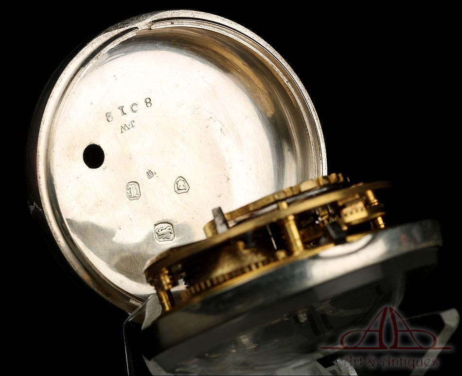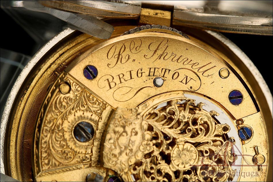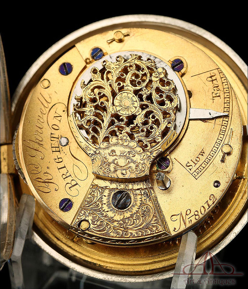 El reloj tiene esfera blanca con números romanos negros y agujas tipo pera en metal dorado. La tapa posterior es de plata lisa y se encuentra en magníficas condiciones, sin golpes, rozaduras ni arañazos. En el interior de esta tapa aparecen los mismos contrastes que en caja externa, además del número de serie 8012. La bellísima maquinaria del reloj está profusamente decorada con volutas y celosías, además de llevar varias inscripciones grabadas a mano: podemos ver el mismo número de serie (Nº 8012) y la firma R. Shivell – Brighton.