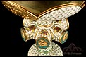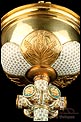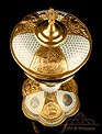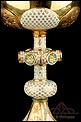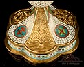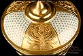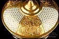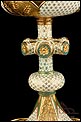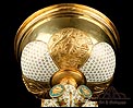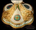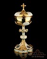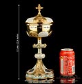 La base del copón se estrecha para unirse al tallo, totalmente cubierto por esmalte blanco cuajado de estrellas doradas. El nudo principal tiene forma de estrella, con seis brazos cilíndricos. En el extremo de cada brazo podemos ver un esmalte champlevé con fondo turquesa sobre el que destaca un motivo de bronce en relieve. En los brazos también distinguimos pequeñas cruces rojas adornadas con detalles amarillos y azules. La base de la copa reproduce el diseño floral del pie del copón, con seis secciones a modo de pétalos que alternan zonas de esmalte blanco con estrellas y relieves en bronce. Por último, la tapa repite de nuevo la estructura de secciones y reproduce los motivos de la base.