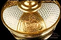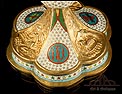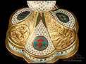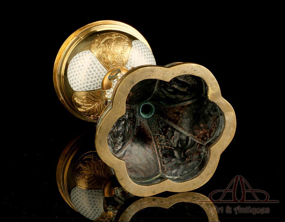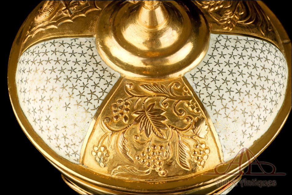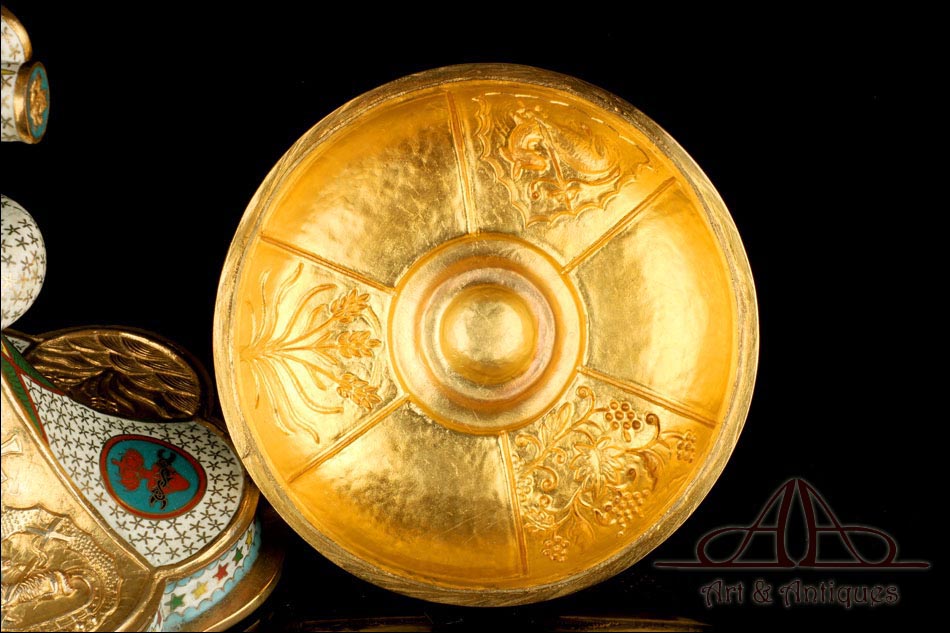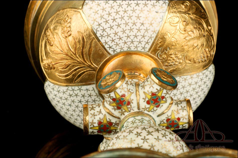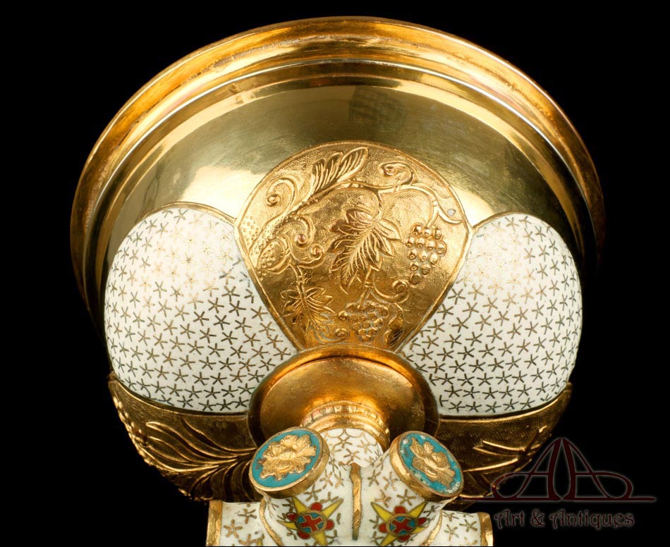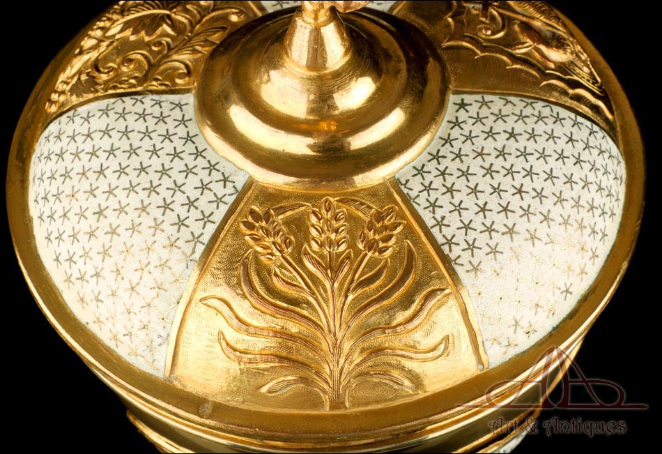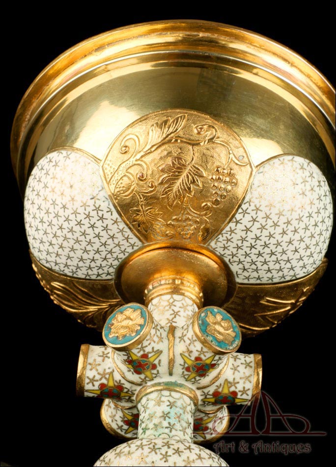 Extraordinario copón antiguo con esmaltes Champlevé fabricado en Francia circa 1920. Se trata de una pieza magnífica, muy rara y de una belleza fuera de lo común. El copón se encuentra en perfecto estado y conserva íntegros los delicados esmaltes, que le aportan un atractivo muy singular. El término francés “champlevé” significa “campo elevado” y designa una técnica mediante la cual, el artista graba o moldea el metal para crear celdas con distintas formas. Posteriormente, las celdas se rellenan con esmalte de distintos tonos. Se diferencia de la clásica técnica del cloissoné en que en esta última las celdas se crean soldando finas tiras de metal a la base.