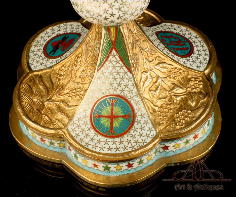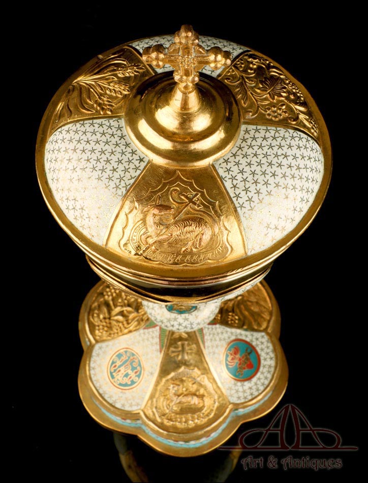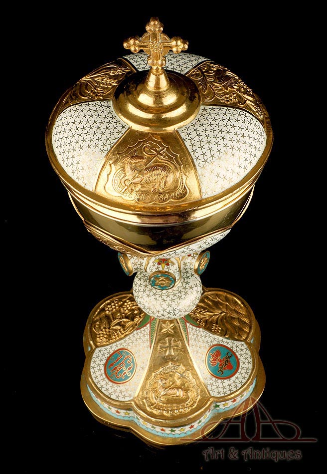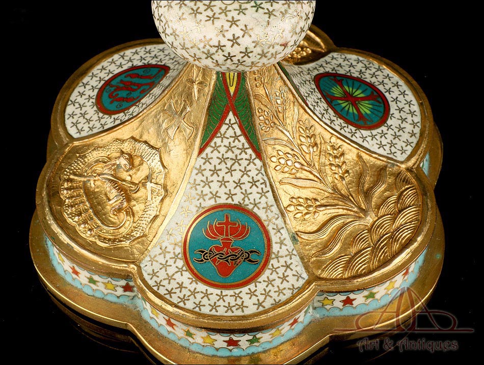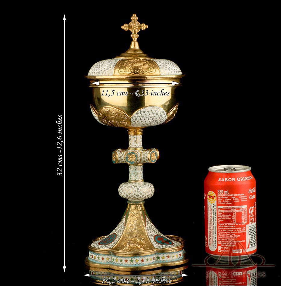 Los amantes de las piezas artísticas religiosas apreciarán sin duda la rareza y el magnífico estado de este extraordinario copón antiguo francés con esmaltes Champlevé.