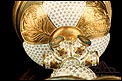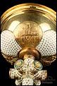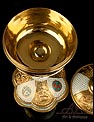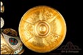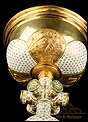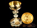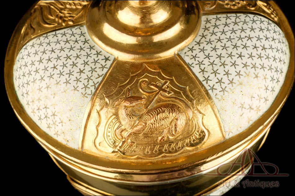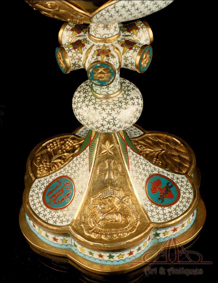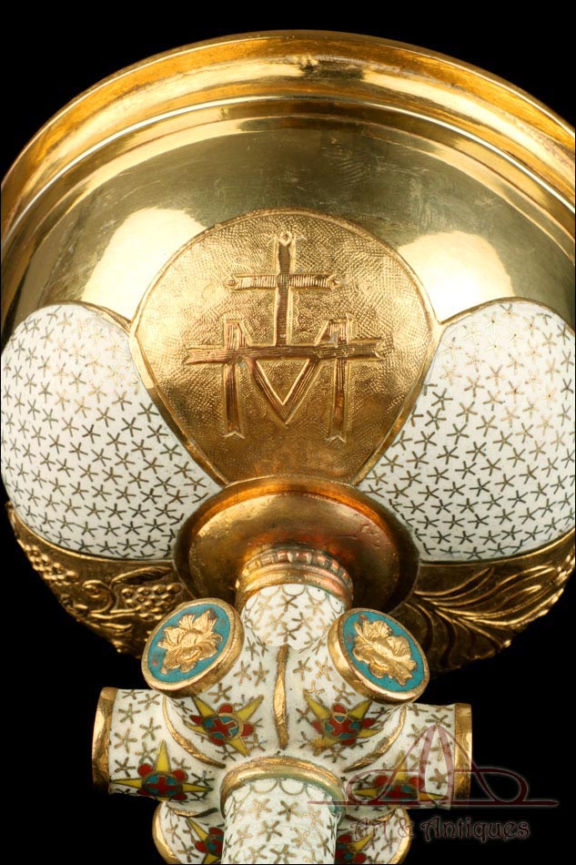 El copón que vemos en las imágenes lleva pie y tallo de bronce y copa de plata maciza. La copa no está contrastada, o al menos no lleva contrastes visibles, pero se ha testado al ácido y podemos garantizar que es plata. La pieza lleva una decoración de estilo neogótico, tan atractiva como original. La base tiene forma de flor de seis pétalos y está dividida en seis secciones. Tres de ellas están decoradas con relieves, mostrando símbolos clásicos de la Eucaristía: las espigas de trigo, las uvas en la vid y el Agnus Dei (Cordero de Dios). Las otras tres, repartidas de forma alterna, llevan una hermosa decoración en esmalte blanco con diminutas estrellas de bronce. Sobre esta decoración, cada sección lleva un círculo central en tonos rojo y turquesa. Uno de los círculos contiene el Sagrado Corazón; los otros dos, una cruz latina y el acrónimo IHS respectivamente.