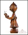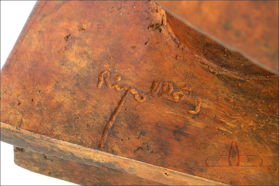 En la cara anterior, la figura de la niña sostiene una gran mariposa en la mano derecha. El insecto está realizado con gran delicadeza, desde las finas antenas hasta las alas. El rostro de la niña sonríe sutilmente y está dividido por un relieve que representa la nariz y los labios, y que permite mirar la escultura también desde un punto de vista lateral (siguiendo las pautas de la pintura cubista). El bronce lleva una hermosa pátina en tonos rojizos, pardos y dorados, un acabado que incrementa aún más la belleza de la escultura. En la base podemos ver grabada la firma del artista, Ripollés, así como la inscripción PA II/IV (Prueba de Artista: escultura 2 de 4).