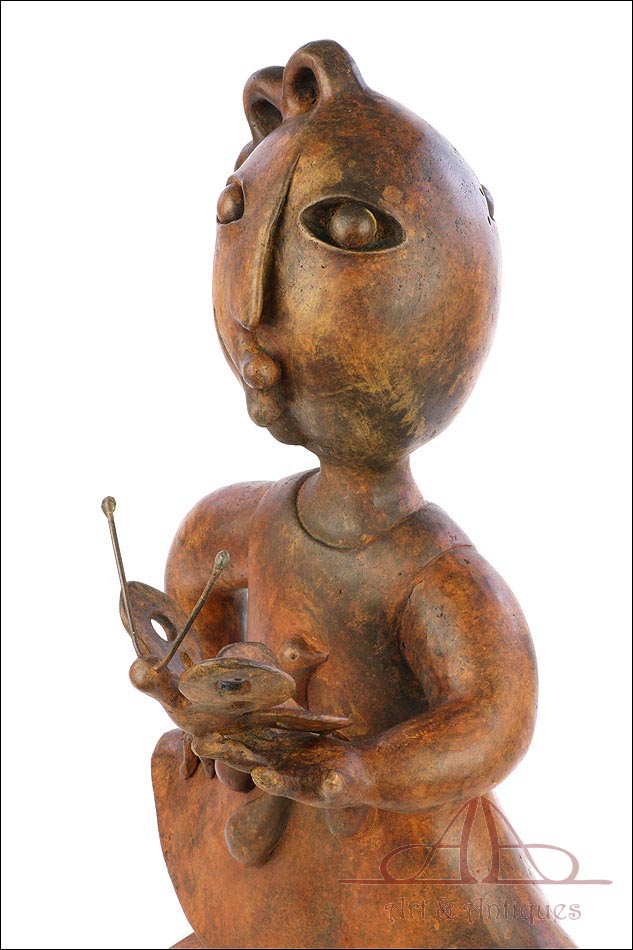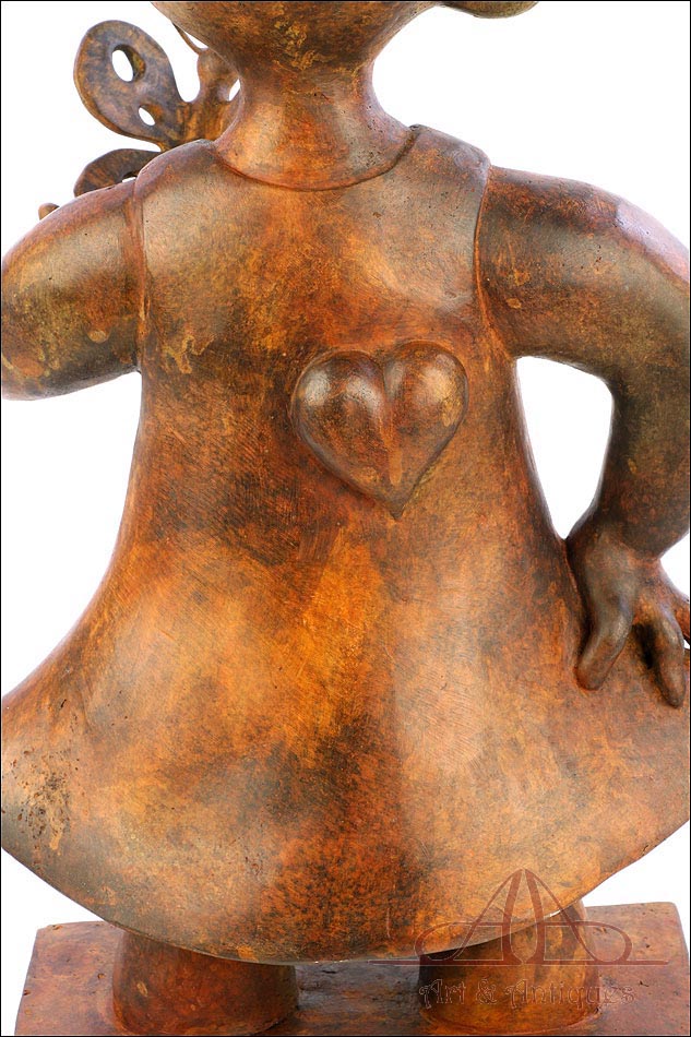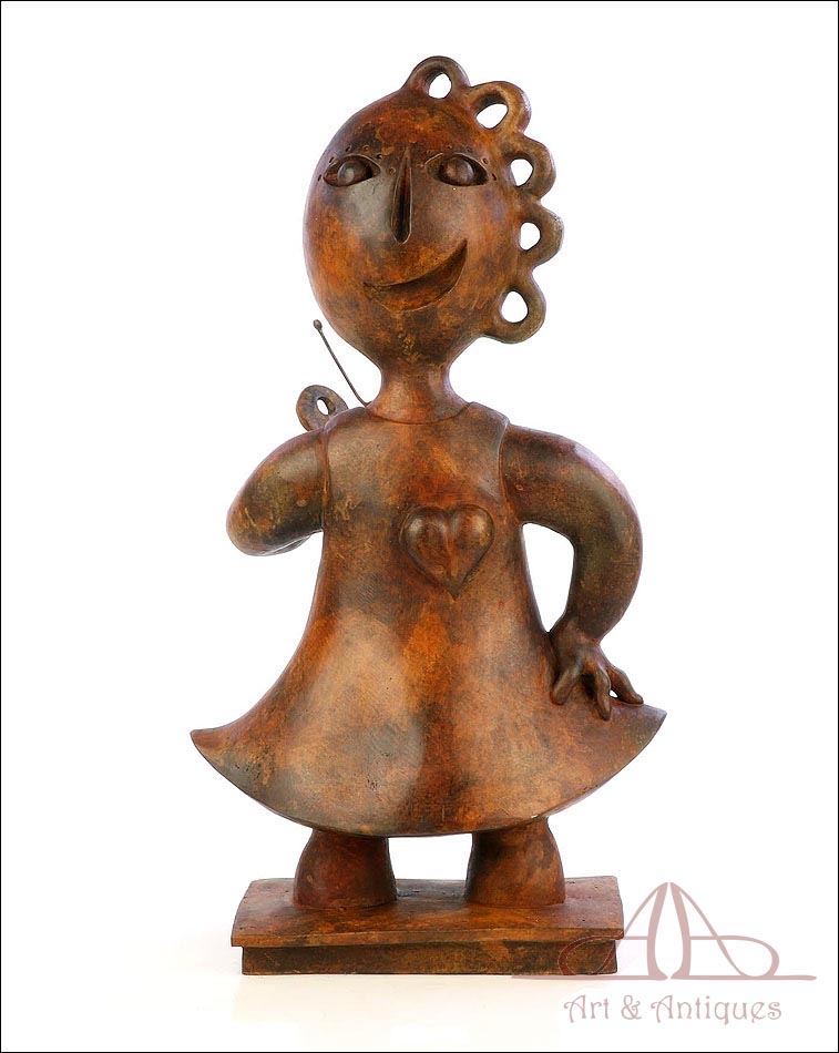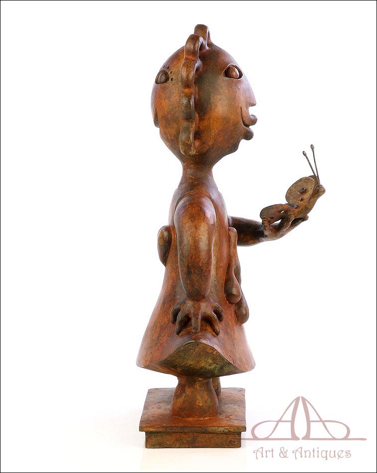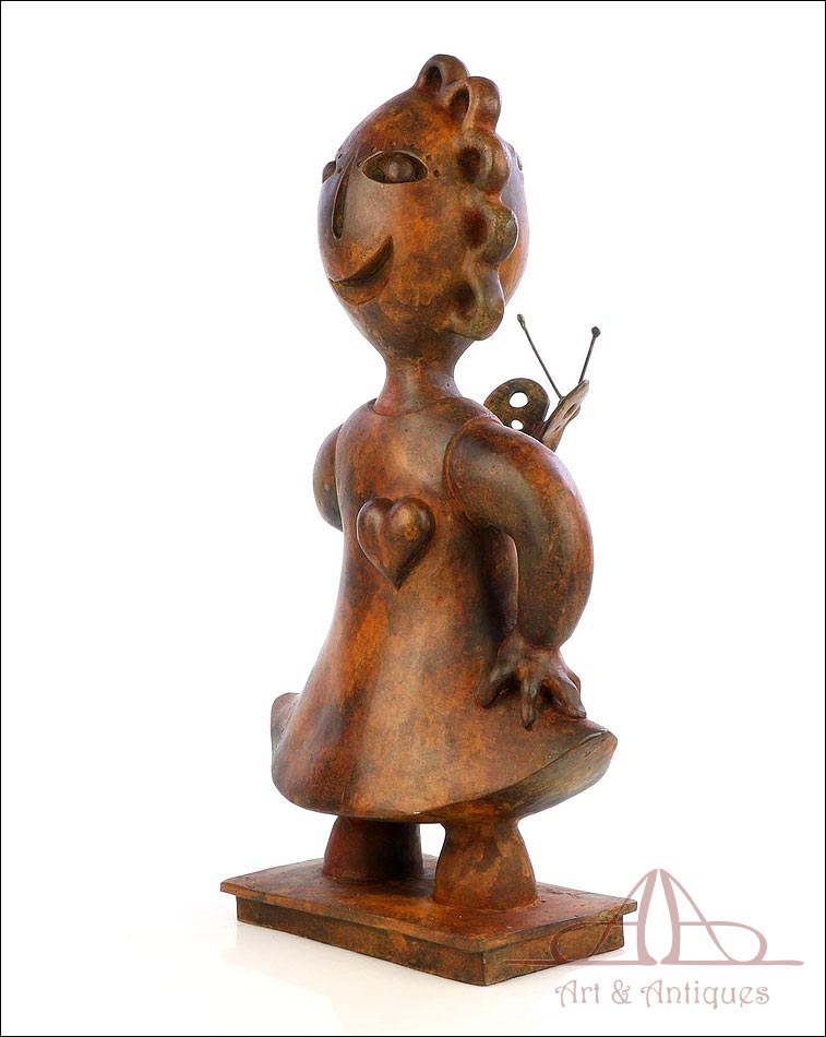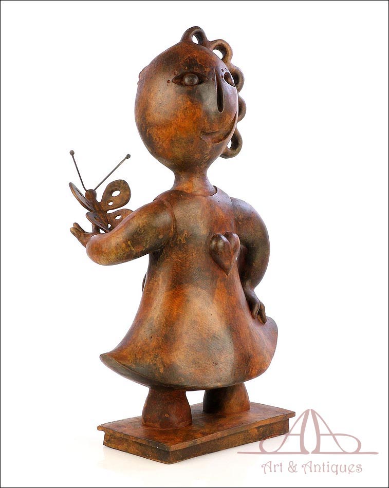 Exclusiva escultura original en bronce de Joan Ripollés “La niña de la mariposa”. Se trata de la prueba de artista nº 2 de 4 ejemplares, la segunda realizada por el escultor de las cuatro obras que completan la tirada. La escultura es tan delicada como atrevida, una obra llena de armonía e ingenuidad que refleja muy bien el estilo propio del inclasificable artista. Representa la figura de una niña sobre un pedestal bajo y cuadrado, vestida con un traje acampanado y con el doble rostro que podemos encontrar en muchas de las obras de Ripollés. Así, la escultura se puede admirar tanto por su parte delantera como trasera, como si se tratase de dos figuras distintas en una sola.