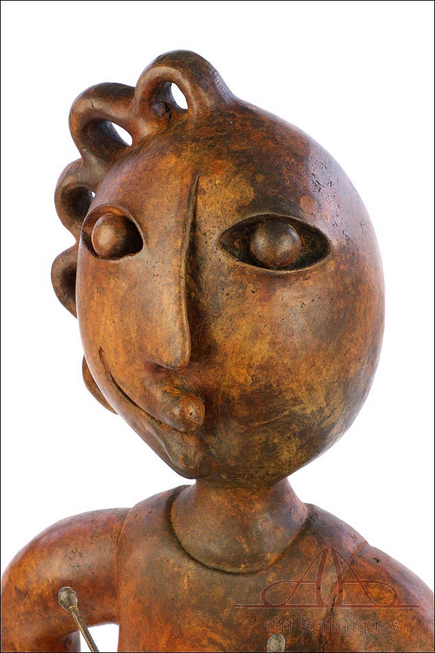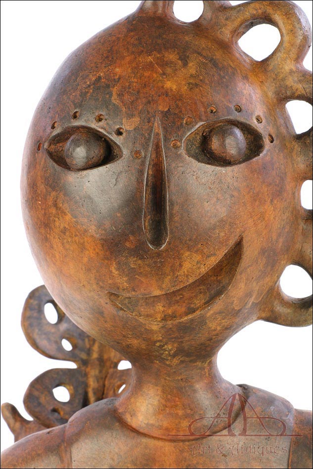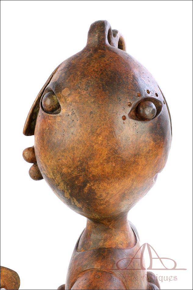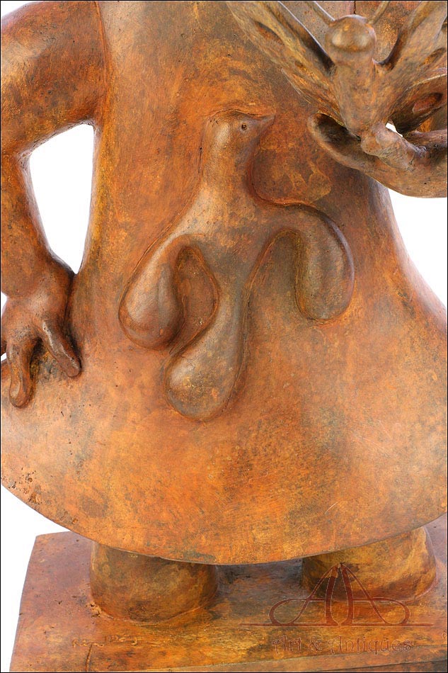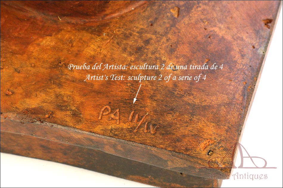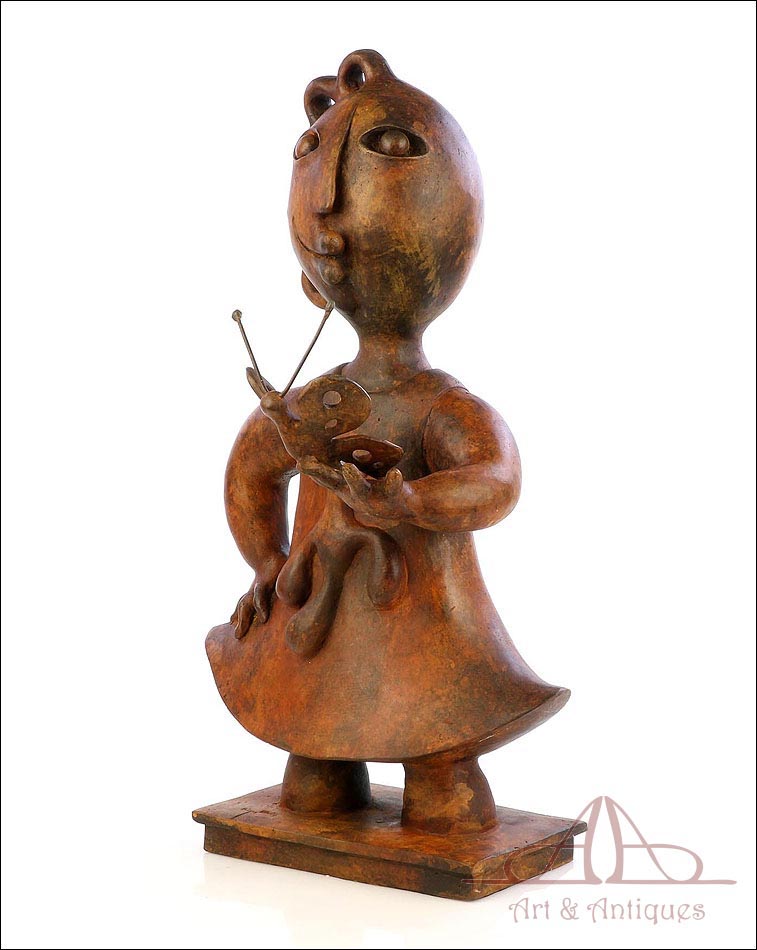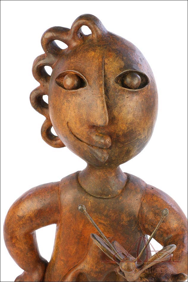 Exclusiva escultura original en bronce de Joan Ripollés “La niña de la mariposa”. Se trata de la prueba de artista nº 2 de 4 ejemplares, la segunda realizada por el escultor de las cuatro obras que completan la tirada. La escultura es tan delicada como atrevida, una obra llena de armonía e ingenuidad que refleja muy bien el estilo propio del inclasificable artista. Representa la figura de una niña sobre un pedestal bajo y cuadrado, vestida con un traje acampanado y con el doble rostro que podemos encontrar en muchas de las obras de Ripollés. Así, la escultura se puede admirar tanto por su parte delantera como trasera, como si se tratase de dos figuras distintas en una sola.