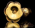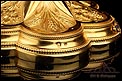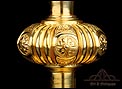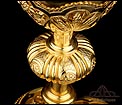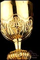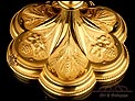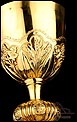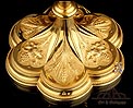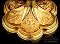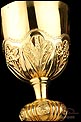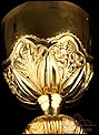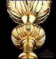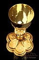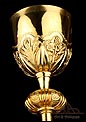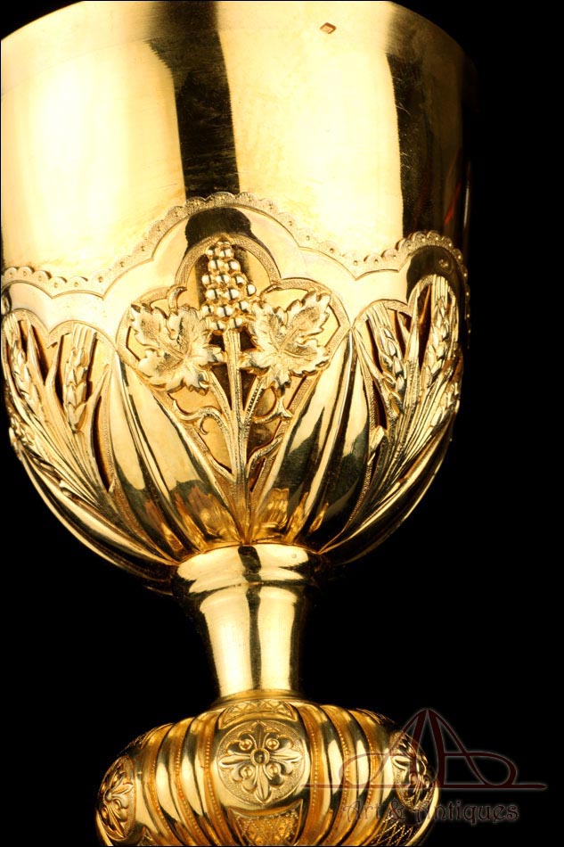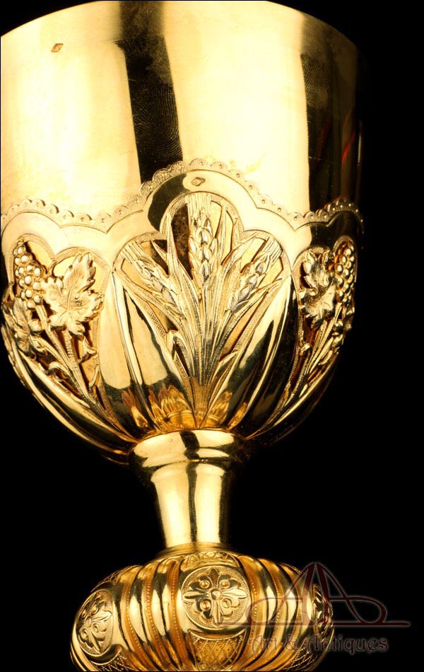 Precioso y antiguo cáliz de plata maciza dorada con su estuche y su patena, procedente de Francia y fabricado circa 1900. El cáliz es de un tamaño bastante grande y tiene un diseño aristocrático e imponente, con decoración labrada a mano y una pequeña cruz esmaltada en la base. El acabado dorado se encuentra en magníficas condiciones y muestra un intenso y cálido tono que cubre la plata de manera uniforme. La base es muy amplia y está seccionada en lóbulos o pétalos, a modo de flor. Cada sección lleva un motivo en relieve; en realidad se trata solo de dos imágenes, las espigas de trigo y las uvas en la vid (símbolos del pan y el vino de la Eucaristía).