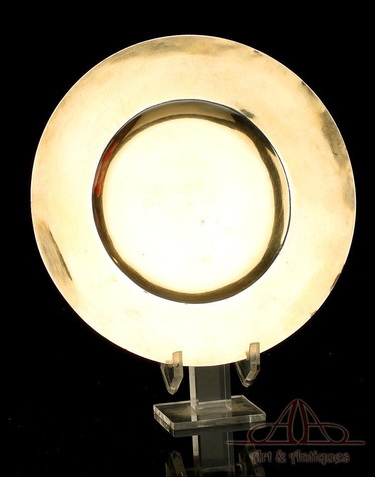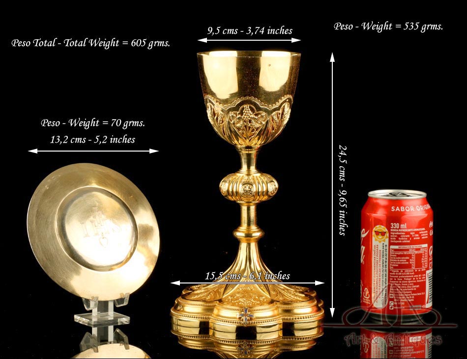 Medidas: Cáliz: Ancho de la Base: 15,5 cm. Altura: 24,5 cm. Ancho de la Copa: 9,5 cm. Peso: 535 g. Patena: Diámetro: 13,2 cm. Peso: 70 g. Peso Total: 605 g.