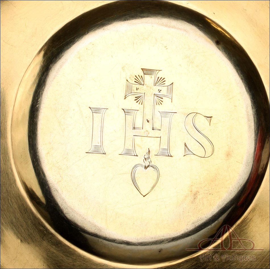 Tan hermoso como original de época, este antiguo cáliz de plata maciza dorada con su estuche conserva toda la belleza y el encanto de la orfebrería religiosa de principios de siglo.