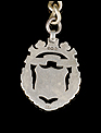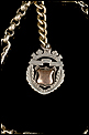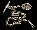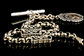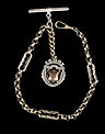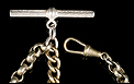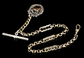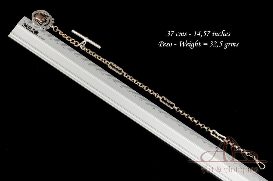 Antigua cadena para reloj de bolsillo de plata maciza fabricada en Birmingham (Inglaterra) en 1909. La cadena está en excelente estado de conservación y lleva una serie de contrastes que indican su origen, antigüedad y calidad. Está completa, preservando todas y cada una de sus piezas originales. En un extremo lleva una pieza de plata en forma de escudo, con orla de hojas de laurel y centro en relieve. El escudo es dorado (probablemente de plata) y permanece liso, sin grabar. En la parte trasera podemos ver los contrastes antes mencionados: el correspondiente a la ciudad de Birmingham, una letra “k” minúscula que indica la fecha de fabricación (1909) y el sello del platero. La cadena en sí está formada por eslabones circulares sencillos, separados por tramos idénticos unidos mediante piezas más grandes de plata labrada. Incluye también la clásica barra en T diseñada para enganchar la cadena al chaleco, de sección hexagonal y decorada con finos motivos grabados.