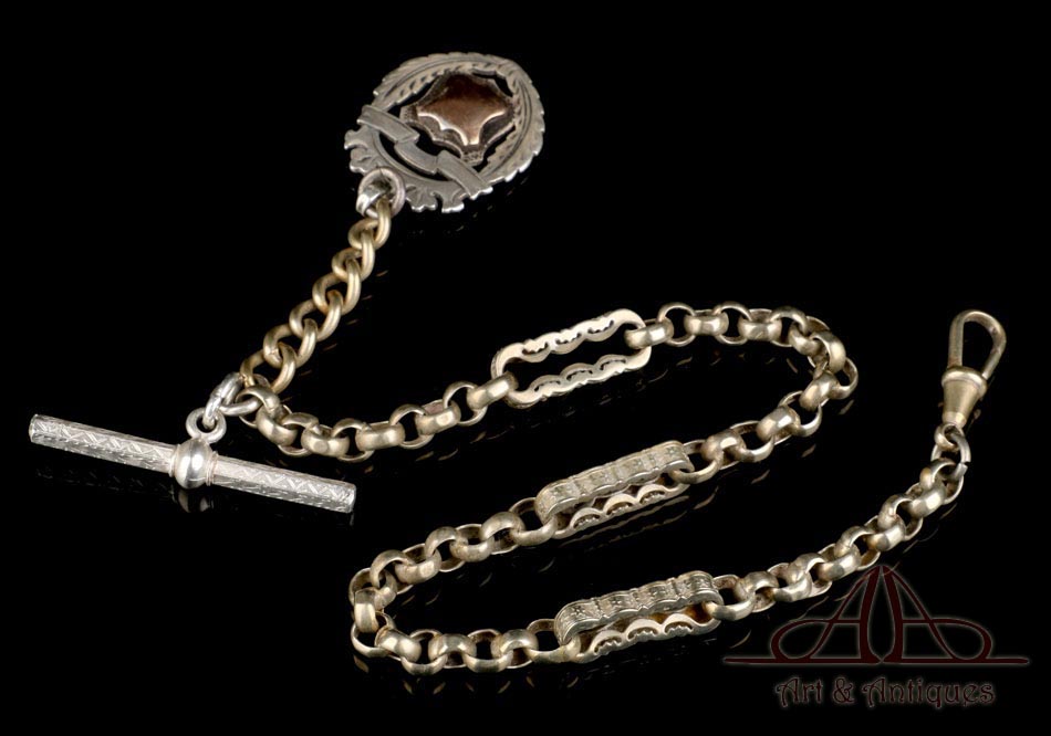 Los amantes de las piezas de plata antigua sabrán apreciar la belleza y la armonía de esta antigua cadena para reloj de bolsillo de plata maciza, contrastada y completa.