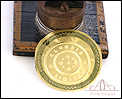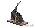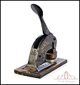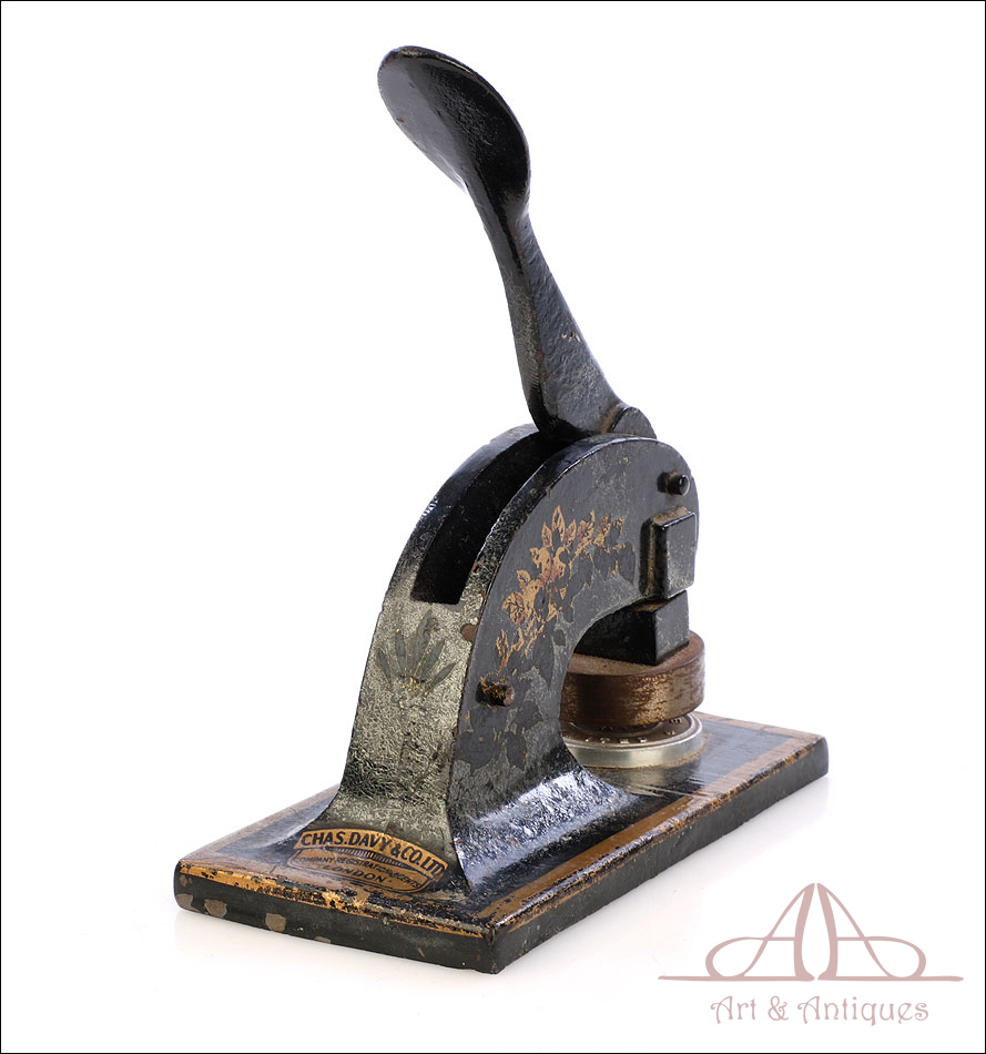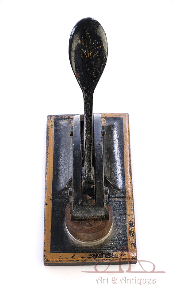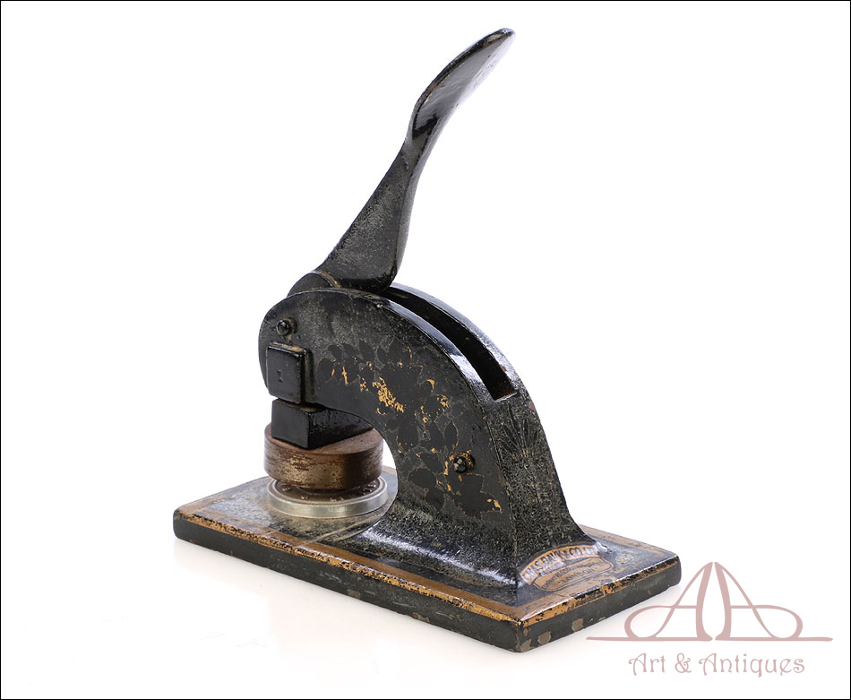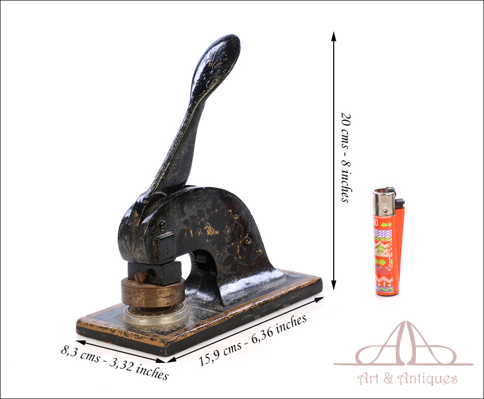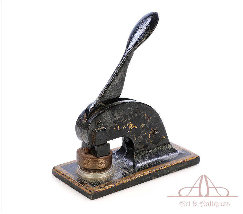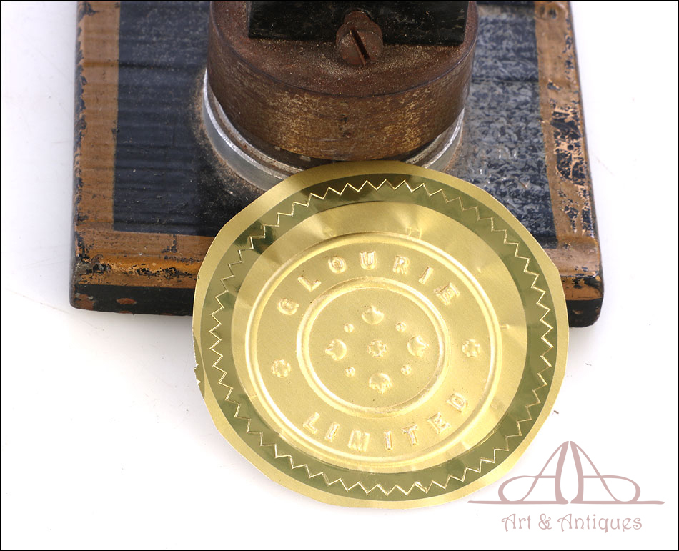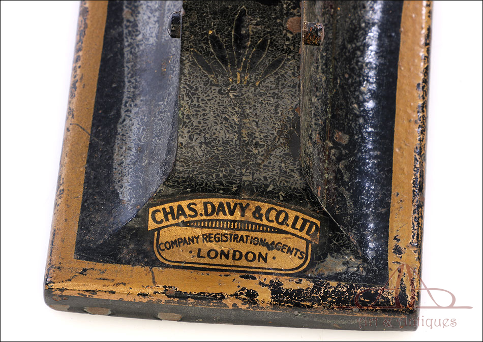 Antiguo sello seco de metal fabricado en Inglaterra circa 1900, funcionando y bien conservado. Este curioso artículo conserva el troquel original en muy buenas condiciones, lo que hace posible utilizarlo para marcar el sello en relieve en materiales blandos (cera, papel, chapa metálica, etc.). El mecanismo consiste en una base de metal sólida de forma rectangular, sobre la que se alza un soporte curvado que sostiene un troquel. En la parte superior hay una palanca móvil; cuando esta palanca se desplaza hacia abajo, presiona el troquel sobre el material a imprimir. El sello resultante lleva la inscrpipción “GLOURIE LIMITED”. El sello conserva parte del esmalte negro y dorado que lo cubría en origen y está decorado con motivos dorados de ramas, frutas y hojas. Uno de los motivos de ellos prácticamente ha desaparecido, mientras que el otro se conserva casi completo. En la parte trasera podemos ver el nombre del negocio donde se utilizó el sello en letras negras sobre fondo dorado, en muy buenas condiciones: CHAS DAVY & CO. LTD. – COMPANY REGISTRATION AGENTS – LONDON.