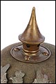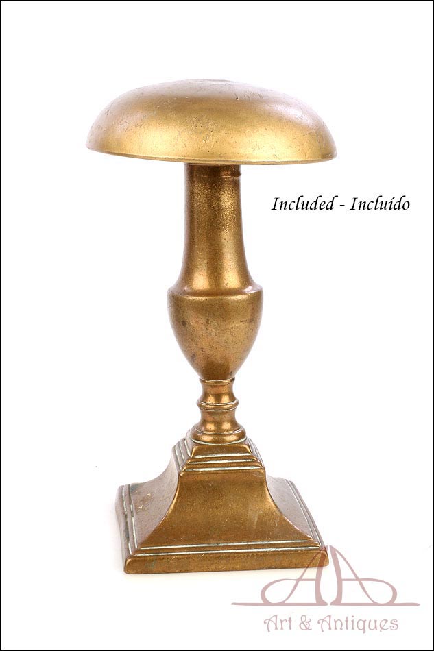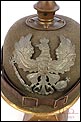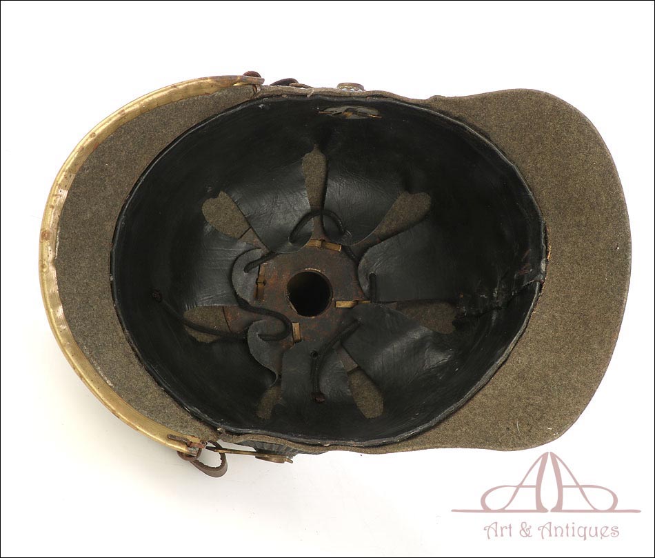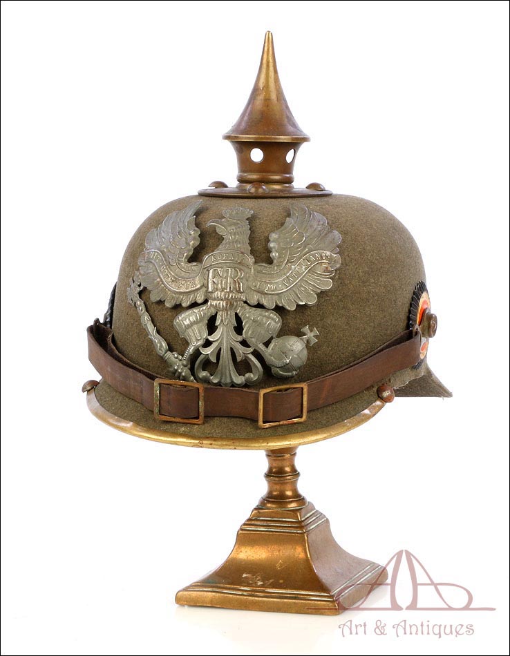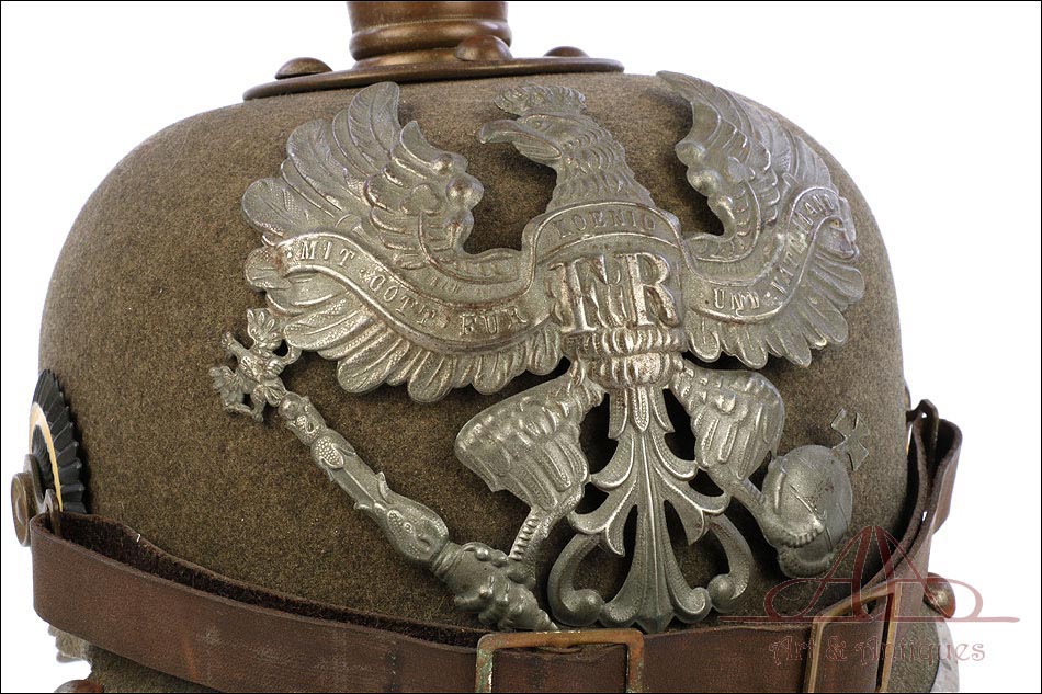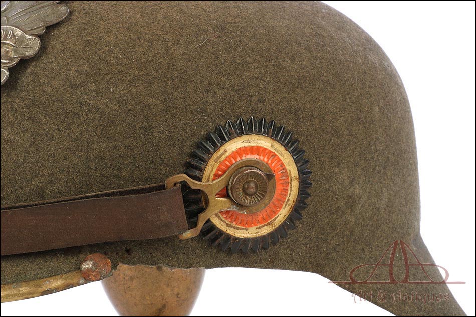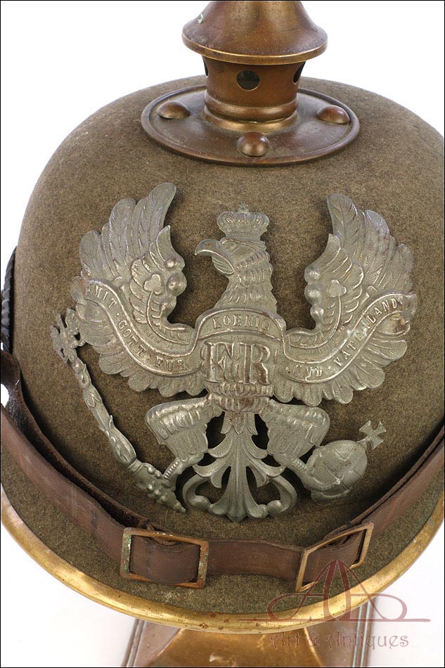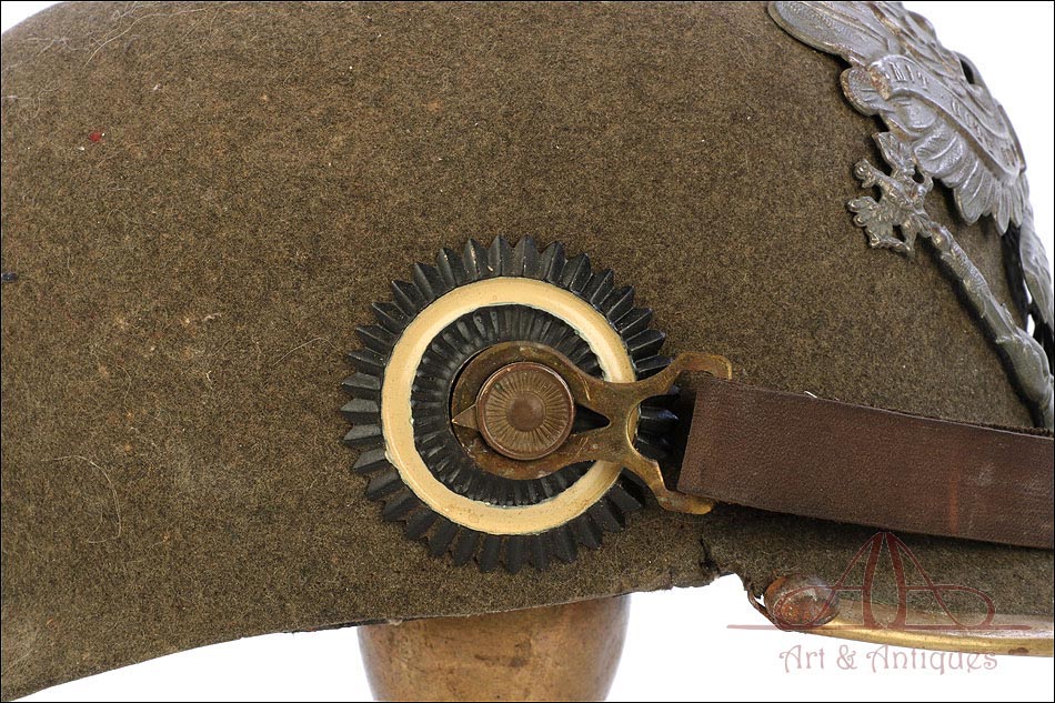 El casco que podemos ver en las fotos conserva el revestimiento de fieltro en un estado casi impecable, sin signos de desgaste, roturas o manchas apreciables. Lo mismo cabe decir de la correa de cuero, original de la época y con las dos hebillas de latón. La correa está fijada a los laterales mediante dos insignias de metal: la de la derecha es la de Alemania, con los colores rojo, blanco y negro, mientras que a la izquierda vemos la de Prusia (en blanco y negro). En la parte delantera distinguimos una magnífica águila prusiana fabricada en latón plateado, situada en el campo de batalla y sujetando el cetro y el orbe en sus garras. El casco conserva el pincho de metal y el ribete de latón de la visera frontal, ambos en muy buen estado, y se entrega con el soporte.
