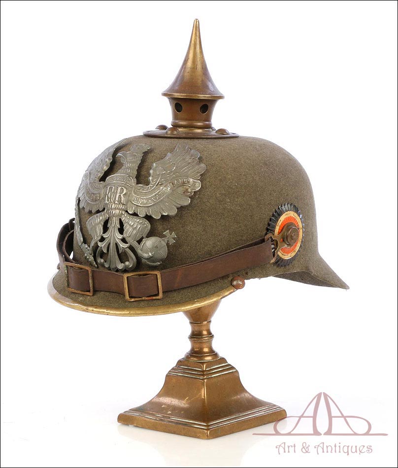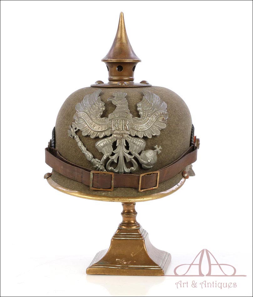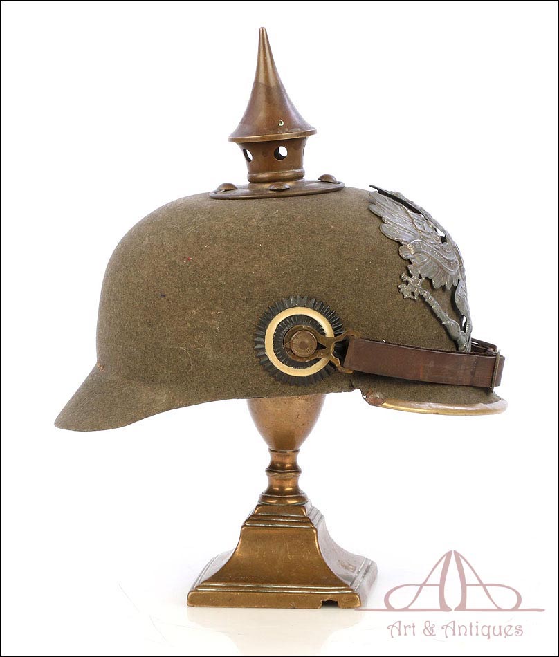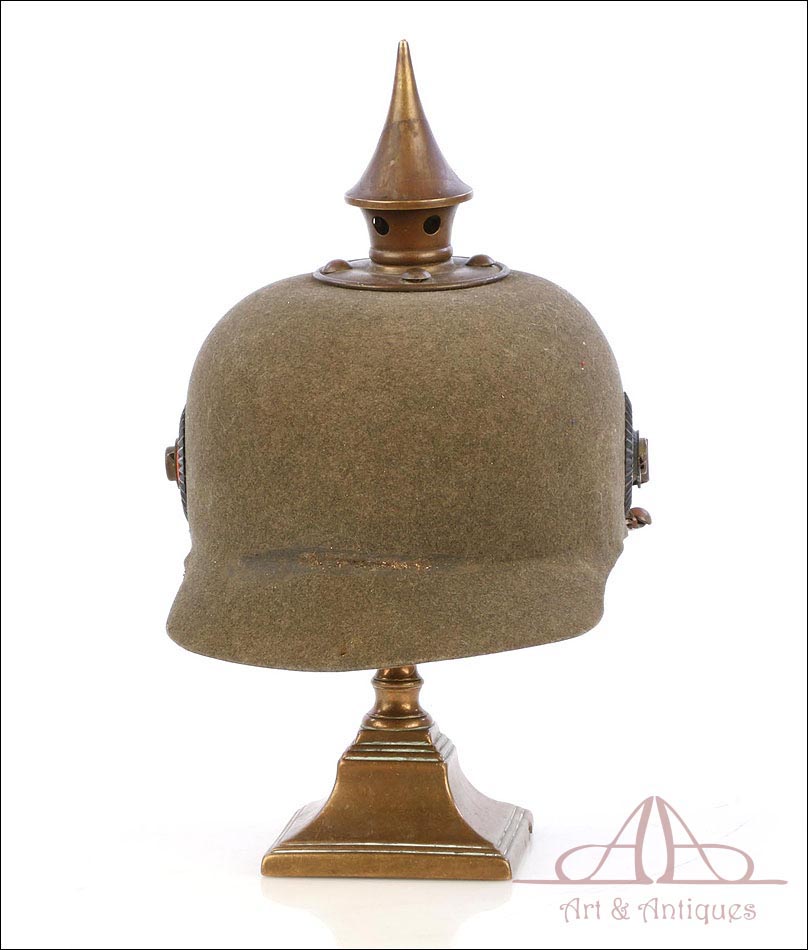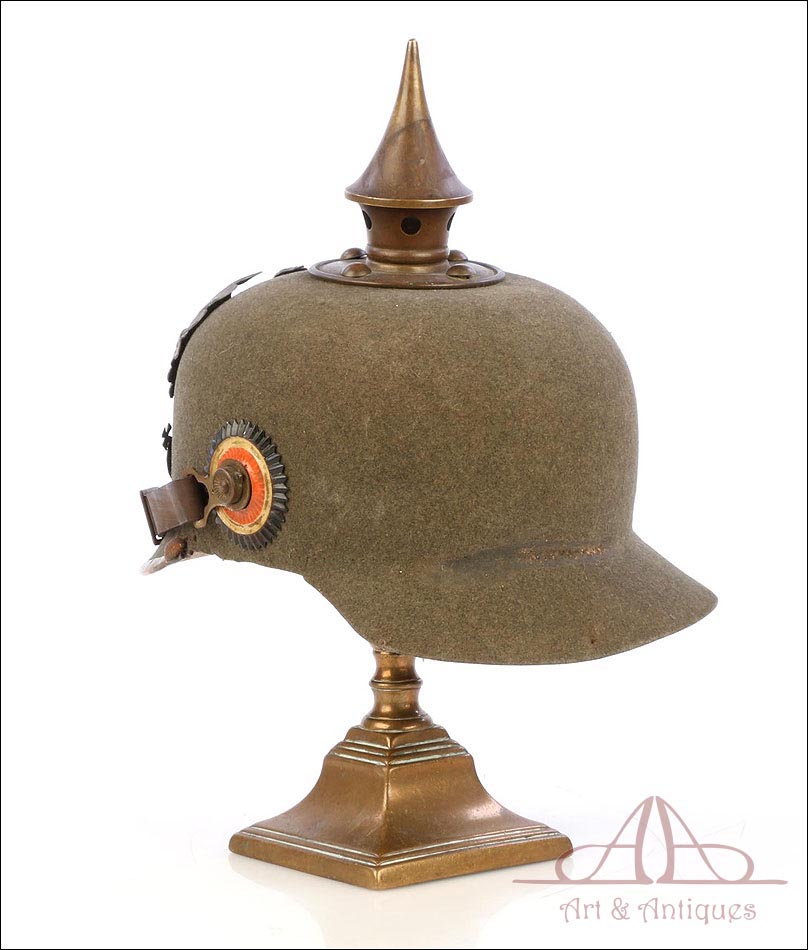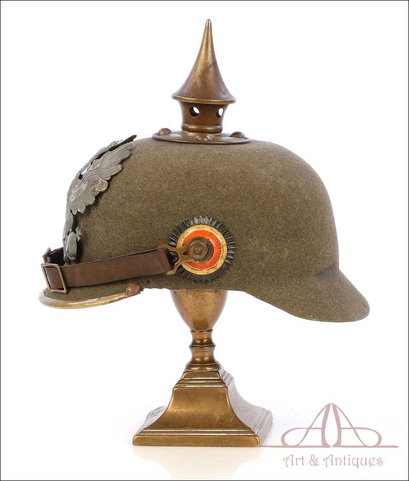 Fascinante casco Pickelhaube Ersatz de fieltro del Ejército Imperial prusiano, fabricado en 1914 y en excelente estado de conservación. El casco está completo, tanto por el interior como por el exterior, y en magníficas condiciones. El único desperfecto que muestra es un pequeño agujero en el saliente de la parte posterior, destinado a colgar el casco de un clavo o escarpia en la pared. Es un detalle mínimo si tenemos en cuenta que la mayoría de los cascos de fieltro de este tipo han desaparecido, al tratarse de un material muy frágil que apenas resiste el paso del tiempo. Por lo tanto, se trata de un auténtico superviviente digno de un museo o una buena colección.
