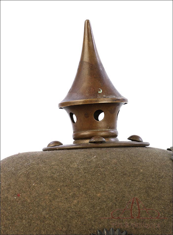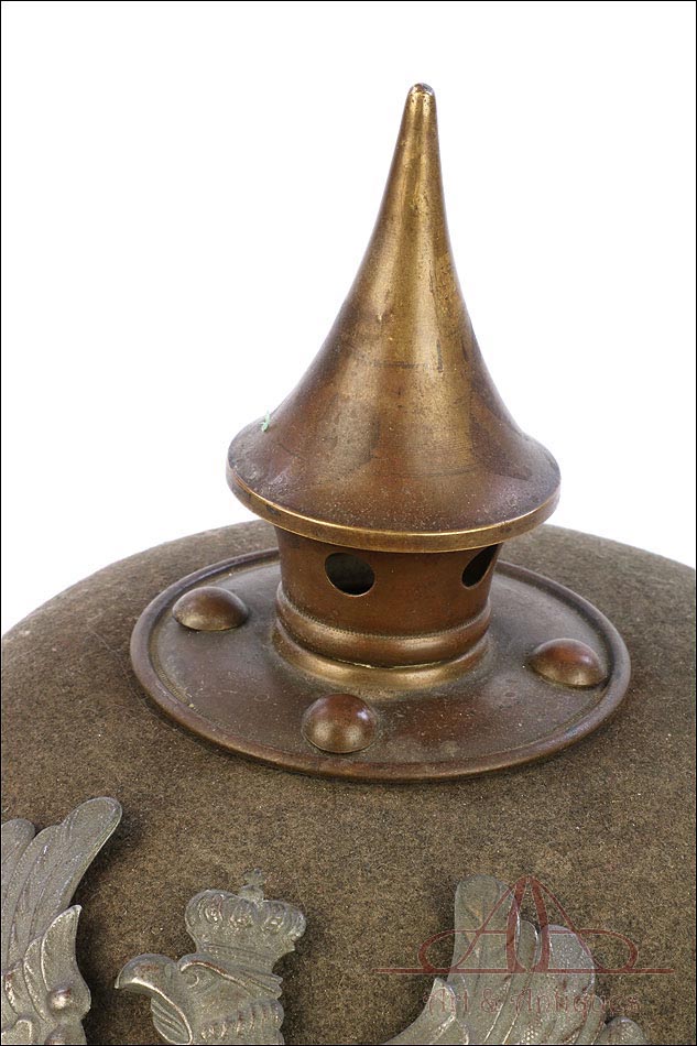 Exclusivo y cien por cien original de época, este casco Pickelhaube Ersatz de fieltro del Ejército Imperial prusiano está destinado a pertenecer a una gran colección de antigüedades militares.