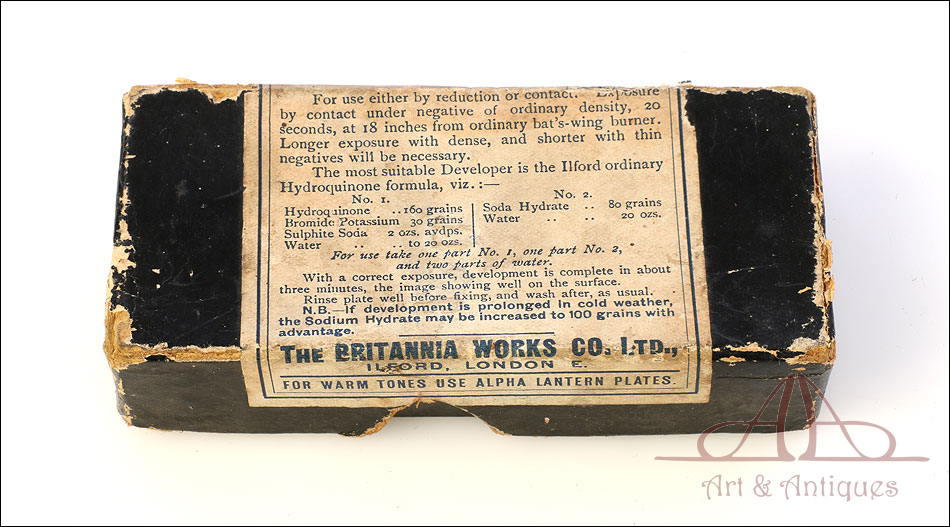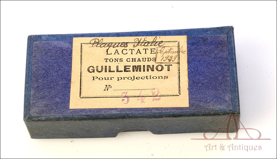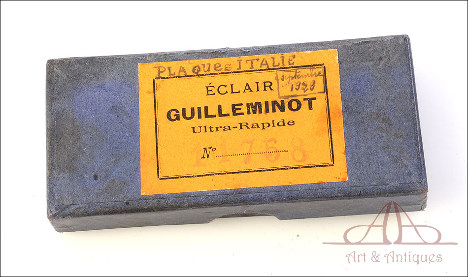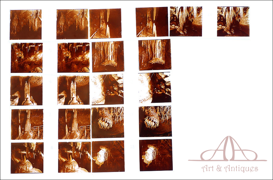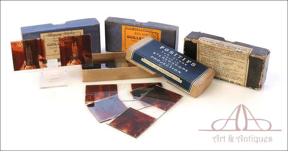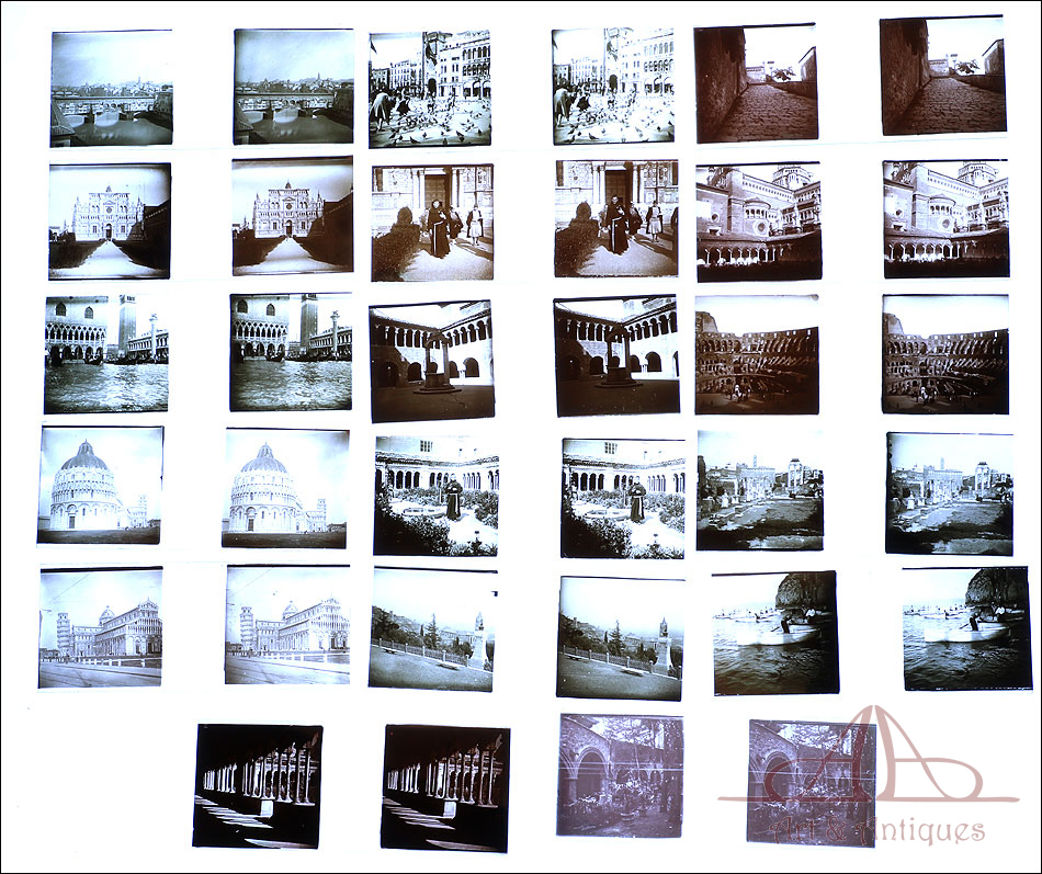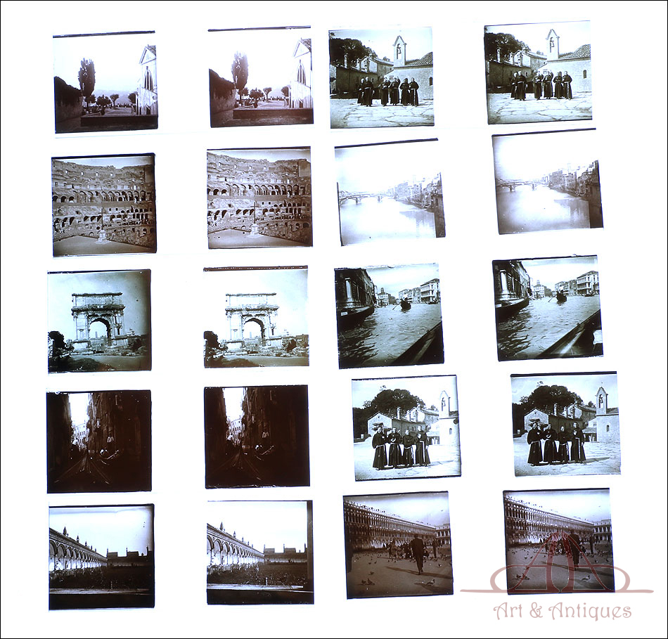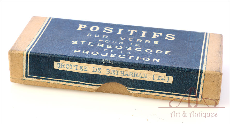 Antigua colección de 57 fotografías estereoscópicas de 45x107 mm procedente de Francia y realizadas circa 1920. Este compendio de imágenes sobre placas de vidrio se presenta en sus cajas de cartón originales, con las etiquetas correspondientes e inscripciones en francés indicando el contenido. Una de las cajas lleva una etiqueta mecanografiada con la inscripción Grottes de Betharram (las Grutas de Bétharram, situadas en Francia): se trata de una serie de placas con imágenes de las cuevas, probablemente adquirida durante un viaje. El resto de las imágenes son de índole privada; en dos de las cajas podemos ver la inscripción “Plaques Italie – Septembre 1929” escrita a mano en las cajas. Estas fotografías reproducen imágenes de lugares emblemáticos como el Coliseo de Roma o los canales de Venecia, pero también incluyen escenas más personales (un hombre posando o un perro en un campo, entre otras). Todas las placas están en excelentes condiciones.