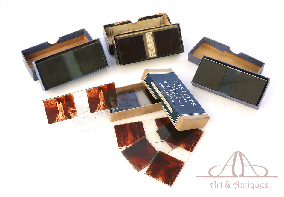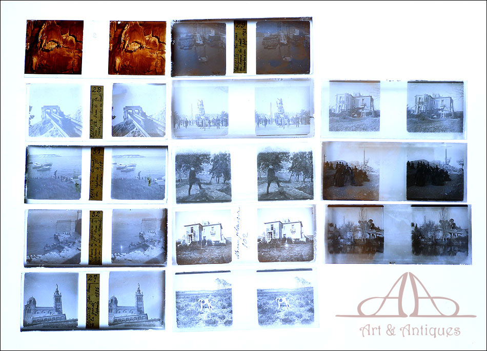 Los amantes de la fotografía antigua apreciarán sin duda esta completa colección de 57 fotografías estereoscópicas de 43x107 mm, llena de encanto y nostalgia.