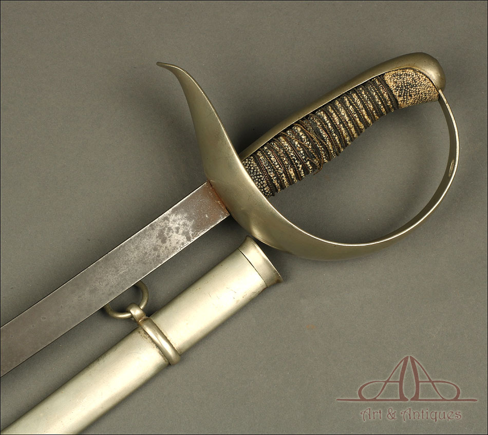 Antigua espada o sable para oficial de infantería modelo 1877, fabricado en España y fechado en 1896. Esta magnífica arma de más de 140 años de antigüedad ha llegado a nosotros en muy buenas condiciones. Se presenta con su vaina de acero original, creando un conjunto tan atractivo como auténtico. La espada lleva hoja de acero con la marca FABA. DE TOLEDO 1896, perfectamente legible. La empuñadura está formada por un puño de madera recubierto con la lija y el torzal originales, ambos en buenas condiciones. Incluye un guardamano de acero curvado, liso y muy elegante. La vaina de acero es totalmente lisa y está magníficamente conservada, sin rastros de óxido o deterioro y con la anilla original que servía para colgar la espada del uniforme.