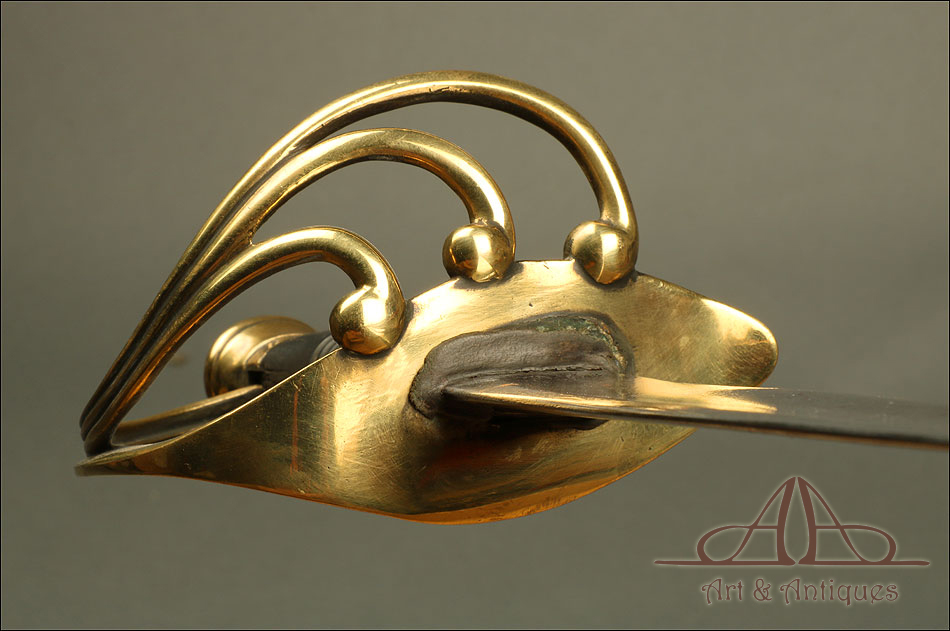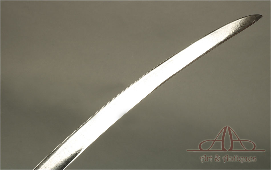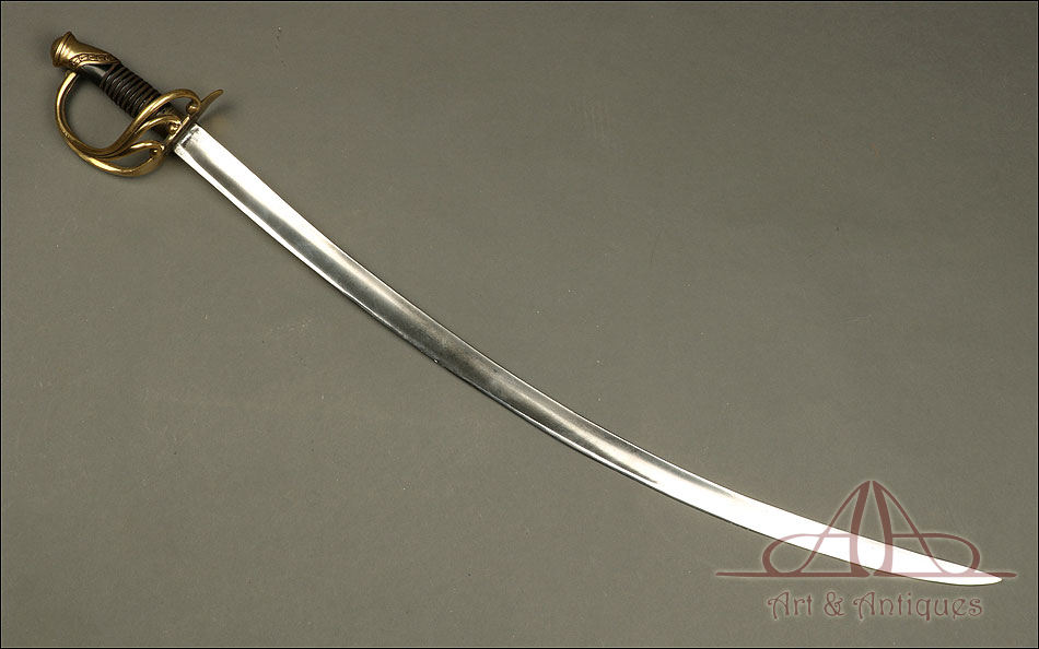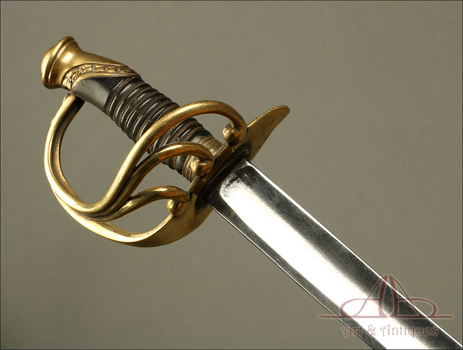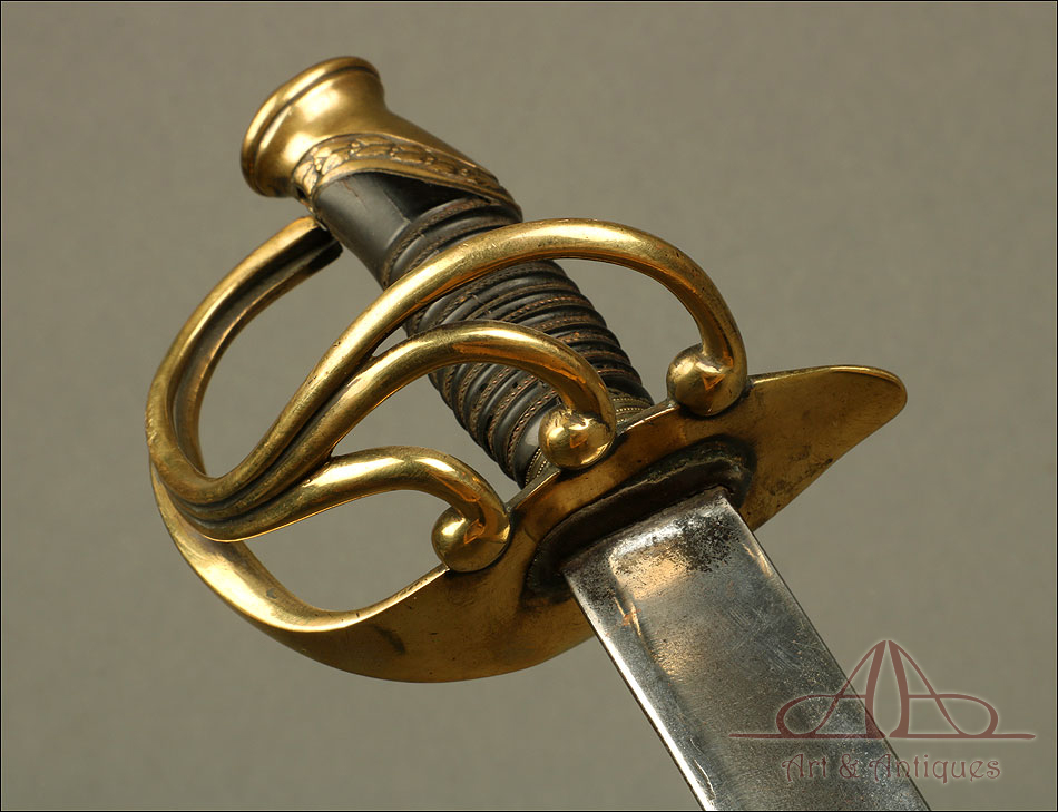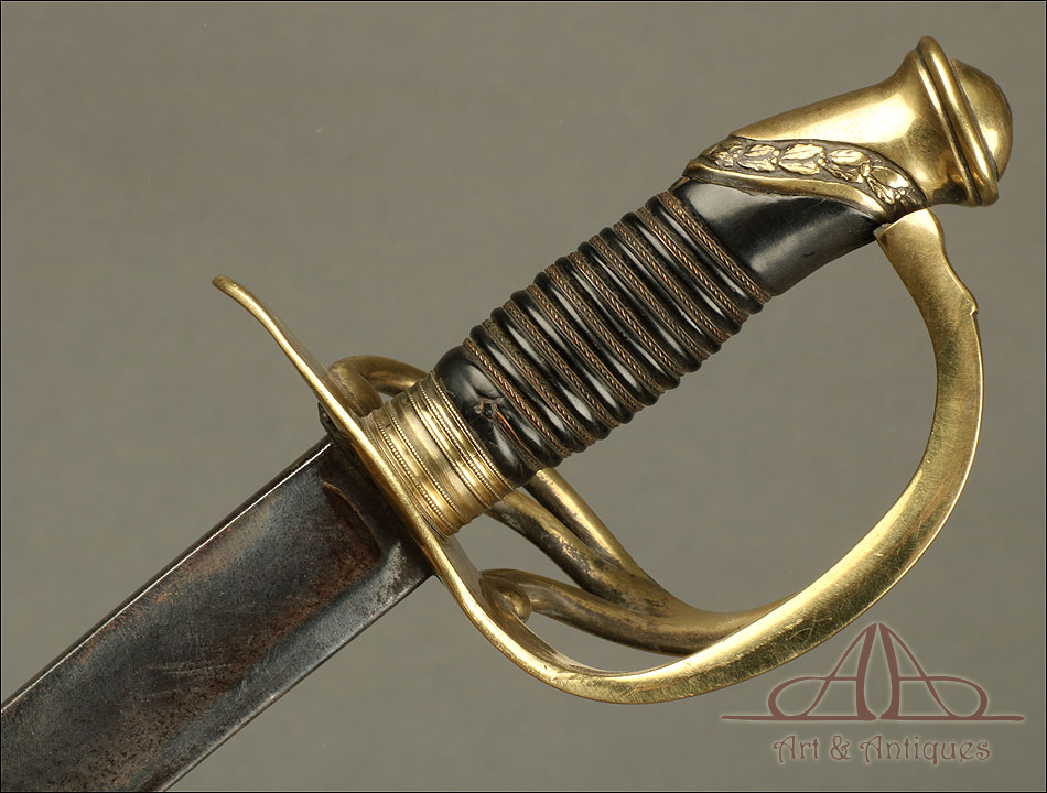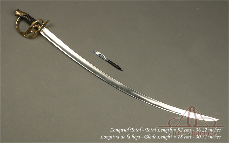 Antiguo sable de oficial de artillería hecho en España hacia 1842, en excelente estado de conservación. Se trata de un arma relativamente rara; según el tratado ‘Espadas Españolas Militares y Civiles del Siglo XVI al XX’, se piensa que “este sable cubrió de alguna manera el vacío que sufrieron los oficiales artilleros hasta la llegada en 1862 de su primer modelo reglamentario, puesto que el modelo que apareció en 1855 fue destinado exclusivamente a la brigada de artillería a caballo." El sable destaca por su belleza, especialmente en el diseño de la empuñadura, y por su impresionante estado de conservación. La hoja es de acero y se muestra pulida y brillante, mientras que la empuñadura lleva un guardamano de latón en magníficas condiciones. El guardamano se divide en tres gavilanes que se unen con la cruz, creando un precioso diseño. El puño conserva el revestimiento de cuero marrón oscuro y el tozal original en un estado casi impecable.
