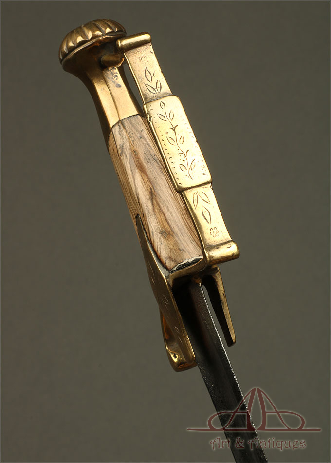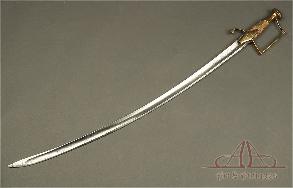 Raro y antiguo sable de oficial de infantería o de la milicia nacional, forjado hacia 1815 en España. El sable conserva todas sus partes salvo la madera del puño, que fue sustituida en algún momento del pasado. La función de esta arma no está muy clara y pudo haber pertenecido a distintos cuerpos militares. Según el libro tratado ‘Espadas Españolas Militares y Civiles del Siglo XVI al XX’, “la exacta clasificación del arma representada en esta página es todo un reto. Su talle y su estructura nos inclinan a decidirnos por la caballería, sin poder renunciar a un eventual empleo por un oficial de infantería e incluso de la milicia nacional, que todo pudo ser posible en este tipo de sables”. Durante la época en la que fue forjado, en las primeras décadas del siglo XIX, en España la reglamentación de las espadas aún no estaba perfectamente definida. El diseño de la empuñadura es sencillo y original: consta de pomo, guardamano, gavilán y cruz de latón y está decorado con una delicada flor grabada a mano en la cruz.
