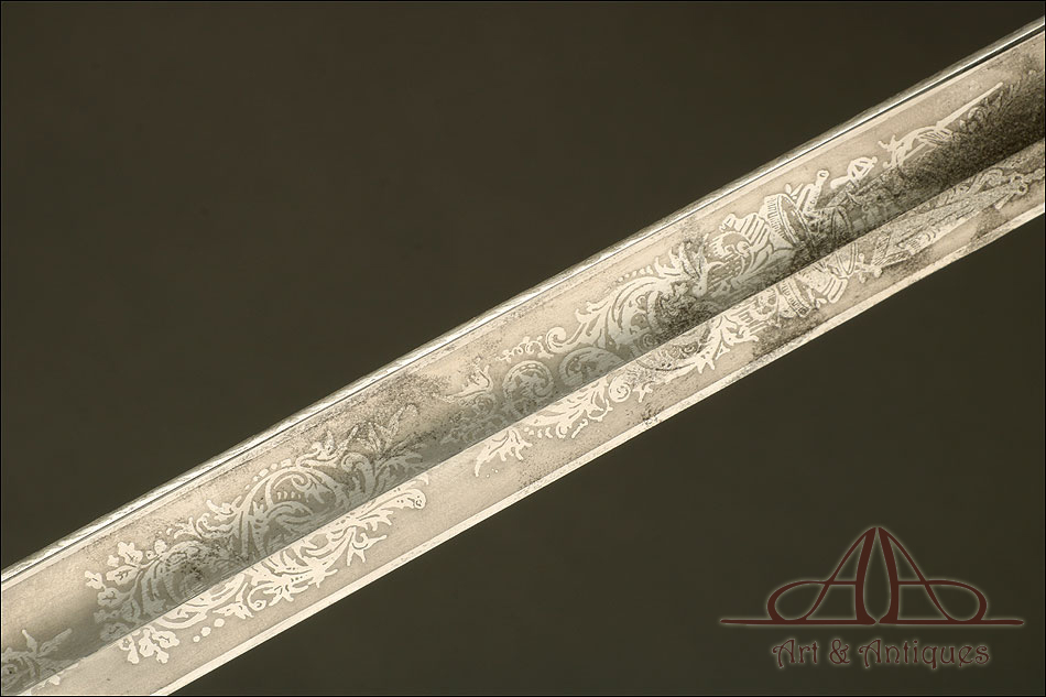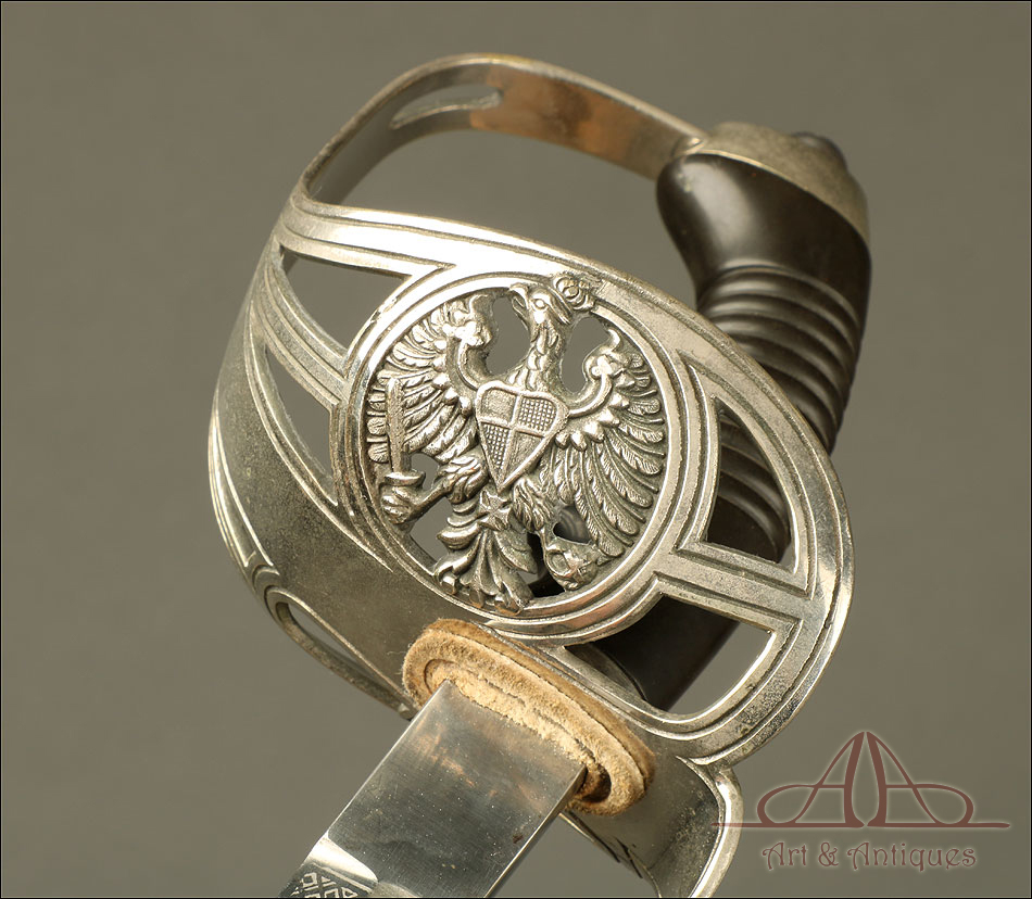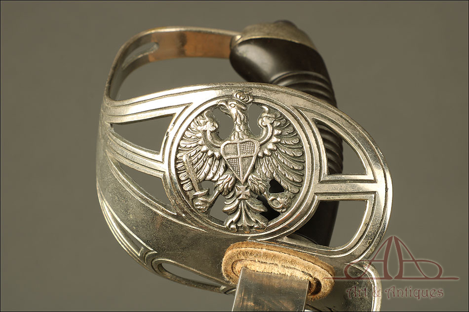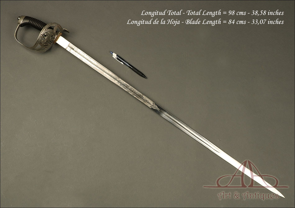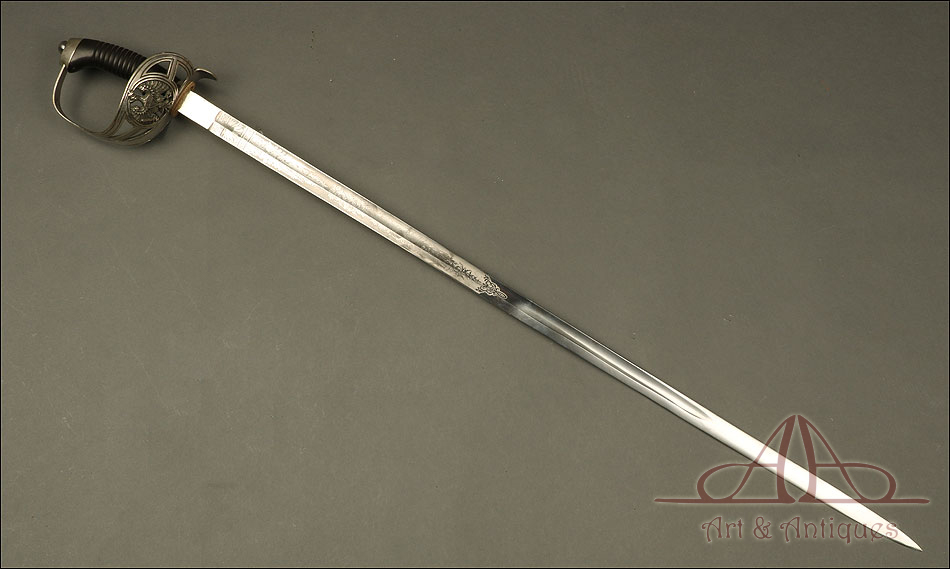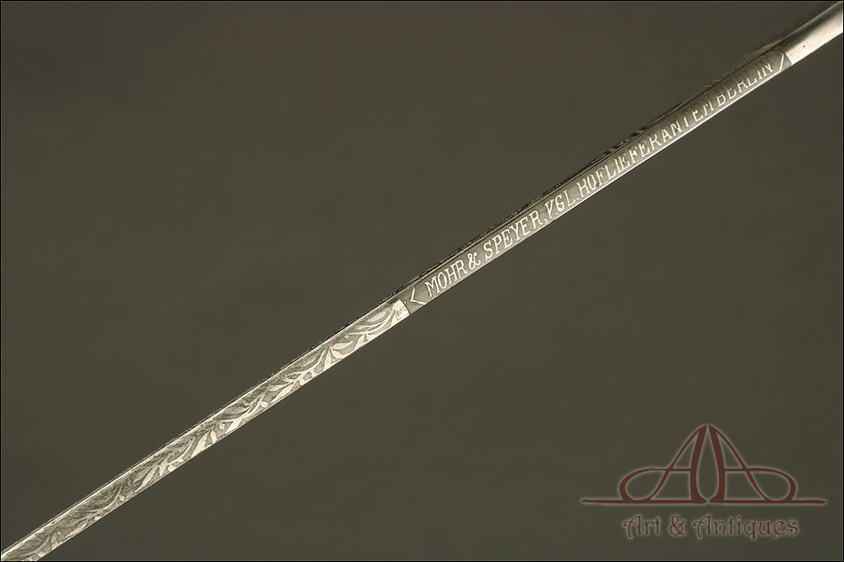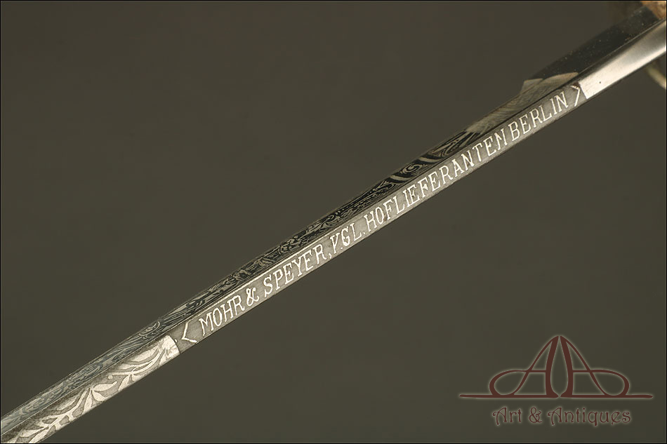 Impresionante espada prusiana para tropa de caballería modelo 1889, forjada en Berlín (Alemania) y en excelente estado de conservación. Esta arma destaca por su belleza y la calidad de su decoración, tanto en la hoja como en la empuñadura. La hoja de acero se conserva en magníficas condiciones y lleva una serie de motivos grabados al ácido. Podemos ver símbolos militares y cenefas simétricas, todos ellos en buen estado. El lomo lleva la misma decoración; entre los motivos encontramos la inscripción MOHR & SPEYER, V.G.L HOLFLIEFERANTEN BERLIN, con el nombre de la fábrica donde se forjó el sable. La empuñadura lleva guardamano de acero, con el águila prusiana grabada en celosía en la cazoleta. El puño es de madera maciza oscura, con gallones tallados a mano.