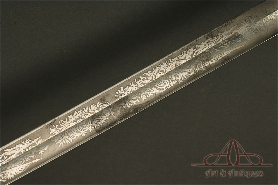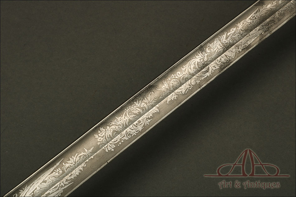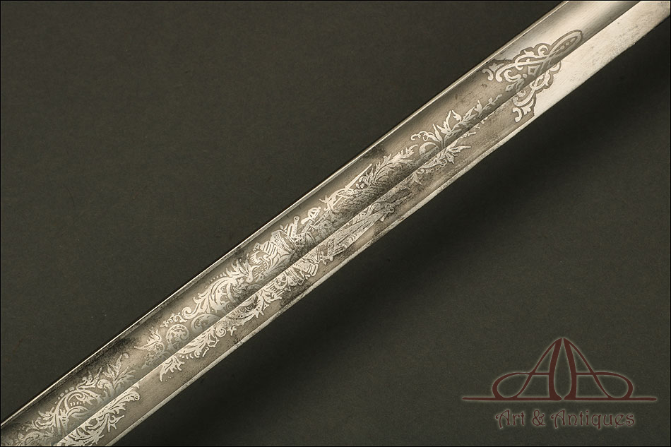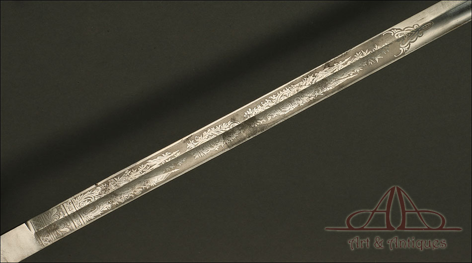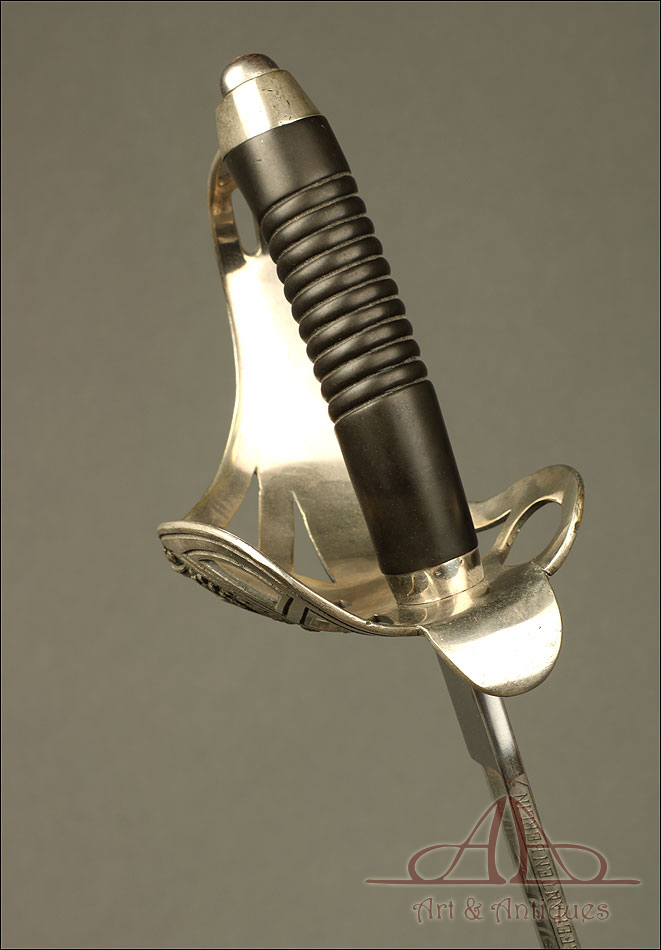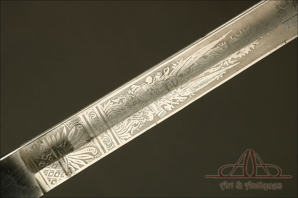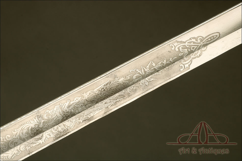 Impresionante espada prusiana para tropa de caballería modelo 1889, forjada en Berlín (Alemania) y en excelente estado de conservación. Esta arma destaca por su belleza y la calidad de su decoración, tanto en la hoja como en la empuñadura. La hoja de acero se conserva en magníficas condiciones y lleva una serie de motivos grabados al ácido. Podemos ver símbolos militares y cenefas simétricas, todos ellos en buen estado. El lomo lleva la misma decoración; entre los motivos encontramos la inscripción MOHR & SPEYER, V.G.L HOLFLIEFERANTEN BERLIN, con el nombre de la fábrica donde se forjó el sable. La empuñadura lleva guardamano de acero, con el águila prusiana grabada en celosía en la cazoleta. El puño es de madera maciza oscura, con gallones tallados a mano.