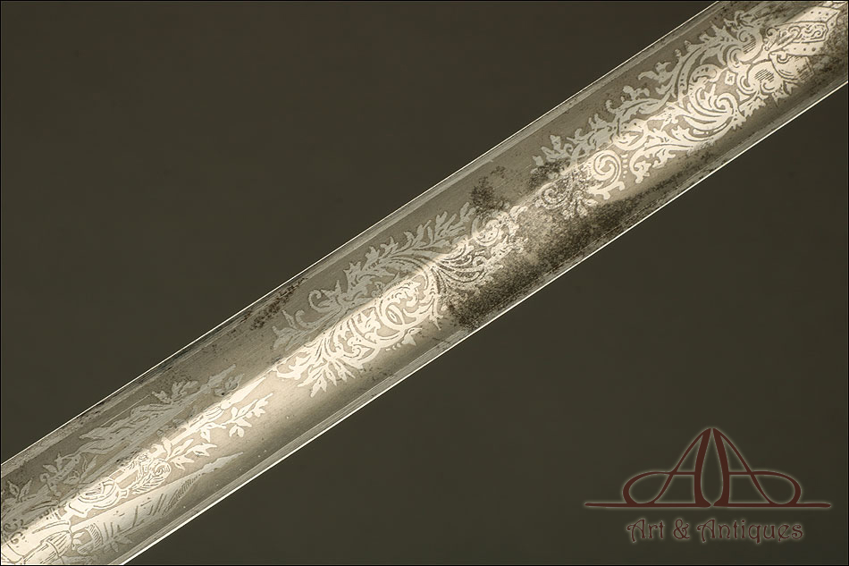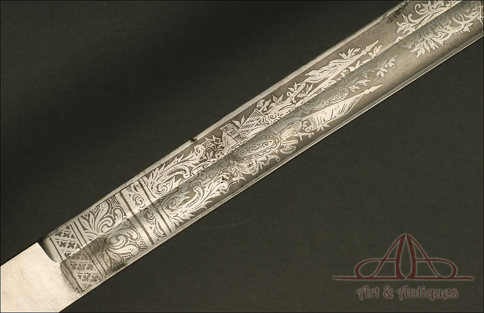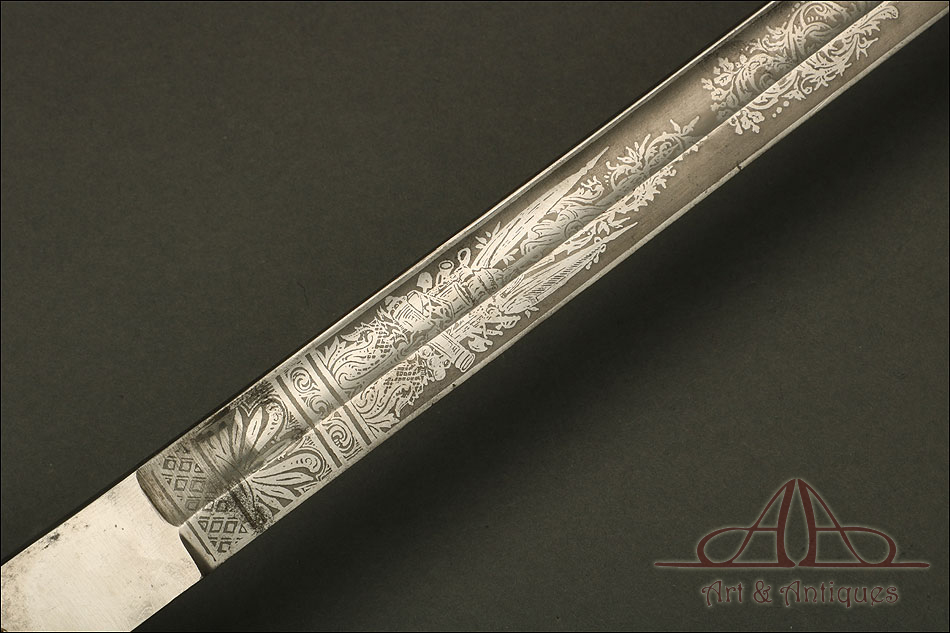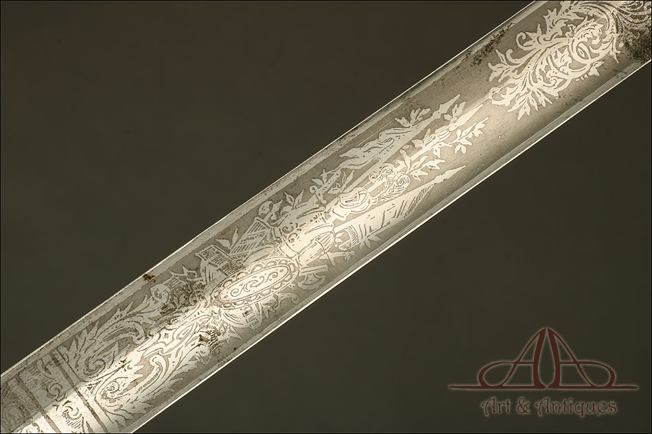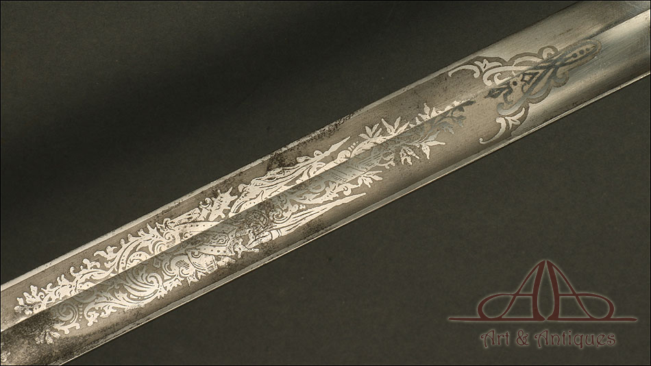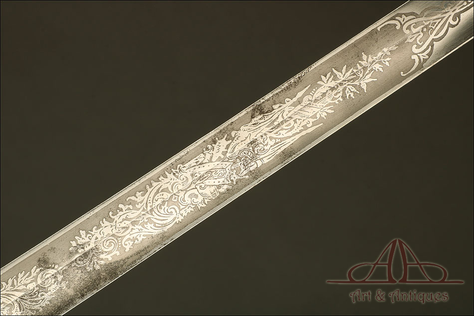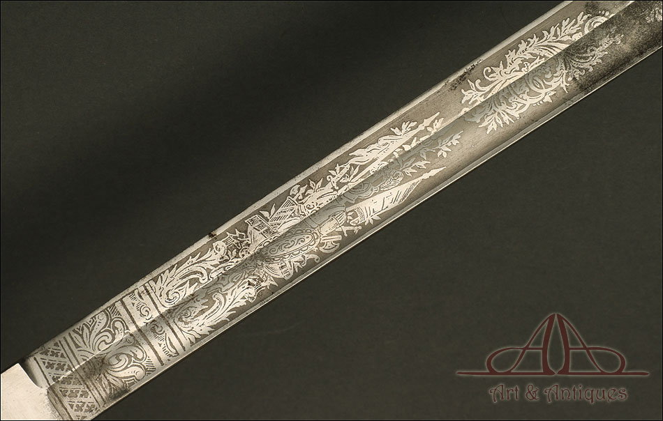 Impresionante espada prusiana para tropa de caballería modelo 1889, forjada en Berlín (Alemania) y en excelente estado de conservación. Esta arma destaca por su belleza y la calidad de su decoración, tanto en la hoja como en la empuñadura. La hoja de acero se conserva en magníficas condiciones y lleva una serie de motivos grabados al ácido. Podemos ver símbolos militares y cenefas simétricas, todos ellos en buen estado. El lomo lleva la misma decoración; entre los motivos encontramos la inscripción MOHR & SPEYER, V.G.L HOLFLIEFERANTEN BERLIN, con el nombre de la fábrica donde se forjó el sable. La empuñadura lleva guardamano de acero, con el águila prusiana grabada en celosía en la cazoleta. El puño es de madera maciza oscura, con gallones tallados a mano.