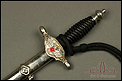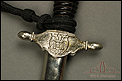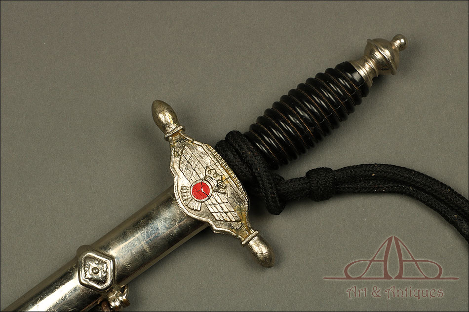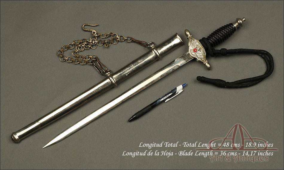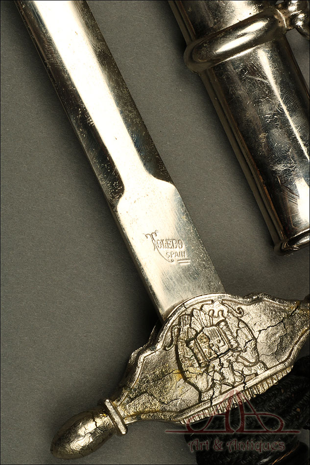 Daga de suboficial de aviación española vintage, modelo 1946, de la época de Franco. Se trata de un arma auténtica, original de época y muy bien conservada. Se presenta con su vaina de acero y la cadena para colgarla de los arreos. La cruz está completa aunque muestra una serie de grietas, causadas por la inestabilidad de la aleación con la que se fabricó. Es un desperfecto habitual en muchas piezas de la época. En la cara anterior, la cruz muestra el emblema del cuerpo de aviación con el centro esmaltado en color rojo; en la posterior podemos ver el escudo preconstitucional. La hoja es de acero y esta magníficamente conservada, sin rastros de deterioro. En la parte superior se encuentra el sello de la Fábrica de Toledo, claramente grabada en el metal. La empuñadura de la daga es de madera ebonizada y conserva el torzal original y el cordón.