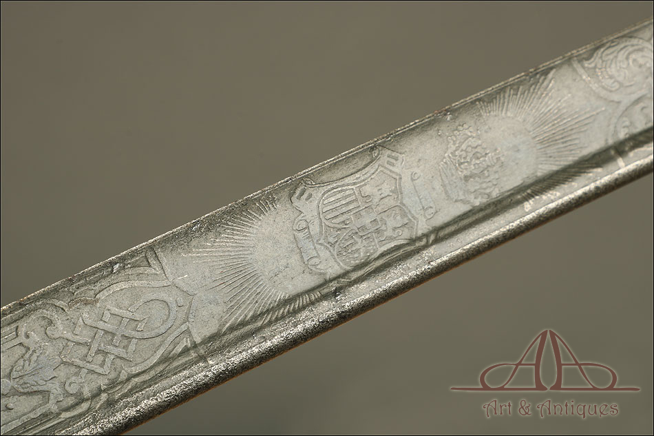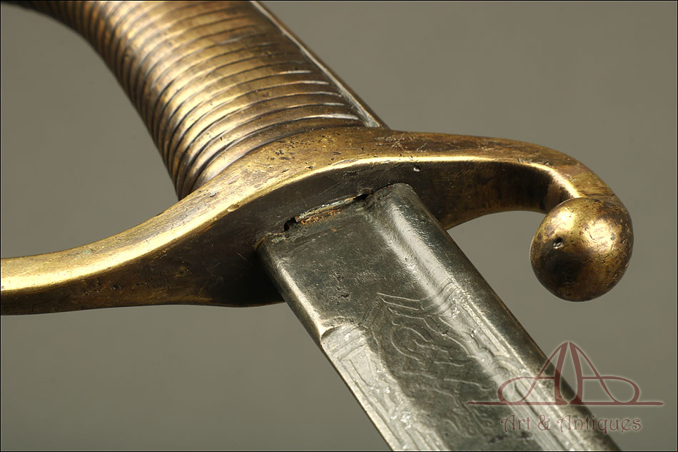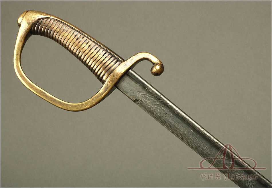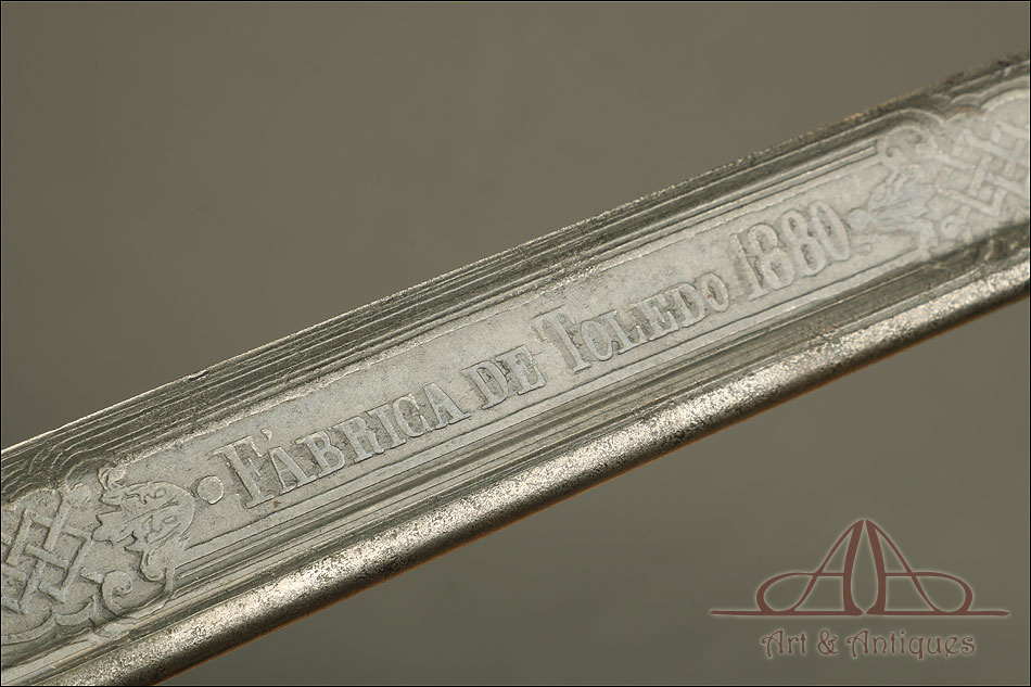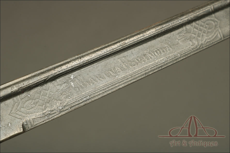 Magnífico sable briquet español modelo 1879 convertido en sable de abordaje. El sable está fechado en 1880 y se encuentra en muy buenas condiciones. La empuñadura es la clásica de los briquets (sables de origen francés posteriormente adoptados por el ejército español), actualmente porta una hoja de oficial de la marina española. De hecho, entre la decoración grabada en el acero podemos ver la inscripción MARINA ESPAÑOLA en una de sus caras. También aparece el escudo monárquico y la leyenda FÁBRICA DE TOLEDO 1880. La hoja de acero lleva acabado pavonado en negro, un efecto que se aplicaba al acero para evitar los reflejos de la luz. La empuñadura de latón está realizada en una sola pieza y destaca por su sencillez y funcionalidad, encontrándose además en perfecto estado de conservación.